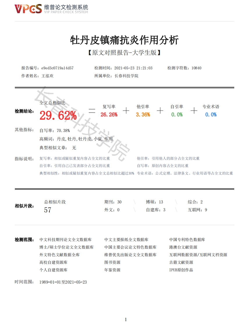 维普论文检测系统VIP PAPER CHECK SYSTEM牡丹皮镇痛抗炎作用分析【原文对照报告-大学生版】报告编号:e9ed3c0719a14d57检测时间:2021-05-2321:21:03检测字符数:10840作者姓名:王泓欢所属单位:长春科技学院全文总相似比复写率他引率自引率专业术语检测结论:29.62%26.26%3.36%0.0%0.0%其他指标:自写率:70.38%高频词:丹皮,牡丹,牡丹皮,小鼠,作用典型相似文章:无指标说明:复写率:相似或疑似重复内容占全文的比重他引率:引用他人的部分占全文的比重自引率:引用自己已发表部分占全文的比重自写率:原创内容占全文的比重典型相似性:相似或疑似重复内容占全文总相似比超过30%专业术语:公式定理、法律条文、行业用语等占全文的比重总相似片段期刊:30博硕:13综合:2相似片段:57外文:0自建库:3互联网:9检测范围:中文科技期刊论文全文数据库中文主要报纸全文数据库中国专利特色数据库博士/硕士学位论文全文数据库中国主要会议论文特色数据库港澳台文献资源外文特色文献数据全库维普优先出版论文全文数据库互联网数据资源/互联网文档资源高校自建资源库图书资源古籍文献资源个人自建资源库年鉴资源IPUB原创作品时间范围:1989-01-01至2021-05-23维普论文检测系统VIP PAPER CHECK SYSTEM原文对照颜色标注说明:■自写片段■复写片段(相似或疑似重复)口引用片段(引用)■专业术语(公式定理、法律条文、行业用语等)编号:2021100801203CHANGCHUN SCI-TECH UNIVERSITY本科毕业设计(论文)牡丹皮镇痛抗炎作用分析Analgesic and Anti inflammatory Effects of Cortex Moutan姓名王泓欢学院医药学院专业中药学班级二班学号1802170203指导教师李冰实验师202105月31年日学位论文原创性声明本人郑重声明:所呈交的论文(设计)是本人在导师的指导下独立完成的成果(作品)。除了文中特别加以标注引用的内容外,本论文不包含任何其他个人或集体已经发表或撰写的成果作品。本人完全意识到本声明的法律后果由本人承担。作者签名:年月日学位论文版权使用授权书本学位论文作者完全了解学校有关保障、使用学位论文的规定,同意学校保留并向有关学位论文管理部门或机2维普论文检测系统VIP PAPER CHECK SYSTEM构送交论文(设计)的复印件和电子版,允许论文(设计)被查阅和借阅。本人授权学校将本学位论文(设计)的全部或部分内容编入有关数据库进行检索,可以采用影印、缩印或扫描等复制手段保存和汇编本学位论文。同意学校向国家有关部门或机构送交论文(设计)复印件和电子版。(保密的学位论文在解密后适用本授权说明)作者签名:年月日导师签名:年月日牡丹皮镇痛抗炎作用分析摘要目的本实验旨在研究牡丹皮的镇痛及抗炎作用。方法通过热板法以及醋酸扭体法来研究牡丹皮对小鼠的镇痛作用:通过观察小鼠腹腔毛细血管通透性变化和二甲苯所致耳廓肿胀度变化来研究牡丹皮的抗炎作用。结果实验结果表明,在60分钟至90分钟时,牡丹皮各剂量组对热板所诱导小鼠疼痛均表现出了明显止痛的作用(P<0.05):牡丹皮各剂量组均能抵抗醋酸刺激所导致的小鼠疼痛反应,使扭体次数明显减少(P<0.05):牡丹皮高、中剂量组可明显对醋酸所诱导的毛细血管通透性增高产生抑制作用(P<0.05),减少小鼠腹腔内渗出的染料量:牡丹皮高、中剂量组均可以明显降低小鼠耳廓肿胀度(P<0.05):低剂量组无显著性影响(P>0.05)。结论研究结果表明,牡丹皮具有一定的镇痛抗炎作用。、关键词:牡丹皮:镇痛:抗炎Analgesic and Anti inflammatory effects of Cortex MoutanABSTRACTPurpose The analgesic and anti-inflammatory effects of Cortex Moutan were studied in this study.Methods The analgesic effect of Cortex Moutan on mice was observed by hot plate method and aceticacid writhing method.The anti-inflammatory effect of Cortex Moutan was analyzed by the changes ofcapillary permeability and the degree of auricle swelling induced by xylene.Result The resultsshowed that the peony bark groups had significant analgesic effect on hot plate induced pain in micefrom 60 minutes to 90 minutes (P<0.05);Each dose group of Cortex Moutan could resist the painresponse induced by acetic acid and reduce the writhing times significantly (P<0.05);The high andmiddle dose groups of Cortex Moutan could significantly inhibit the increase of capillarypermeability induced by acetic acid (P<0.05),and reduce the amount of dye exudation in theabdominal cavity of mice:The high and middle dose groups of Cortex Moutan could significantlyreduce the auricle swelling of mice (P<0.05);There was no significant difference in low-dose group(P>0.05).Conclusion The results showed that Paeonia suffruticosa has analgesic and anti-inflammatory effects.Keywords:Cortex Moutan Analgesic Anti inflammatory目录第一章绪论11.1牡丹皮的产地生境、生长习性及形态特征11.2牡丹皮的化学成分11.3牡丹皮的药理作用21.4前景与展望4第二章实验内容52.1实验材料与实验动物52.2实验仪器与设备52.3实验试剂52.4实验方法5第三章实验结果73.1牡丹皮对小鼠热板反应的影响73.2牡丹皮对小鼠扭体次数的影响83.3牡丹皮对小鼠腹腔毛细血管通透性的影响93