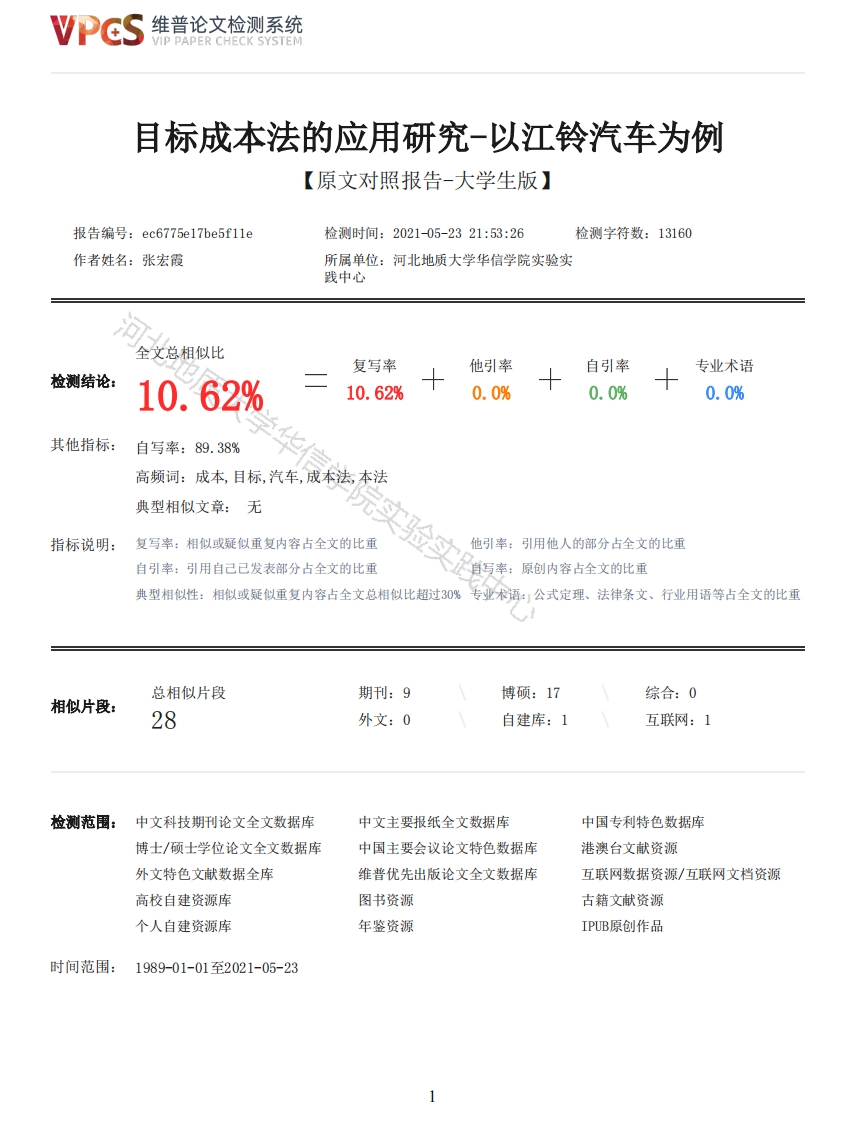 维普论文检测系统VIP PAPER CHECK SYSTEM目标成本法的应用研究-以江铃汽车为例【原文对照报告-大学生版】报告编号:ec6775e17be5f11e检测时间:2021-05-2321:53:26检测字符数:13160作者姓名:张宏霞所属单位:河北地质大学华信学院实验实践中心全文总相似比复写率他引率自引率专业术语检测结论:10.62%10.62%0.0%0.0%0.0%其他指标:自写率:89.38%高频词:成本,目标,汽车,成本法,本法典型相似文章:无指标说明:复写率:相似或疑似重复内容占全文的比重他引率:引用他人的部分占全文的比重自引率:引用自己已发表部分占全文的比重自写率:原创内容占全文的比重典型相似性:相似或疑似重复内容占全文总相似比超过30%专业术语:公式定理、法律条文、行业用语等占全文的比重总相似片段期刊:9博硕:17综合:0相似片段:28外文:0自建库:1互联网:1检测范围:中文科技期刊论文全文数据库中文主要报纸全文数据库中国专利特色数据库博士/硕士学位论文全文数据库中国主要会议论文特色数据库港澳台文献资源外文特色文献数据全库维普优先出版论文全文数据库互联网数据资源/互联网文档资源高校自建资源库图书资源古籍文献资源个人自建资源库年鉴资源IPUB原创作品时间范围:1989-01-01至2021-05-23维普论文检测系统VIP PAPER CHECK SYSTEM原文对照颜色标注说明:■自写片段■复写片段(相似或疑似重复)口引用片段(引用)■专业术语(公式定理、法律条文、行业用语等)学士学位论文目标成本法应用研究-以江铃汽车为例姓名张宏霞学号417417180814院系会计系院实验实践中心专业会计学指导教师韩志霞二O二一年五月三十日学位论文原创性声明本人所提交的学位论文《目标成本法应用研究-以江铃汽车为例》,是在导师的指导下,独立进行研究工作所取得的原创性成果。除文中已经注明引用的内容外,本论文不包含任何其他个人或集体已经发表或撰写过的研究成果。对本文的研究做出重要贡献的个人和集体,均已在文中标明。本声明的法律后果由本人承担。论文作者(签名):指导教师确认(签名):年月日年月日学位论文版权使用授权书本学位论文作者完全了解河北地质大学华信学院有权保留并向国家有关部门或机构送交学位论文的复印件和磁盘,允许论文被查阅和借阅。本人授权河北地质大学华信学院可以将学位论文的全部或部分内容编入有关数据库进行检索,可以采用影印、缩印或其它复制手段保存、汇编学位论文。保密的学位论文在年解密后适用本授权书。论文作者(签名):指导教师(签名):年月日年月日摘要首先,本文简单的介绍了有关目标成本法的相关基本理论,并且详细的分析了目标成本的特点及具体步骤,同时以江铃汽车目标成本法运用流程进行具体分析。其次,通过分析江铃汽车目前使用目标成本的情况,总结出使用目标成本法的欠缺之处。然后针对江铃汽车存在的成本管理问题进行分析,最后对江铃公司提出改进建议。目标成本法不仅可以帮助企业完善自身经营管理模式,而且可以有效分析当前企业目标成本管理存在的问题:2维普论文检测系统VIP PAPER CHECK SYSTEM在汽车价格下降的情况下,通过控制成本使企业保持持续稳定的发展,具有现实广泛发展意义。关键词:目标成本法:汽车制造业:研发费用:政策法规ABSTRACTFirst of all,this paper briefly introduces the relevant basic theories of the target costmethod,and analyzes the characteristics and specific steps of the target cost in detail.At thesame time,it makes a specific analysis with the application process of the target cost method ofJangling Automobile.Secondly,through the analysis of Jangling Automobile's current use of targetcost,summed up the shortcomings of the target cost method.Then the cost management problems ofJangling Automobile are analyzed.Finally,suggestions for improvement are put forward.Target cost method can not only help enterprises improve their own management mode,but also caneffectively analyze the current enterprise target cost management problems;In the case of thedecline of automobile prices,it is of practical significance to maintain the sustainable and stabledevelopment of enterprises through cost control.Key words:Target cost method;Automobile manufacturing:Research and development costs;Policies and regulations目录第1章目标成本法相关理论11.1目标成本法的概念11.2目标成本法的主要功能特点11.3目标成本法应用流程11.3.1目标成本的设定11.3.2目标成本的分解21.3.3目标成本的实施21.3.4目标成本的分析和考核2学华信学院实验实践中心第2章目标成本的应用现状分析32.1江铃汽车的基本情况32.2江铃汽车运用目标成本法现状分析32.2.1目标成本的设定42.2.2目标成本的分解52.2.3目标成本的实施62.2.4目标成本的分析和考核8第3章江铃汽车运用目标成本法存在的问题103.1成本管控体系不够完善103.2研发人才培养机制不健全103.3成本控制方法单一11第4章江铃汽车运用目标成本法的优化建议134.1了解自身竞争水平,熟悉政策法规134.2缩短产品开发周期,储备高质量人才134.3引入作业成本法,完善成本管控制度13结论15参考文献16致谢17第1章目标成本法相关理论1.1目标成本法的概念目标成本法是对成本的控制重心从传统的生产过程的控制提前到对产品的开发与设计阶段,使成本管控的节点前移至业务的开头,换而言之,产品开发设计阶段包括设计、采购、生产、销售,以计算出产品成本,同时需要企3