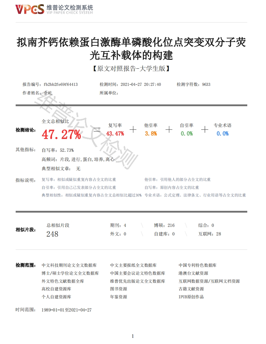 维普论文检测系统/IP PAPER CHECK SYSTEM拟南芥钙依赖蛋白激酶单磷酸化位点突变双分子荧光互补载体的构建【原文对照报告-大学生版】报告编号:fb2bb2fe69f64413检测时间:2021-04-2720:27:40检测字符数:9633作者姓名:余屹所属单位:全文总相似比复写率他引率自引率专业术语检测结论:47.27%43.47%3.8%0.0%0.0%其他指标:自写率:52.73%高频词:片段,进行,蛋白,培养,离心典型相似文章:无指标说明:复写率:相似或疑似重复内容占全文的比重他引率:引用他人的部分占全文的比重自引率:引用自己已发表部分占全文的比重自写率:原创内容占全文的比重典型相似性:相似或疑似重复内容占全文总相似比超过30%专业术语:公式定理、法律条文、行业用语等占全文的比重总相似片段期刊:4博硕:216综合:0相似片段:248外文:0自建库:0互联网:28检测范围:中文科技期刊论文全文数据库中文主要报纸全文数据库中国专利特色数据库博士/硕士学位论文全文数据库中国主要会议论文特色数据库港澳台文献资源外文特色文献数据全库维普优先出版论文全文数据库互联网数据资源/互联网文档资源高校自建资源库图书资源古籍文献资源个人自建资源库年鉴资源IPUB原创作品时间范围:1989-01-01至2021-04-27维普论文检测系统VIP PAPER CHECK SYSTEM原文对照颜色标注说明:■自写片段■复写片段(相似或疑似重复)口引用片段(引用)■专业术语(公式定理、法律条文、行业用语等)编号:17541240523南阳师范学院2021届毕业生毕业论文(设计)突变双分子荧光互补载体的构建完成人:余屹班级:2017-05学制:4年专业:生物工程指导教师:王鹏完成日期:2021-04-20目录摘要(1)0引言(1)1材料与方法(1)1.实验材料(1)1.1.1菌株与载体(1)1.1.2实验仪器及用具(1)1.1.3工具酶、试剂盒与生化试剂(2)1.1.4常用培养基和溶液的配制(2)1.2实验过程与方法(3)1.2.1质粒的提取(3)1.2.2大肠杆菌感受态细胞的制备(4)1.2.3PCR扩增突变片段(4)1.2.4琼脂糖凝胶配置(5)1.2.5目的片段酶切与载体连接(⑤)1.2.6胶▣收提纯步骤(6)1.2.7连接产物转化大肠杆菌感受态细胞(7)1.2.8挑取单克隆进行菌落PCR检测(8)2结果与分析(⑧)2.1PCR扩增目的片段(8)2维普论文检测系统VIP PAPER CHECK SYSTEM2.2转化大肠杆菌与菌落PCR鉴定(10)2.3酶切与检测(11)3讨论(12)3.1钙依赖蛋白激酶CDPK(12)3.2双分子荧光互补技术(12)参考文献(12)Abstract(13)拟南芥钙依赖蛋白激酶单磷酸化位点突变双分子荧光互补载体的构建作者:余屹指导老师:王鹏摘要:将含有PGADT?7-CPK4重组载体的E.coli DH5a的菌液进行质粒提取,利用设计好的突变引物,通过聚合酶链式反应(P℃R)的方法获得目的片段,再用琼脂糖凝胶电泳的方法对目的片段进行检测,接着将目的片段进行回收、酶切与连接。再将连接产物转化至大肠杆菌感受态细胞中,涂布于含有卡那抗性的培养基中培养过夜进行阳性克隆筛选,挑选阳性克隆进行菌落PC鉴定和测序。结果表明:成功构建了拟南芥钙依赖蛋白激酶单磷酸化位点突变双分子荧光互补载体pSPYCE-CPK4N3)。关键词:载体构建;基因突变:PCR:凝胶电泳;酶切0引言Ca2+是植物中重要的第二信使,在植物的新陈代谢和生长发育过程中都发挥着重要的作用[11]。蛋白激酶(protein kinases,简称K)包括蛋白激酶A、蛋白激酶C、蛋白激酶G和钙调蛋白的蛋白激酶,其作用主要是催化蛋白质磷酸化。从ATP中转移的磷酸由蛋白激酶催化,被催化后的磷酸与蛋白质分子中氨基酸残基上的羟基发生共价结合,而达到蛋白质和酶构相和活性发生改变的效果。钙依赖型蛋白激酶(CDK)属于钙调蛋白类的蛋白激酶,是植物中一种特殊的蛋白激酶,对植物的抗逆性起着重要作用。CDPK的表达改变可被部分植物激素例如生长素(IAA)和脱落酸(ABA)等诱导。而CPK4也参与组成钙依赖性蛋白激酶家族并且起着重要作用,也具有深远的研究意义。1材料与方法1.实验材料1.1.1菌株与载体含有pGADT7-CPK4重组质粒的E.coli(Escherichia coli)DH5a、设计好用于引入点突变的CPK4引物、大肠杆菌DH5a感受态、空载体PSPYCE。1.1.2实验仪器及用具-80℃超低温冰箱、4℃冰箱、-20℃低温冰箱、高压灭菌锅、4℃冷冻离心机、培养皿、漩涡震荡仪、核酸电泳槽、PCR仪、电子天平、生化培养箱、试管、恒温水浴锅、恒温摇床、小型离心机、微量移液器、超净工作台、PE管、微波炉、烧杯、量筒、锥形瓶、试管架、酒精灯、金属涂布棒、紫外照胶仪、比色皿、紫外分光光度计等。1.1.3工具酶、试剂盒与生化试剂小量质粒小提试剂盒:OMEGA Plasmid Mini Kit I、胶回收试剂盒:MOEGA Gel Extraction Kit、限制性核酸内切酶BamH I与SalI、T4DNA连接酶:T4 DNA Ligase、Ge1red核酸染料、1XTAE缓冲液、卡那青霉素Kana(在-20C保存)、胰蛋白胨、酵母提取物、琼脂糖、氯化钠等。PCR引物:设计好基因克隆与表达分析引物序列(由Sangon Biotech公司负责生产),如表1所示。表1基因克隆与表达分析引物序列NamePrimer (5'-3')CP-N3 (F)CAGACTTTGGTTTGGATGTCTTCTACAAGCCCP-N3(R)GGCTTGTAGAAGACATCCAAACCAAAGTCTGCP-YC (F)CGCGGATCCATGGAGAAACCAAACCCTAGCP-YC (R)GCGCGTCGACCTTTGGTGAATCATCAGATTTAG1.1.4常用培养基和溶液的配制3