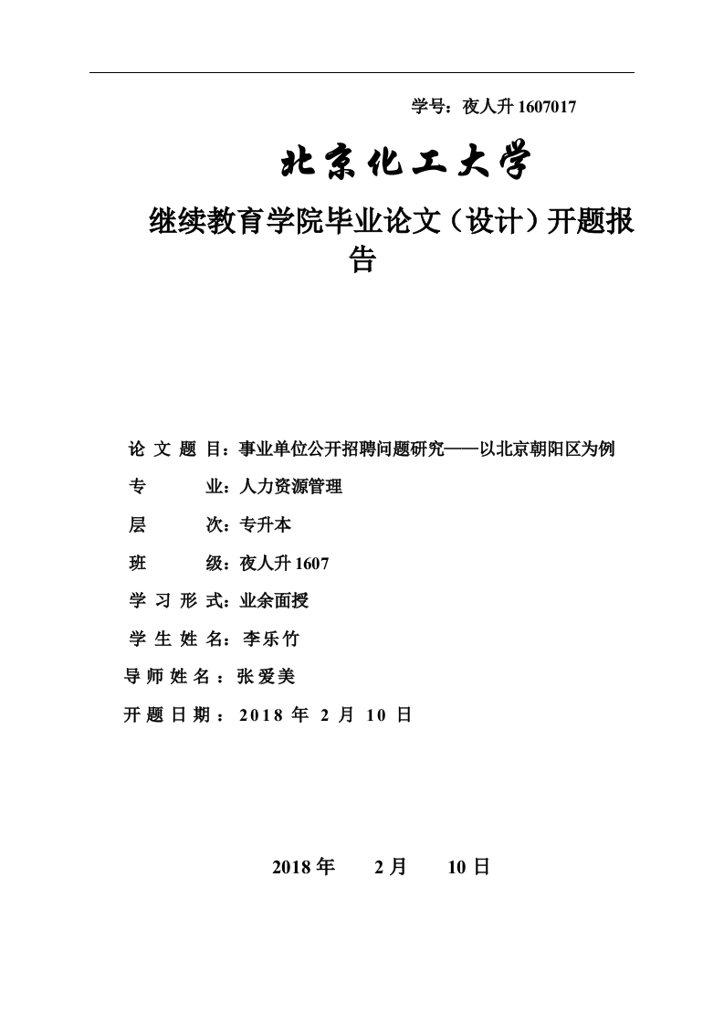 学号:夜人升1607017北京化工大学继续教育学院毕业论文(设计)开题报告论文题目:事业单位公开招聘问题研究一以北京朝阳区为例专业:人力资源管理层次:专升本班级:夜人升1607学习形式:业余面授学生姓名:李乐竹导师姓名:张爱美开题日期:2018年2月10日2018年2月10日目录一、课题来源…二、选题的性质…三、论文选题的目的和理论实践意义…四、与本选题相关的国内外研究现状,五、主要参考文献…六、分析研究的可行性、基本条件及能否取得实质性进展…七、选题的研究方法和进度安排开题报告内容一.课题来源自行命题二.选题的性质:1.理论研究(√)2.应用研究()3.应用理论研究()三.论文选题的目的和理论实践意义理论意义:事业单位公开招聘刚刚实行,因此对于事业单位公开招聘的理论研究很少。仅有的研究也只是对事业单位公开招聘中出现的问题及相应的对策做了笼统的、宽泛的论述。缺少真正深入的研究。本文通过对事业单位公开招骋问题及对策的研究,可以丰富事业单位公开招聘方面的理论研究,可以丰富事业单位人力资源管理,具有一定的理论意义。实践意义:中国的事业单位是指为社会提供公共产品和公共服务的部门,其中为社会提供服务的工作人员的素质和专业能力的高低决定了该事业单位的服务质量和大众满意度。故,对事业单位招聘人员问题的研究,有着必要的实践意义。四.与本选题相关的国内外研究现状,预计可能的研究突破和创新点(一)国外研究现状James Cliford(2015)认为职位分析是人员招募的起始点。科学合理的人力资游管理过程始于在一个职位上这个任职者所需承担的工作职责,满足该职位工作需要任职者需具备的个人特征,职位分析就是确定承担职责和所需特征的过程。GaryDessler(2016)同样认为人员招募的前提是在职位分析基础上的人员规划,科学合理的人员规划与预测是有效招募的必要保障。在明确了需要招募的职位需要补充什么样的人并形成相应的任职资格说明书后,建立相应的候选人才库,运用测试工具淘汰大多数申请者,最后通过面试做出最终选择。DonaldE.Klingner和JohnNalbandian(2017)将公共部门人员招募分为集中型、分散2