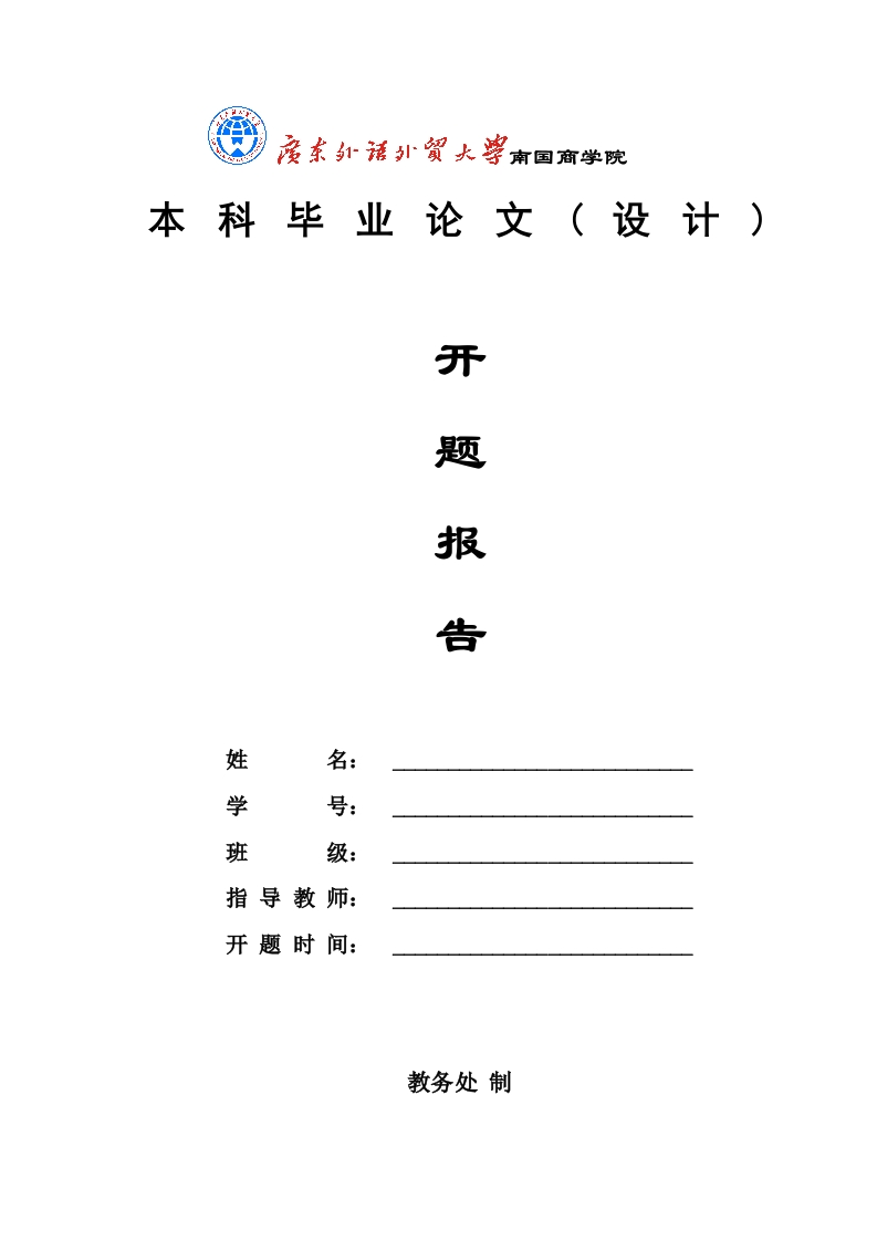 本科毕业论文(设计)开题报告学班指导教师:开题时间:教务处制毕业论文(设计)题目一、选题依据(包括目的、意义、国内外现状和发展趋势,主要参考文献)二、研究内容(具体研究/设计内容,重点解决的问题,预期结果)三、研究/设计方案(包括研究/设计方法、技术路线,理论分析、计算、实验方法和步骤及其可行性,可能出现的技术问题及解决办法)四、创新之处五、工作基础及条件毕业论文(设计)工作计划时间工作内容预期结果起止工作时间预计答辩时间指导教师意见:年月日学院意见:负责人签名(或盖章):年月日注:1,本表可根据实际所填写之内容修改行高,但页面设置不得修改。2.本表需填写处均用五号、宋体字,单倍行距,并用A4纸单面打印,无需装订。