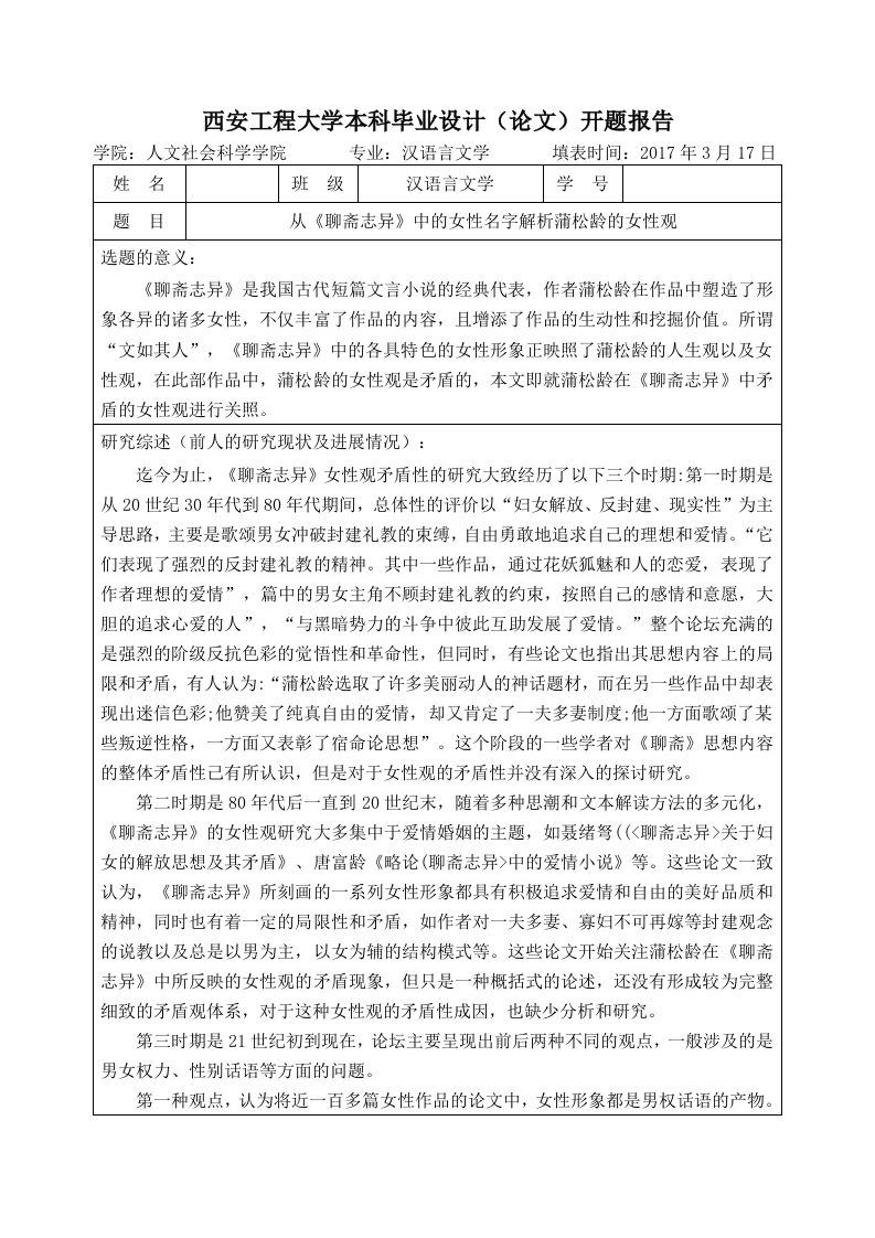 西安工程大学本科毕业设计(论文)开题报告学院:人文社会科学学院专业:汉语言文学填表时间:2017年3月17日姓名班级汉语言文学学号题从《聊斋志异》中的女性名字解析蒲松龄的女性观选题的意义:《聊斋志异》是我国古代短篇文言小说的经典代表,作者蒲松龄在作品中塑造了形象各异的诸多女性,不仅丰富了作品的内容,且增添了作品的生动性和挖掘价值。所谓“文如其人”,《聊斋志异》中的各具特色的女性形象正映照了蒲松龄的人生观以及女性观,在此部作品中,蒲松龄的女性观是矛盾的,本文即就蒲松龄在《聊斋志异》中矛盾的女性观进行关照。研究综述(前人的研究现状及进展情况):迄今为止,《聊斋志异》女性观矛盾性的研究大致经历了以下三个时期:第一时期是从20世纪30年代到80年代期间,总体性的评价以“妇女解放、反封建、现实性”为主导思路,主要是歌颂男女冲破封建礼教的束缚,自由勇敢地追求自己的理想和爱情。“它们表现了强烈的反封建礼教的精神。其中一些作品,通过花妖狐魅和人的恋爱,表现了作者理想的爱情”,篇中的男女主角不顾封建礼教的约束,按照自己的感情和意愿,大胆的追求心爱的人”,“与黑暗势力的斗争中彼此互助发展了爱情。”整个论坛充满的是强烈的阶级反抗色彩的觉悟性和革命性,但同时,有些论文也指出其思想内容上的局限和矛盾,有人认为:“蒲松龄选取了许多美丽动人的神话题材,而在另一些作品中却表现出迷信色彩:他赞美了纯真自由的爱情,却又肯定了一夫多妻制度:他一方面歌颂了某些叛逆性格,一方面又表彰了宿命论思想”。这个阶段的一些学者对《聊斋》思想内容的整体矛盾性己有所认识,但是对于女性观的矛盾性并没有深入的探讨研究。第二时期是80年代后一直到20世纪末,随着多种思潮和文本解读方法的多元化,《聊斋志异》的女性观研究大多集中于爱情婚烟的主题,如聂绪弩(<聊斋志异>关于妇女的解放思想及其矛盾》、唐富龄《略论(聊斋志异>中的爱情小说》等。这些论文一致认为,《聊斋志异》所刻画的一系列女性形象都具有积极追求爱情和自由的美好品质和精神,同时也有着一定的局限性和矛盾,如作者对一夫多妻、寡妇不可再嫁等封建观念的说教以及总是以男为主,以女为辅的结构模式等。这些论文开始关注蒲松龄在《聊斋志异》中所反映的女性观的矛盾现象,但只是一种概括式的论述,还没有形成较为完整细致的矛盾观体系,对于这种女性观的矛盾性成因,也缺少分析和研究。第三时期是21世纪初到现在,论坛主要呈现出前后两种不同的观点,一般涉及的是男女权力、性别话语等方面的问题。第一种观点,认为将近一百多篇女性作品的论文中,女性形象都是男权话语的产物。这方面的代表有李志孝《男权社会的女性生命本相一论<聊斋志异>的妇女形象》,“尽管其中体现了对女性才华的肯定和女性人格的赞美”,但是“在她们身上总是带着鲜明的男权社会的强烈印记。作者总是用男性(一个受传统思想影响很深、终生落魄的下层知识分子)的视角去观照她们,描写她们的。她们的出现或者存在,只是为了满足这个男权社会的需要而已。”还有盛志梅《男权世界的艺术写照一<聊斋志异>婚恋小说初探》中指出:“女性对男性的价值判断与理想期待和她对自身的认识与要求本质上是一致的,她们不约而同地接受了男权社会对女性附属地位的规定,把男人看作自己强大的靠山和当然的归宿。”这种观点最突出的体现在,认为女性就是为男性的需要而设置和服务的。《聊斋》对女性的态度,存在明显的双重评价标准:蒲松龄一面热情赞美女狐、女鬼们冲破束缚大胆追求个人幸福:一面又要求现实世界里的女人们服从礼教,悟守古板的理学天条。在现实世界里,妇女要遵守三从四德:在更高的理想世界里,女人可以象鬼狐一样,不受拘束、自荐枕席。但是,这两种女性形象的塑造都是为了迎合男人的两种心理欲求,尤其是贫寒之士的假想性的心理慰藉一当他们孤独寂寞之时,会有女子主动逢迎:当这些女子成为男性的妻子时,则被要求烙守道德礼教。一言以蔽之,蒲松龄试图通过对女性双重形象的刻画,来维持男性的中心地位,而这种塑造,是以牺牲女性的人格和尊严为代价的,这说明了蒲松龄的人本思想一旦触犯了理学的雷池,所表现的就只有脆弱性和妥协性了。第二种观点是对前一种观点的反拨,评论者把着眼点放在一些诸如《侠女》、((妾击贼》、((商三官》等身怀绝技的女子以及((马介甫》、((江城》、((锦瑟))等一些悍妻、妒妇的形象上,认为《聊斋》反映的是一种阴盛阳衰的思想。持这类观点的认为,很多篇目中的男子,不论外貌和作为,都显示出阴柔化和无能化,作者对男性形象的塑造不仅趋向于线条的柔媚,而且大都失去了阳刚之气和男子气概。相反,很多女性形象,不但足智多谋而且经营能干。何天杰在((<聊斋志异>情爱故事与女权意识》一文中“反对男权话语和情爱乌托邦”这一论断,认为《聊斋》情爱故事的性别基调是男性的雌化和女性的雄化:还有李文慧、王恒展在《聊斋志异研究》上所写的《论<聊斋志异)中两性角色的错位》一文提到:“她们不仅是真善美的化身。在某种程度上更成为了集美貌智慧于一身的强者形象,而《聊斋》中的男性形象则被弱化、痴化,甚至成了需要被保护的弱