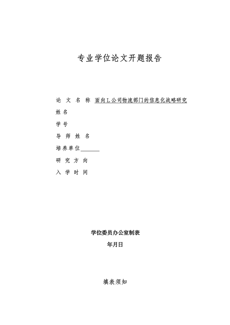 专业学位论文开题报告论文名称面向L公司物流部门的信息化战略研究姓名学号导师姓名培养单位研究方向入学时间学位委员办公室制表年月日填表须知一、填写本表前,BA学员应根据本表各部分要求写出初稿,由指导教师小组组织,在BA中心公开作专业学位论文工作的开题报告。二、参照指导教师小组意见修改初稿后正式填写本表,所填内容一经确定,一般不随意变动。三、本表各部分如不够填写,可自行加页。四、本表一式二份。下载表格电子文档填写后打印,但不得以打印后纸质粘贴的方式填写。如不够填写,可另附页。五、本表从MBA中心网站下载,并以A4纸双面打印。选题背景及研究意义(一)选题背景1.选题背景从世界范围看,自上个世纪末期以来,随着计算机和互联网技术的发展,全球企业特别是企业的物流部门不断进行信息化建设,以适应信息社会对产品和服务的要求。与世界发达国家相比,中国企业信息化进程要略慢一些,但是随着中国加入世贸组织,国家加大了推进信息化发展的力度,特别是随着移动互联网技术的成熟,企业物流部门信息化进程受到了国家和企业越来越多的重视。我过企业把工业化和信息化结合起来,不再重复发达国家先实现工业化再进入信息化的传统模式,融合了计算机、通信和信息处理技术的电子信息技术的飞速发展,以实现社会生产力的跨越式发展。近年来,移动通信在全球范围内迅猛发展,新的技术层出不穷,特别是移动通信领域的技术更是飞速发展,数字化和网络化已成为不可逆转的趋势,中国三大运营商手机用户总量近10亿,移动业务现已成为中国电信第一大业务,尤其是3G智能手机已到了井喷式的增长,使中国智能手机用户数达到4.9亿户。最新公布的2006-2020国家信息化发展战略显示,自2010年以来,企业物流部门部门在打造电子政务信息化平台方面进行了大量的投入,力求通过开发利用信息资源,充分利用信息技术,提高经济增长质量,促进信息交流和知识共享,企业物流部门信息化建设已成为势不可挡的时代潮流。随着通信技术和经济活动的提高,企业的物流部门由于承担着流通商品的重任,结合企业的战略变革,开始建设和完善企业内的信息系统,该部门的信息化成为提升企业核心竞争力的战略措施,以全面提升企业核心竞争能力,实现一流的客户服务和高效的组织运营效率,确保企业市场竞争优势和长期可持续发展。对于企业物流部门信息化,国内外目前尚没有可借鉴的成熟思路是一项错综复杂的系统工程,如何在新的形势下,通过信息化进一步增强企业的核心竞争力,提高企业物流部门的信息化管理水平,保障企业可持续健康的发展,成为当前企业应该重点关注的问题。2.国内外研究现状信息化战略是当前企业发展的必然趋势,这是国内外企业都不能回避的问题,所以,国内外学者对于这一领域的研究也较为深入,下面将对学者们的基本观点进行阐述。(1)国内研究现状柳炳祥(2009)认为信息技术是打造企业物流部门核心竞争力的利器,企业物流部门信息化建设的步伐、重点、方向应与企业的发展战略保持一致,利用信息技术,使企业的物流信息化、数据信息化,在此基础上,提高商品的流动速度,使企业拥有充分驾驭信息的能力,进而提升企业的核心竞争力。现代企业物流部门的综合管理过程也就是物流信息化技术的应用过程,为适应当前经济社会发展的需要,通过推行信息化使物流各环节上的成员能实现信息的实时共享,同时企业要想做强、做大,必须改善消费者体验,就也需要提供物流部门的信息话程度。阮秀梅(2006)认信息化是实现旅游经营管理现代化的重要途径,企业物流部门高效运作的基础,是企业可持续发展的重要支持力量,可以提升企业产品的流动速度,进而提升企业的市场竞争力。因此,信息化是企业物流部门发展的必然选择。