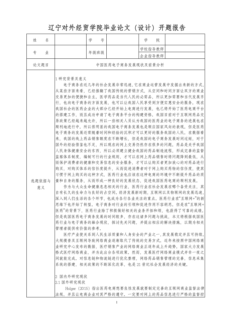 辽宁对外经贸学院毕业论文(设计)开题报告姓学号学院学校指导教师专业年级班级企业指导教师论文题目中国医药电子商务发展现状及前景分析研究背景及意义电子商务在近几年的社会发展非常迅速,它在商业运营发展中发掘出来新的方式,从某些方面来看,已经推翻了我国传统的营销方式,从空间和时间方面让双方的商业交易更加的便捷和自主。医学药品是当代人民的必需品,所以更加需要和当代发展齐行,也向电子商务的方面发展,也可以让我国人民享受到方便实惠安全的服务。现在我国社会的医药企业的大部分已经开始上电商进行发展,也已将开始了医药电商平台的搭建工作,而且成功申请了电子商务平台的枸建资格。我国目前对于互联网药品交易政策已经越来越允许,所以一些相关人员认为我国的医药业的电子商务的进展也在顺利地进行中,所以很明显的我国电子商务发展也是顺应国家风向的表现。但是医药电子商务的发展还需随着时间和经验的沉积才可以更好的服务我国的人民。在数据看来,我国的线上药品销售额度在不断增长,但是我国的电子商务发展时间过短,对于国外的经验借鉴也不足,所以现在的网上交易仍然存在很多的问题。药品是关乎我国人民身体健康安全的东西,所以必须建立健全我国的药品制造流程,形成完善的监督监察体系制度,编制可行的行业规则,才可以在网上药品销售时将问题降到最低,从而保护消费者的健康和交易信息的安全服务,才可以让购买者更加放心的对药品进行购买,对购买体系的信任度提升,从而促进消费者对于网上购买药物的信任度,使其习惯于网上购买的这种方式,医药行业也应该在这种电商的环境中不断提升药品的质选题依据与量和自身的服务,从而形成一种良好的发展状态,促进我国医药电商的顺利发展。意义作为与大众生命健康息息相关的行业,医药行业在社会发展在哪个备受关注,其自有长久的生命力与良好的占空间。经济发展新时期,互联网以及物联网的发展迅速,深入到人们生活的各个环节,也成为各行各业关注的重点。医药行业在“互联网+”的新思维下也开始了转型。电子商务对行业的引领和促进作用不容胡思。但是在“互联网+医药”的背景下,医药行业除了积极做好相关的业务开拓和烦,也获得了可喜的成绩。但是我国医药电子商务发展的时间较多,存在这诸多问题与挑战,本文将根据我国医药行业与电子商务的融合现状,探讨先关问题,并提出相应的解决措施,以期为相关管理者提供有价值的参考。医疗产业使关系到人民生活质量和人身安全的产业之一,其发展稳定并且可持续大规模普及互联网导致网络商业逐渐取代了传统的交易方式。近年来按照中国网络商业研究中心发布的数据,医疗销售产业的网络商业正逐年成上升趋势。国家大力发展格式医疗网络商业,并为此出台各项政策。然而,发展医疗网络商业模式并非一夜之间就能完成。对信息链和物流链进行优化整理,网络药品销售管理的完善,信息采集系统的搭建,相关政策的不断深化改革,也是21世纪社会发展经济的关键。2国内外研究现状2.1国外研究现状Holger(2015)指出医药电商想要良性发展就要制定完善的互联网商业监督法律法规,并且让电商企业对其严格的遵守。一定要对网上的药品信息进行严格的监督控1制,仔细审核发布的广告和信息,严格监督和管理我国互联网交易和互联网信息服务。Kubiak W1 odzimierz(波兰)在2005年指出,医药行业蓬勃发展的基础就是创新,也是促进医疗行业的保障水平的途径之一,它对医学专业的后续发展和人类寿命的长短和质量起着尤为重要的影响。所以我们一定要努力研制新的药品并且使其服务与人类,而且创新发展医药行业经营模式,使他服务于人民,有利于人民。Abraham Schwab(2010)指出,我国的经济结构在改变,科学技术也在不断地发展,所以医学教育也不能落后,跟随时代的脚步进行改革创新,需要创建出适和社会发展的人才培养制度,着重培养我国专业人才,增强人才的实践和科学的利用力。现在是互联网主导发展的时代,随着我国的驻点医师被更加的需要,国家更应该完善我医学培养制度,培养出更多的优秀人才从而促进国家稳定的发展。2.2国内研究现状赵莎莎(2018)通过对电子商务这一领城的各方面条件的深入研究,发现了电子商务要想健康发展,一方面十分需要良好的经济水平的支持,另一方面,也需要符合行业现状的各种数据分析结果,同时,还需要对产业资源进行有效的分配整理,刘秋风,田侃(2018)提出线上的那些药品网店要想持续健康发展,就应该不断完善内外部的管理模式。在国家政策的指导下,依照法律要求,严格按照行业行规,不断深化道德责任感,就会形成一套科学的药品网店的管理模式。孟令全(2011)曾提出,企业财务管理在现如今的经济环境下,对各企业的电子商务有了新的要求,同时,为了能够给各企业的经营管理方面带来具有指导性的建议,就需要不断深入了解网络财务的安全保障系统,进而不断完善与提高。张鸣鸣(2017)通过研究,认为在互联网快速发展的现代,大众的目光正时刻注意着医药在网络上的商务发展。那么这些企业想要发展壮大自身,想要在这个市场行业有自己的立足之地,那么,就要找好出发点。消费者是奠定网上医药店铺成败的最关键因素,只有拥有足够多的用户,才能不断
