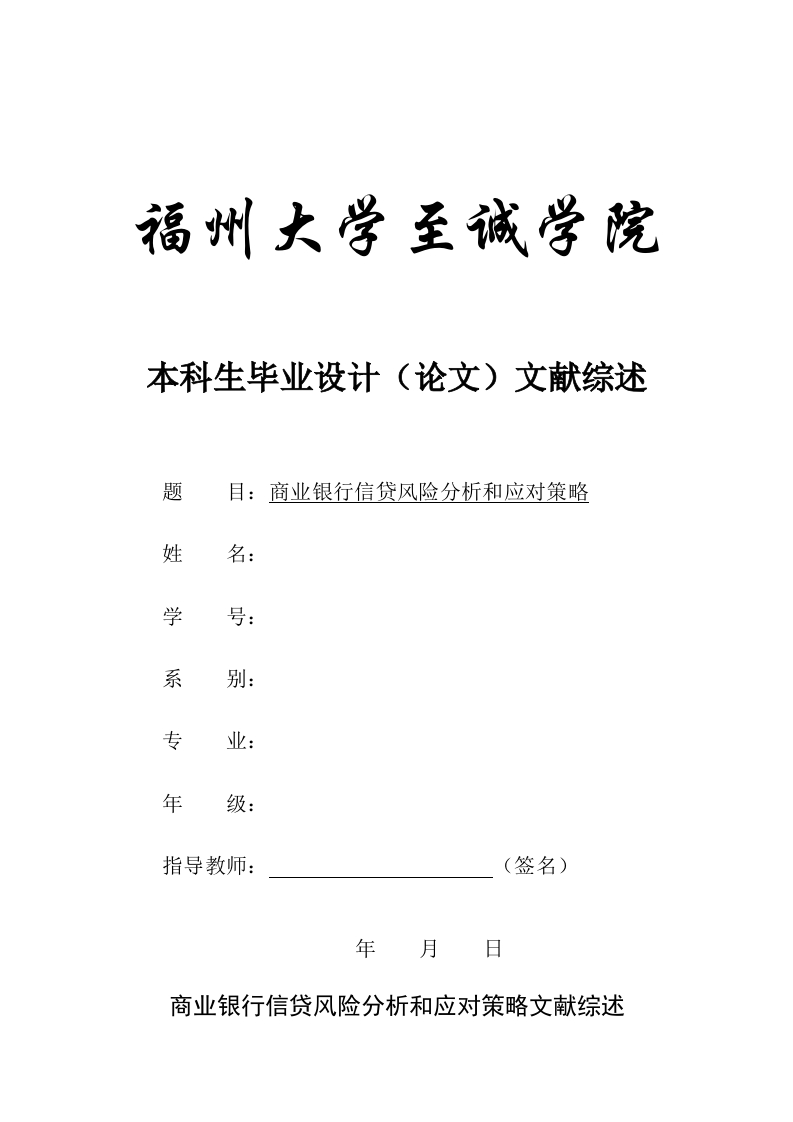 福州大学至狱学院本科生毕业设计(论文)文献综述题目:商业银行信贷风险分析和应对策略姓名:学号:系专业:年级:指导教师:(签名)年月日商业银行信贷风险分析和应对策略文献综述一、引言自2008年次贷危机以来,世界银行业都受到不同程度的打击,无论是国家还是社会,都加强对商业银行风险管理的研究。在应对未来可能爆发的金融危机,如何避免美国的次贷危机在我国的发生,以及能否抓住机会,改变我国银行业长期落后的状态,是我国商业银行亟待解决的问题。在2013年,我国四大行的平均不良贷款率在1.05%,而中国银监会网上数据显示,2013年年末我国银行业金融机构不良贷款余额连续9个季度的增长,达到5921亿元,较年初上升992亿元:同比增速20.13%,较2012年年末高4.94个百分点。截至2014年末,我国商业银行不良贷款余额1.43万亿元,不良贷款率1.60%,同比增速19.95%。本文首先从商业银行信贷风险的定义出发,探讨我国商业银行信贷风险存在的外部和内部原因,然后再从监管的角度阐述外部监管和内部监督共同结合的有效性。最后在以上研究基础上,对解决我国商业银行信贷风险提出几个具体的解决措施和办法,通过贷款证券化、股份制改革和构建我国的社会信用体系,根源性的解决的商业银行信用风险。二、国外研究现状亚当·斯密(1776)《国民财富性质的原因的研究》提出票据理论,为了保持充分的流动性资金安全保证,商业银行可以发行短期票据。莫尔顿(1915)在《商业银行及其基本形式》提出资产转换理论,即银行流动性的关键是贷款期限和存款期间不一致,银行持有的资产的表达能力,只要资产损失可以保持迅速变换成现金,具有充分的流动性。马科维茨和威廉夏普在1960年左右提出了资产组合定价模型,指出了风险资产与预期的收益率之间的关系。2001年,皮埃特罗·潘泽和维普·班塞尔深入研究如何利用VAR方法对市场风险的测量。2005年,美国的学者菲利普·乔瑞发表了《风险价值VAR》,书中介绍了测量系统与VaR方法的应用,并利用VAR技术进行风险分析。英国的经济学家约翰.劳在其1705年所著的《贸易与货币的考察》中提出了信用创造论,经克鲁德曼和熊彼得等的发展,认为信用与资本、货币、财富等同起来,银行有无限的创造信用的能力,具有创造资本的作用:银行的本质是信用创造,通过提供足够的货币促进生产发展和社会繁荣,从而使国富民强。通过信用创造论可以看出银行信用使资本成为控制实物经济的外在力量。在社会再生产中,资金流不再是实物流的附属物,在一定程度上,资金流控制了实物流。信用创造学说的缺点是夸大了信用的作用。三、国内研究现状(一)关于商业银行信贷风险的现状研究综述王东平(2014)随着我国经济的发展,金融环境变得越来越复杂,我国商业银行面临的风险压力也越来越大,尤其是信贷风险的压力显得更为严重。目前,由于我国商业银行大部分没有认识到信贷风险管理的重要性,导致商业银行信贷风险管理呈现整体落后状态[4)。梁晓鸣(2015)工商银行的业务结构多元,又具有市场竞争力和创新力.通过分析产生信贷风险的原因,找到一条适合工行发展的有效途径,促进工行的健康发展,工行部门应该建立健全客户评级授信、贷款发放和贷后管理制度,规范业务操作程序性[5]。张如雪(2015)改革开放以来,我国经济不断发展,但是商业银行所面临的风险也在不断加大,信贷质量的好坏直接影响我国商业银行能不能稳定健康发展。如今,全球化的脚步不断加快,商业银行要面临的问题也越来越多,银行要在全球化的竞争中立足,必须不断增加自己的信贷业务,应建立我国商业银行信贷风险评估体系,规范商业银行信贷业务的操作流程,加强商业银行在风险资产方面的管理,加强对银行人员的激励和考核[6)]。杨爱香(2015)近年来,社会的进步,使许多不同的经济形式鳞次栉比的出现,在以前,银行仅仅只有中央银行以及投资银行两种形式,而现在投资者为了更好地获得经济利益,出现了商业银行这种银行的经营模式。而商业银行的存在也为更多为了贷款获得资金的人提供了便利。而近几年,商业银行为了使信贷更加的合理化,更加的系统化,对商业银行的信贷风险进行管理[刀。薛晶(2016)我国银行面临的风险受不同因素的影响,在种种风险中信贷风险的影响尤为突出,主要体现在信贷质量较低和银行对于信贷风险的控制力不足,这对于我国银行业的收益影响非常明显。(二)关于商业银行信贷风险研究综述周小川(1999)提出了借鉴国际上消化解除不良贷款的经验,并创造性的提出了以债转股方式作为解决我国银行债务的方案。这对我国商业银行来说具有重大意义。娄树本和刘治泰(1999)在亚洲金融危机后,也专门就信贷风险控制问题进行探讨。范英(2000)从商业银行信贷风险管理的观点出发,论述了商业银行信贷风险的概念、特征、分类和产生的根源,讨论了信贷风险识别与管理的主要方法,并结合商业银行信贷风险管理的发展趋势,分析了各种风险方法的适用条件和优缺点。莫万贵(2002)从信息经济学的角度探讨信息不对称条件下的信贷风险的形成机理。首先,对信贷活动中信息不对称所产生的逆向选择与道德风险及由此产生的信贷风险进行了一般理论分析:其次,结合我国信贷市场预算约束软化这一基本特征,研究了我国信贷活动中由于信息不对称而产生的信