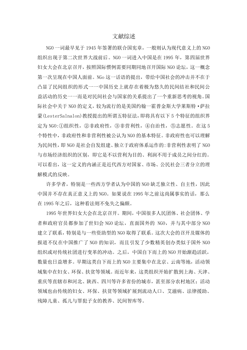 文献综述NG0一词最早见于1945年签署的联合国宪章,一般则认为现代意义上的NG0组织出现于第二次世界大战前后。NG0一词进入中国是在1995年,第四届世界妇女大会在北京召开,按照国际惯例需要同期同地召开国际NG0论坛,这一概念第一次呈现在中国人面前。NG0这一话语的提出,带给中国社会的冲击并不在于凸显了民间组织的形式一一中国历史上就存在着极为悠久的民间结社和民间公益活动的历史一一而是对民间社会与国家的关系提出了一个重新思考的视角。国际社会中关于NG0的定义,较为流行的是美国约翰一霍普金斯大学莱斯特·萨拉蒙(LesterSalnalon)教授提出的所谓五特征法,即将具有以下5个特征的组织界定为NG0:①组织性,②非政府性,③非营利性,④自治性,⑤志愿性。在这5个特性中,非政府性和非营利性被公认为NG0的基本特征。非政府性也可以理解为民间性,即NG0是社会自发组建、独立于政府体系运作的:非营利性表明了NG0与市场经济组织的区别,即它是不以营利为目的、利润不用于成员之间分红的。可以看出,这一定义的内涵正是近代西方对国家、市场、公民社会三者分立的理解模式的反映。许多学者,特别是一些西方学者认为中国的G0缺乏独立性、自主性,因此中国并不存在真正意义上的NG0。如果说在1995年之前这尚属事实的话,那么在1995年之后,这种看法则不免失之偏颇。1995年世界妇女大会在北京召开。期间,中国很多人民团体、社会团体、学者和政府官员都参加了世妇会NG0论坛,直面国外的NG0,并与其中部分NG0建立了联系,特别是与一些资助型的NG0取得了联系。这次大会的召开及媒体的报道不仅在中国推广了NG0的知识,而且引发了少数精英创办类似于国外NG0组织或对传统社团进行变革的冲动。之后,中国自下而上的NG0开始渐趋活跃,数量也日益增多。早期这类自下而上的NG0主要集中在北京、云南等地,活动领域集中在妇女、环保、扶贫等领域。而近年来,这类组织开始扩散到上海、天津、重庆等直辖市和河北、陕西、四川等许多省份的城市,甚至部分农村地区:活动领域也由传统的妇女、环保、扶贫等领域扩展到流动人口、艾滋病、法律援助、残障儿童、孤儿与罪犯子女的教养、民间智库等。从清华大学NG0个案调查的情况看,这些公益类NG0的领导人大多是民间的精英人物,也有少数是政府退休的或已离开政府部门的官员,他们都不必由政府任命。而且,这些组织的领导人几乎无一例外是该组织的创始人,自组织成立以来领导人基本没有大的变动。通常,这些组织的管理人员由组织的领导人,也就是其创始人任命。从资金来源上看,这些自下而上的公益类NG0资金主要来源于境外机构的资助:其次来源于企业的资助,包括一些跨国公司的资助:还有一些NGO,特别是那些不太知名的自下而上的NG0的经费主要依靠组织领导人个人的积蓄,而这类NG0活动的规模通常很小,其经费支出亦主要用于交通和通讯等方面,人力则主要依靠成员的志愿行为。从组织的决策看,这类NG0的重大决策通常会经过理事会讨论,但理事会往往只是一种形式,事实上决策主要由组织创始人来决定。一般而言,这些组织的决策不会受政府部门的影响,特别是那些以工商形式登记注册、二级社团形式登记或没有登记注册的NG0更是如此。另外,作为这些组织的境外资助机构通常也不会直接干预NG0内部的决策,因此这类NG0在决策方面具有较大的自主性。有意思的是,一些倡导民主的NGO,由于精英色彩较浓,其内部治理结构似乎也不见得民主。这可能与其发展的阶段有关。从组织开展的活动情况看,这类NG0在开展活动时,大多没有事先经过政府部门的批准。这与组织的非“社会团体”身份有关。而另外一个原因则在于这些NG0在开展活动时通常会尽量避免与政府的法律法规发生冲突或选择一些比较安全的非政治性领域开展活动。因此大多数地方政府对它们的活动采取了“三不”政策,即“不承认、不干预、不取缔”。值得注意的是,这些NG0的活动虽然受政府的影响较小,但有时却会受到境外资助机构的影响。特别是那些过分依靠一家或两家境外组织资助的NG0更是如此。这是因为,NG0申请的项目能否获得境外资助最终要取决于所申请的项目是否符合资助机构的战略和偏好。因此一些NG0在开展活动时往往不得不投资助者所好,甚至在项目的设计与内容、项目的形式、实施的手法方面都会尽量符合资助者的偏好。但总的来说,无论是从组织的人事与资金,还是从组织的决策与活动来看,这些NG0对政府、企业的依附性较小,具有一定的独立自主性。可见,1995年之后,中国NG0一个显著的变化就是一批自下而上的自主性NG0的兴起。然而,众所周知,1989年政府为了整顿NG0管理混乱的局面,颁布了《社会团体登记管理条例》,确立了双重登记管理制度。在这一条例出台后,中国对NG0的管制较之条例出台前更为严格。据此推论,1989年以后自下而上的NG0生存空间应当是更加狭小了,那么,如何解释1995年以后自下而上的NG0的兴起呢?从需求的角度看,1992年邓小平南方重要谈话发表以后,中国开始全面推进市场经济体制的建立。在由计划经济向市场经济的转型过程中,一方面政府,特别是地方政府的财政不堪重负,无力解决众多的社会问题,需要借助民间的力量提供更多的公共服务:另一方面原有的弱势群体和实现市场经济体制后新产