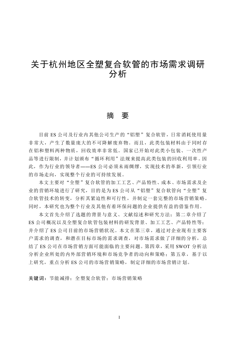 关于杭州地区全塑复合软管的市场需求调研分析摘要目前ES公司及行业内其他公司生产的“铝塑”复合软管,日常消耗使用量非常大,产生了数量庞大的不可降解废弃物。而且,此类包装材料由于同时存在铝和塑料两种物质,回收效率非常低。国家已开始对此类小包装、一次性产品等进行限制,并计划颁布“循环利用”法规来提高此类包装的回收利用率。因此,作为行业的领导者一一ES公司必须未雨绸缪,实现技术的革新,引领行业的市场走向,实现整个行业的可持续发展。本文主要对“全塑”复合软管的加工工艺、产品特性、成本、市场需求及企业的营销环境进行了研究,目的是为ES公司从“铝塑”复合软管向“全塑”复合软管技术的转变,分析其紧迫性和可行性,并制定一套完整的市场营销策略。同时,本研究也为整个行业及其他有着环保问题的企业提供有益的借鉴作用。本文首先介绍了选题的背景与意义、文献综述和研究方法:第二章介绍了E$公司概况以及全塑复合软管包装材料的研发背景、加工工艺、产品特性等:并介绍了ES公司目前的市场营销状况。本文在第三章,通过对企业现有主要客户需求的调查,和潜在目标市场的需求调查,对市场需求做了详细的分析,总结了ES公司在市场营销方面可能面临的主要问题。第四章,采用SWOT分析法分析企业所处的内外部营销环境和市场竞争者的动向和策略:第五章,基于以上研究,重点分析ES公司的市场营销策略,制定详细的市场营销计划。关键词:节能减排:全塑复合软管:市场营销策略目录摘要…目录第一章全塑复合软管的市场需求调查分析31.1市场调查的目的和方法1.11现有目标市场调查的目的和方法1.1.2潜在目标市场调查的目的和方法1.2市场调查结果分析…51.2.】现有目标市场调查结果分析…12.2潜在目标市场调查结果分析1.3ES公司市场营销面临的主要问题分析第二章ES公司全塑复合软管市场营销环境分析122.1外部环境分析22.2内部环境分析…2.3竞争对手市场动向和策略分析…13第三章ES公司全塑复合软管市场营销策略3.1市场发展规划.3.2市场营销策略3.3扩大市场总需求营销策略163.4实现市场营销策略的建议结论…18致谢…19参考文献.20附录绪论随着全球变暖的日益严重,全世界掀起了一股股节能减排的热潮。近几年,中国也陆续颁布新的法令法规来限制能源的过度开发、利用,并鼓励对不可再生资源的回收利用,以达节能减排的目的。特别是与石油产品链相关的产品,随着国家“限塑令”的推出和“循环利用”法规的逐渐实施,一时间塑料包装产品面临着巨大的挑战。这种挑战不仅仅来自国家政策的压力,更重要的是企业产品如何转型的问题。从目前整个复合软管行业的现状看,产品的转型势在必行。据统计我国每年消耗掉的铝塑复合软管将近30亿支,而且还在逐年递增。但是由于“铝塑”复合软管中含有铝箔和塑料,当前,对此类材料的回收利用非常困难,处理不好很容易产生二次污染:而物理的分离回收办法,成本非常高,没有经济性。因此,为解决产品的环保问题,顺应国家政策方向,E$公司加大了在相对环保的产品的研发和投资力度,逐步提高并完善了“全塑”复合软管的生产工艺和技术,使“全塑”复合软管成为十分成熟的产品。但是由于种种原因,“全塑”复合软管在市场上的应用比例却一直很低。目前,“铝塑”复合软管和“全塑”复合软管的使用比例非常悬殊,大概为:95%和5%,“全塑”复合软管全面替代“铝塑”复合软管的过程,必将是一个巨大的挑战,但同时又是很大的机遇。第一章全塑复合软管的市场需求调查分析“市场调研与预测,是确保企业实现价值的最基础的工作,是决定企业行动方向的依据。这一环节一旦失误,往往是难以逆转的,给企业造成的损失将是最大的。”作为复合软管行业的领导者,ES公司必需在大面积推广全塑复合软管之前做好充足的市场调查工作,为市场营销策略提供充足的信息和数据支持。1.1市场调查的目的和方法大约在12年之前,牙膏产品的包装几乎全部为铝管。当ES公司把第一支铝塑复合软管带进这个行业时,也曾出现过犹豫、挣扎与拒绝,但最终还是没能抵挡住复合软管的优越性能的吸引,最终纷纷转为复合软管包装。现在全塑复合软管的强势进入,势必也将引起很大的震荡,无论是复合软管行业本身还3