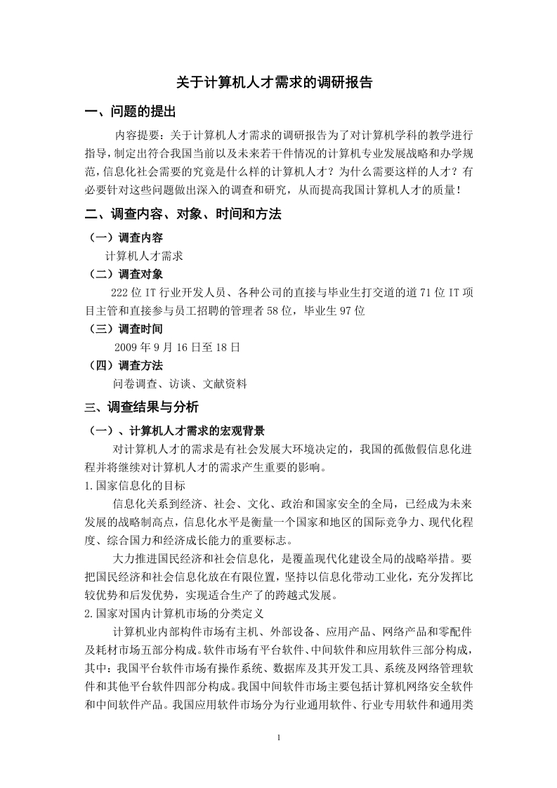 关于计算机人才需求的调研报告一、问题的提出内容提要:关于计算机人才需求的调研报告为了对计算机学科的教学进行指导,制定出符合我国当前以及未来若干件情况的计算机专业发展战略和办学规范,信息化社会需要的究竟是什么样的计算机人才?为什么需要这样的人才?有必要针对这些问题做出深入的调查和研究,从而提高我国计算机人才的质量!二、调查内容、对象、时间和方法(一)调查内容计算机人才需求(二)调查对象222位IT行业开发人员、各种公司的直接与毕业生打交道的道71位IT项目主管和直接参与员工招聘的管理者58位,毕业生97位(三)调查时间2009年9月16日至18日(四)调查方法问卷调查、访谈、文献资料三、调查结果与分析(一)、计算机人才需求的宏观背景对计算机人才的需求是有社会发展大环境决定的,我国的孤傲假信息化进程并将继续对计算机人才的需求产生重要的影响。1.国家信息化的目标信息化关系到经济、社会、文化、政治和国家安全的全局,已经成为未来发展的战略制高点,信息化水平是衡量一个国家和地区的国际竞争力、现代化程度、综合国力和经济成长能力的重要标志。大力推进国民经济和社会信息化,是覆盖现代化建设全局的战略举措。要把国民经济和社会信息化放在有限位置,坚持以信息化带动工业化,充分发挥比较优势和后发优势,实现适合生产了的跨越式发展。2.国家对国内计算机市场的分类定义计算机业内部构件市场有主机、外部设备、应用产品、网络产品和零配件及耗材市场五部分构成。软件市场有平台软件、中间软件和应用软件三部分构成,其中:我国平台软件市场有操作系统、数据库及其开发工具、系统及网络管理软件和其他平台软件四部分构成。我国中间软件市场主要包括计算机网络安全软件和中间软件产品。我国应用软件市场分为行业通用软件、行业专用软件和通用类软件三部分,又以行业专用软件市场为主流。3.社会对计算机人才的需求量经过调查发现,关于计算机人才的需求已经出现了一种相互矛盾的现象。从总体来看,计算机类人才缺口很大。《国民经济和社会发展第十个五年计划信息化专项规划》预计,“十五”期间,各级各类信息化人才五年共增加2000外人,其中软件人员增加300为人。但是,计算机专业毕业生的就业却已经开始出现困难。从教育部信息显示,在2003年开始计算机类专业的本科毕业生增加,而招生量却明显减少,在2002年的10.85万人减至2003年的7.17万人,这表明各校根据就业情况在改变招生规模。(二)、信息社会对计算机人才的具体要求1.从工作性质来划分计算机人才、从事研究型工作的专门人才。他们主要从事计算机基础理论、新一代计算机及其软件核心技术与产品等方面的研究工作。b、从事工程型工作的专门人才。他们主要从事计算机软硬件产品的工程性开发和实现工作。C、从事应用性工作的专门人才。他们主要从事企业与政府信息系统的建设、管理、运行、维护的技术工作,以及在计算机与软件企业中从事系统集成或售前售后服务的而技术工作。2.计算机人才需求的层次结构特征社会对计算机人才的需求呈金字塔结构。例如,教育部关于紧缺人才的报告称,到2005年,我国需要高级软基人才6万人,中级软件人才28万人,初级软件人才46万人,但是,目前软件从业人员的结构呈橄榄型。对于这种现状的认识,一位企业负责人的观点具有一定的代表性:目前软件“蓝领”人数少的根本原因,不是软件企业不需要软件“蓝领”,而是缺乏能够有效地组织和指挥软件“蓝领”、发挥其软件生产力的高级软件人才。在现在的就业形势和企业竞争条件下,市场出现了某种供大于求的现象。因此,企业再找极品新的员工时候,有了更多的选择余地,提出了更高的要求。调查结果显示,企业中不同部门的负责人对应聘者专业技能的要求不同。人力资源主管认为排在头三位的专业技能分别是:编程能力、操作系统知识和数据库知识:然而IT项目主管认为排在头三位的专业技能则分别是::编程能力、数据结构知识和算法知识,此外依次需要具备数据库知识、软件安全工程知识和操作系统知识。3.用人单位关于计算机专业人才素质和职业道德的观点在企业访谈过程中,每个IT公司都毫无例外的谈到了计算机专业人才综合2素质培养的问题。在知识经济快速发的时代,高校毕业生仅仅掌握已有的知识是完全不够的,重要的是要有一种综合的能力,即通常所说的专业素质。尽管企业招聘是比较看重应聘者的工作经验,但素质与经验二者并不矛盾,招聘时考虑的是工作地关联性、有效性即成本最小化,而一旦进入工作角色后,注重的不仅是曾经做过什么,更重要的是能做什么,要求员工在工作中能够应对经常变化的客观情况。加强职业道德和社会责任感的教育是一个大家都认为重要但实际上很容易被忽视的问题。这些问题不易被察觉,也无法提供定量的分析和评价:而一旦出现问题,损失则可能很大。三、存在问题和原因分析1.关于课程设置与师资队伍企业和毕业生对目前高校计算机专业的课程设置有些看法,同时认为教材普遍偏旧,而且学生也没有学的很扎实。毕业生普遍认为计算机的技术变化很快,课程也需要跟上发展的步伐目前计算机专业的基础理论课程比重并不小,但由于学生不了解其作用,许多教师