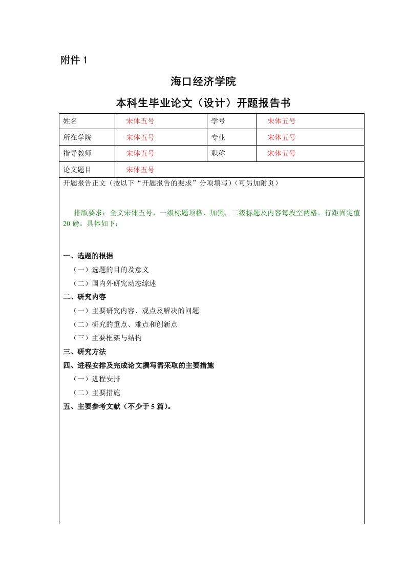 附件1海口经济学院本科生毕业论文(设计)开题报告书姓名宋体五号学号宋体五号所在学院宋体五号专业宋体五号指导教师宋体五号职称宋体五号论文题目宋体五号开题报告正文(按以下“开题报告的要求”分项填写)(可另加附页)排版要求:全文宋体五号,一级标题顶格、加黑,二级标题及内容每段空两格。行距固定值20磅。具体如下:一、选题的根据(一)选题的目的及意义(二)国内外研究动态综述二、研究内容(一)主要研究内容、观点及解决的问题(二)研究的重点、难点和创新点(三)主要框架与结构三、研究方法四、进程安排及完成论文撰写需采取的主要措施(一)进程安排(二)主要措施五、主要参考文献(不少于5篇)。指导教师对开题报告的意见本处内容手写指导教师签名:年月日1、选题的根据(包括:①选题的目的及意义:②综述本选题国内外研究动态):2、研究内容(包括:①主要研究内容、观点及解决的问题:②研究的重点、难点和创新点:③论文的主要框架与结构):开题报告3、研究方法(包括:定量还是定性研究,研究的途径、基础以及解决问题的的要求思路):4、进程安排及完成论文撰写需采取的主要措施:5、主要参考文献(不少于5篇)。6、开题报告的总字数不少于1500字。
