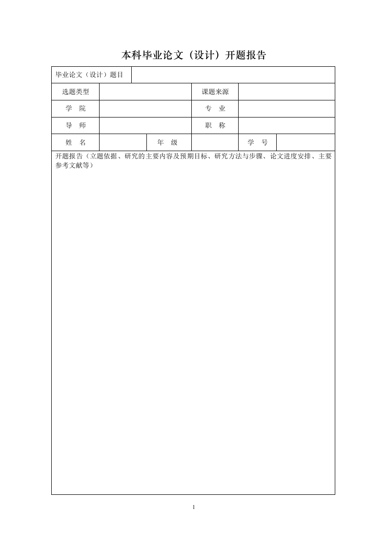 本科毕业论文(设计)开题报告毕业论文(设计)题目选题类型课题来源学院专业导师职称姓名年级学号开题报告(立题依据、研究的主要内容及预期目标、研究方法与步骤、论文进度安排、主要参考文献等)导师意见导师签名:年月日注:1.选题类型:基础型、应用基础型、应用型、调研型:2.课题来源:国家重点研发计划项目,国家社科规划、基金项目,国家自然科学基金项目,中央、国家各部门项目,教育部人文、社会科学研究项目,省(自治区、直辖市)项目,国际合作研究项目,与港、澳、台合作研究项目,企、事业单位委托项目,外资项目,国防项目,学校自选项目,非立项,其他。2