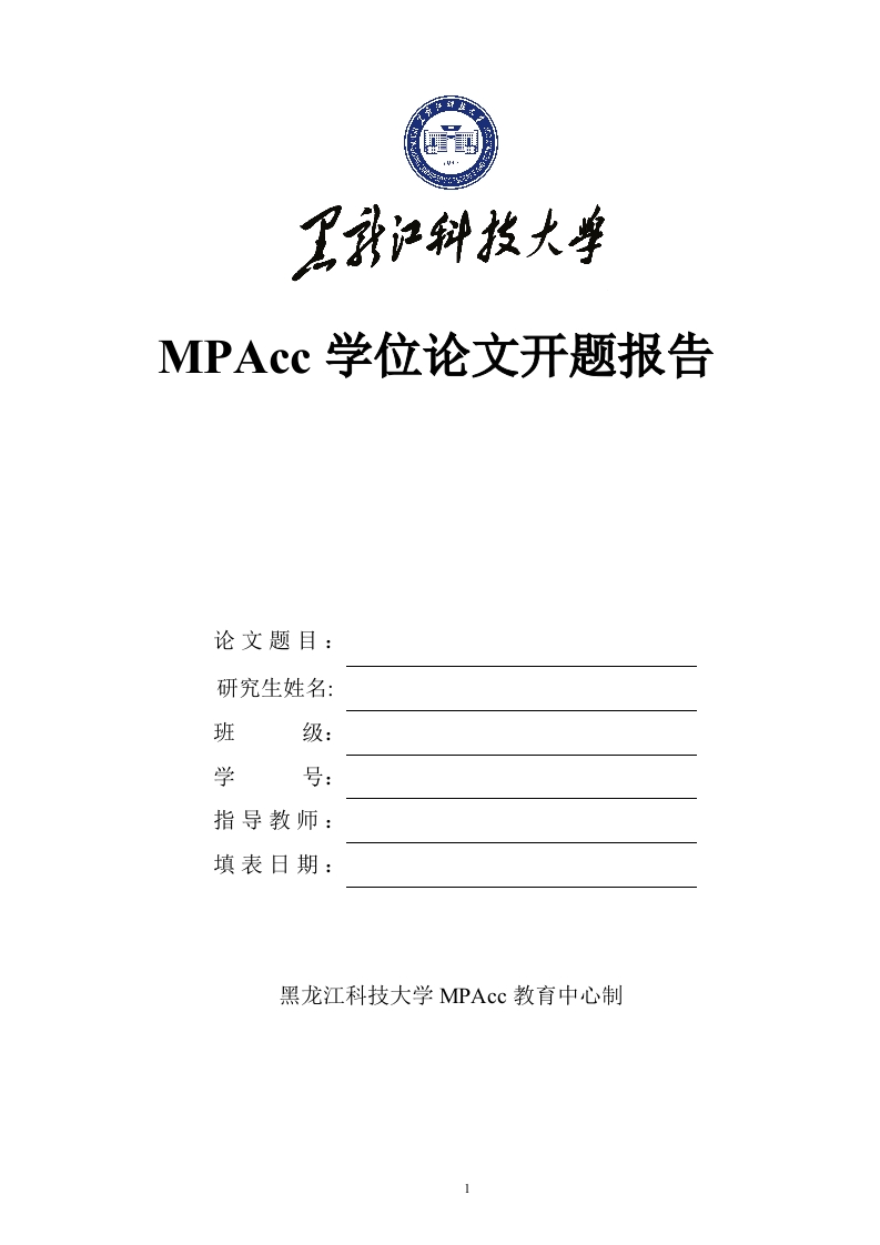 钟大PAcc学位论文开题报告论文题目:研究生姓名:班学指导教师:填表日期:黑龙江科技大学MPAcc教育中心制1选题依据(一)选题目的和意义(二)国内外研究概况、水平和发展趋势(可另加附页)2二、研究方案(一)主要研究内容(二)论文提纲(三)技术路线(四)研究方法(五)创新之处(六)拟解决的主要问题(七)进度安排(八)参考文献3