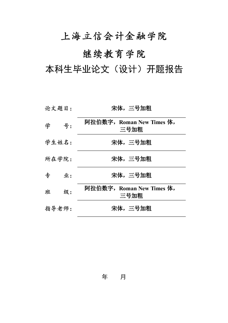 上海立信会计金融学院继续教育学院本科生毕业论文(设计)开题报告论文题目:宋体,三号加粗学阿拉伯数字,Roman New Times体,三号加粗学生姓名:宋体,三号加粗所在学院:宋体,三号加粗专业:宋体,三号加粗阿拉伯数字,Roman New Times体,班级:三号加粗指导老师:宋体,三号加粗年月(一)基本思路(包括选题依据、意义:拟解决的主要问题:论文的基本内容、研究方法等,不少于300字)(二)撰写提纲(三)预计主要创新点(四)进程安排(五)参考文献(研究型论文不少于20篇)(六)指导教师意见(开题答辩小组意见为后两种意见需做出简要说明):同意开题口不同意开题口指导教师:年月日填表要求:1.本表采用小四号宋体,1.5倍行距,段前段后均为0.2.本表根据内容可续页。3.参考文献的格式参照《上海立信会计金融学院继续教育学院本科生毕业论文(设计)格式与印制规范》的有关要求。4.开题报告最后一个页面,表格置于页面底部。