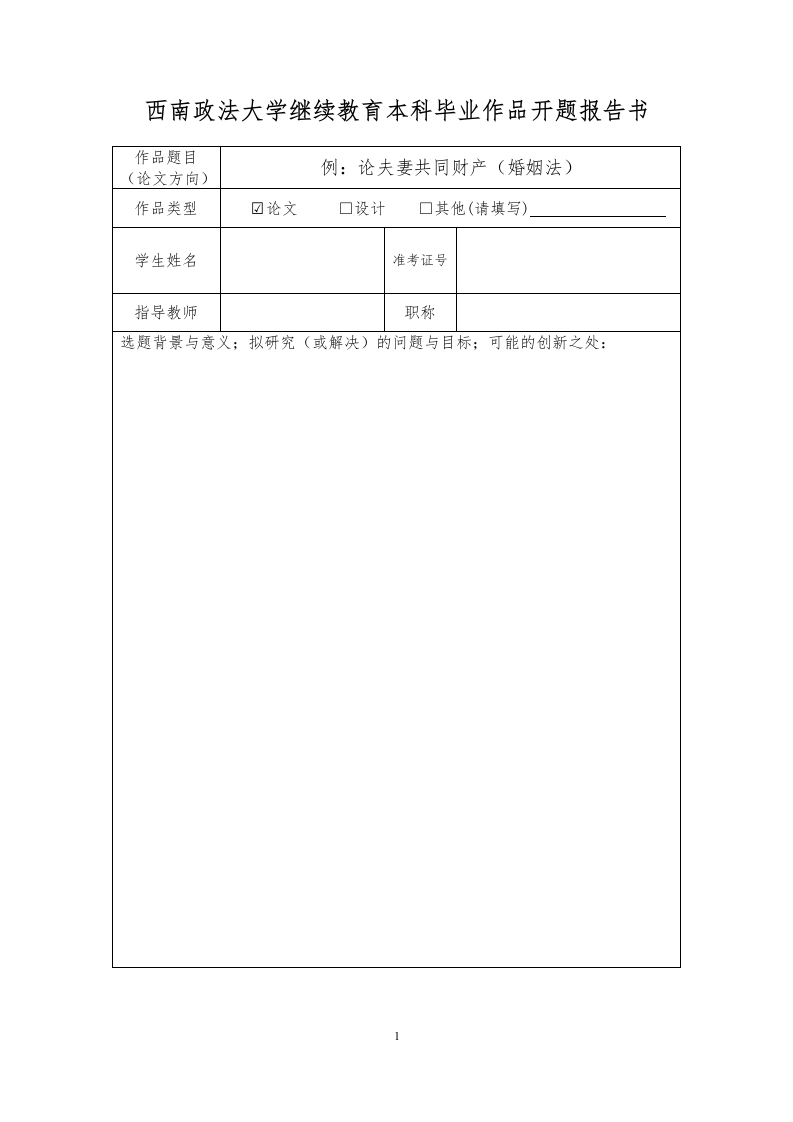 西南政法大学继续教育本科毕业作品开题报告书作品题目(论文方向)例:论夫妻共同财产(婚姻法)作品类型☑论文口设计口其他(请填写)学生姓名准考证号指导教师职称选题背景与意义;拟研究(或解决)的问题与目标:可能的创新之处:1论文提纲或论文框架:实施进度安排(包括阶段性目标与时间节点):指导教师意见:签名:年月日填写说明:本表若版面不够,可自行调整大小:双面打印。3