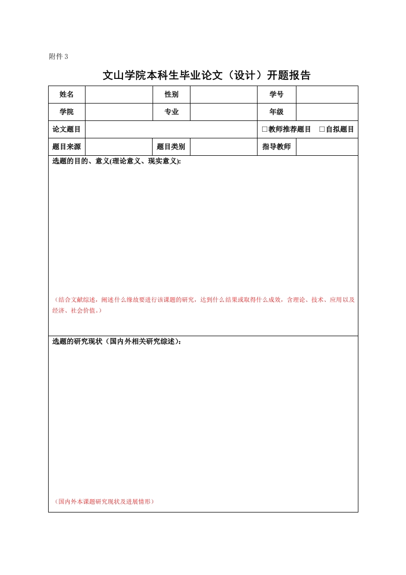 附件3文山学院本科生毕业论文(设计)开题报告姓名性别学号学院专业年级论文题目口教师推荐题目口自拟题目题目来源题目类别指导教师选题的目的、意义(理论意义、现实意义):〔(结合文献综述,阐述什么缘故要进行该课趣的研究,达到什么结果或取得什么成效,含理论、技术、应用以及经济、社会价值。)选题的研究现状(国内外相关研究综述):(国内外本课题研究现状及进展情形)论文(设计)主要内容(提纲):拟研究的主要问题、重点和难点:研究目标:研究方法、技术路线、实验方案、可行性分析:研究的创新之处:(介绍该课题在技术方案、研究内容、理论、应用、经济与社会价值等方面的创新。)