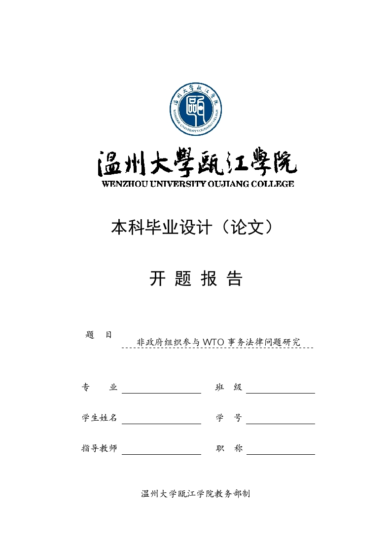 本科毕业设计(论文)开题报告题目非政府组织参与WTO事务法律问题研究专业班级学生姓名学号指导教师职称温州大学瓯江学院教务部制温州大学瓯江学院本科毕业设计(论文)开题报告一、选题的背景与意义(一)选题背景(二)选题意义1、理论意义2、实践意义二、选题的研究现状(一)国内研究现状(二)国外研究现状(三)研究现状评述