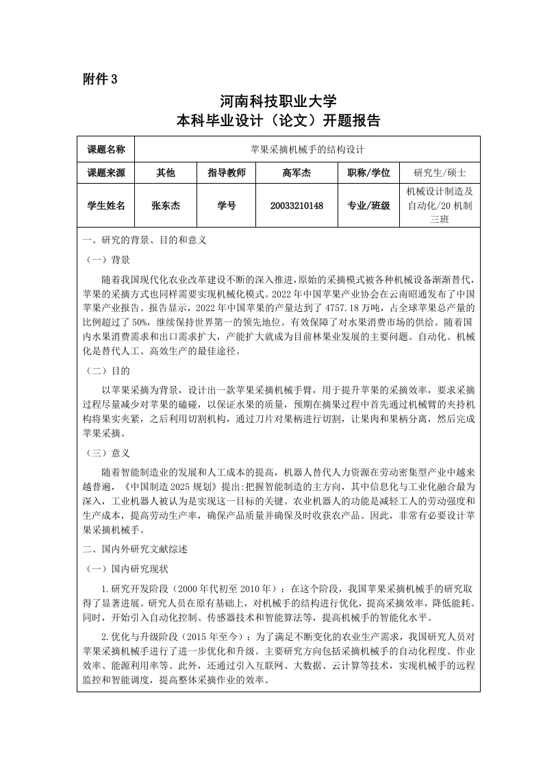 附件3河南科技职业大学本科毕业设计(论文)开题报告课题名称苹果采摘机械手的结构设计课题来源其他指导教师高军杰职称/学位研究生/硕士机械设计制造及学生姓名张东杰学号20033210148专业/班级自动化/20机制三班一、研究的背景、目的和意义(一)背景随着我国现代化农业改革建设不断的深入推进,原始的采摘模式被各种机械设备渐渐替代,苹果的采摘方式也同样需要实现机械化模式。2022年中国苹果产业协会在云南昭通发布了中国苹果产业报告。报告显示,2022年中国苹果的产量达到了4757.18万吨,占全球苹果总产量的比例超过了50%,继续保持世界第一的领先地位。有效保障了对水果消费市场的供给。随着国内水果消费需求和出口需求扩大,产能扩大就成为目前林果业发展的主要问题。自动化、机械化是替代人工、高效生产的最佳途径。(二)目的以苹果采摘为背景,设计出一款苹果采摘机械手臂,用于提升苹果的采摘效率,要求采摘过程尽量减少对苹果的磕碰,以保证水果的质量,预期在摘果过程中首先通过机械臂的夹持机构将果实夹紧,之后利用切割机构,通过刀片对果柄进行切割,让果肉和果柄分离,然后完成苹果采摘。(三)意义随着智能制造业的发展和人工成本的提高,机器人替代人力资源在劳动密集型产业中越来越普遍,《中国制造2025规划》提出:把握智能制造的主方向,其中信息化与工业化融合最为深入,工业机器人被认为是实现这一目标的关键。农业机器人的功能是减轻工人的劳动强度和生产成本,提高劳动生产率,确保产品质量并确保及时收获农产品。因此,非常有必要设计苹果采摘机械手。二、国内外研究文献综述(一)国内研究现状1.研究开发阶段(2000年代初至2010年):在这个阶段,我国苹果采摘机械手的研究取得了显著进展。研究人员在原有基础上,对机械手的结构进行优化,提高采摘效率,降低能耗。同时,开始引入自动化控制、传感器技术和智能算法等,提高机械手的智能化水平。2.优化与升级阶段(2015年至今):为了满足不断变化的农业生产需求,我国研究人员对苹果采摘机械手进行了进一步优化和升级。主要研究方向包括采摘机械手的自动化程度、作业效率、能源利用率等。此外,还通过引入互联网、大数据、云计算等技术,实现机械手的远程监控和智能调度,提高整体采摘作业的效率。(二)国外研究现状1.高度智能化阶段(21世纪初至今):随着信息技术的进一步发展,苹果采摘机械手设计进入了高度智能化阶段。机械手不仅具备了自动采摘功能,还能够实现果实品质的在线检测、果园环境的监测以及机械手的自主导航。此外,一些研究者还尝试通过机器学习和人工智能技术,让机械手具备学习能力和适应性,使其能够针对不同果园和果实类型进行优化采摘。2.可持续发展阶段(未来趋势):未来的苹果采摘机械手设计将更加注重可持续发展,包括节能、环保和高效。研究人员将致力于开发利用可再生能源的采摘机械手,以及降低机械手对土壤和环境影响的技术。此外,采摘机械手将与其他农业机械化设备相结合,构建智能化的果园管理系统,实现农业生产的精准化和可持续发展。三、研究的主要内容和拟采用的研究方法(一)研究的主要内容1.机型选择与参数设计:根据采摘需求和作业环境,选择适合的机械手机型。主要包括采摘机械手的结构形式、自由度、工作范围等参数设计,以确保机械手能够适应多种果树和果实类型。2.驱动系统设计:选择合适的驱动方式,如电机、气动或液压驱动,以实现机械手的运动和控制。驱动系统的设计需要考虑机械手的运行速度、力度、稳定性和能耗等因素。3.机械手结构设计与分析:进行机械手的结构设计,包括肩部、手腕、主体等部分。在设计过程中,需要充分考虑机械手的力学性能、刚度、强度和稳定性等,以保证机械手在采摘过程中能够稳定运行。4.控制系统设计:开发具备自主导航、感知、判断和执行能力的控制系统。该系统通常包括传感器、控制器、执行器等组成部分,用于实现机械手与果实之间的精确配合和智能采摘。5.图像识别与智能控制:利用计算机图像技术和人工智能算法,对果实进行识别和成熟度判断。这将有助于机械手实现对不同果实类型的精确采摘,降低果实损伤率。(二)采用的研究方法1.文献调研:收集和分析国内外相关领域的研究资料和技术成果,了解苹果采摘机械手的发展现状、趋势和存在的问题,为结构设计提供理论依据和技术参考。2.参数化设计:基于采摘需求和作业环境,运用参数化设计方法进行机械手的结构设计。通过调整参数,优化机械手的性能,使其适应不同果树和果实类型。3.概念设计:采用设计思维和创新方法,提出多种机械手结构方案。通过对方案的比较和评价,筛选出最具潜力的方案进行深入研究。4.计算机辅助设计(CAD):利用计算机辅助设计软件(如SolidWorks、.AutoCAD等),绘制机械手的结构图纸,并进行三维建模和模拟分析。5.力学分析:基于机械手结构和作业原理,建立力学模型,分析机械手在采摘过程中的力学性能、刚度、强度和稳定性等。6.有限元分析:运用有限元分析软件(如ANSYS、ABAQUS等),对机械手的关键部件进行强度、刚度和稳定性分析,优化结构设计。7.控制系统设计:基于计算机编程语言(如C+、Python等),开发机械手的控制系统。四、研究进度安排1.2023.11.1-11.7.下达