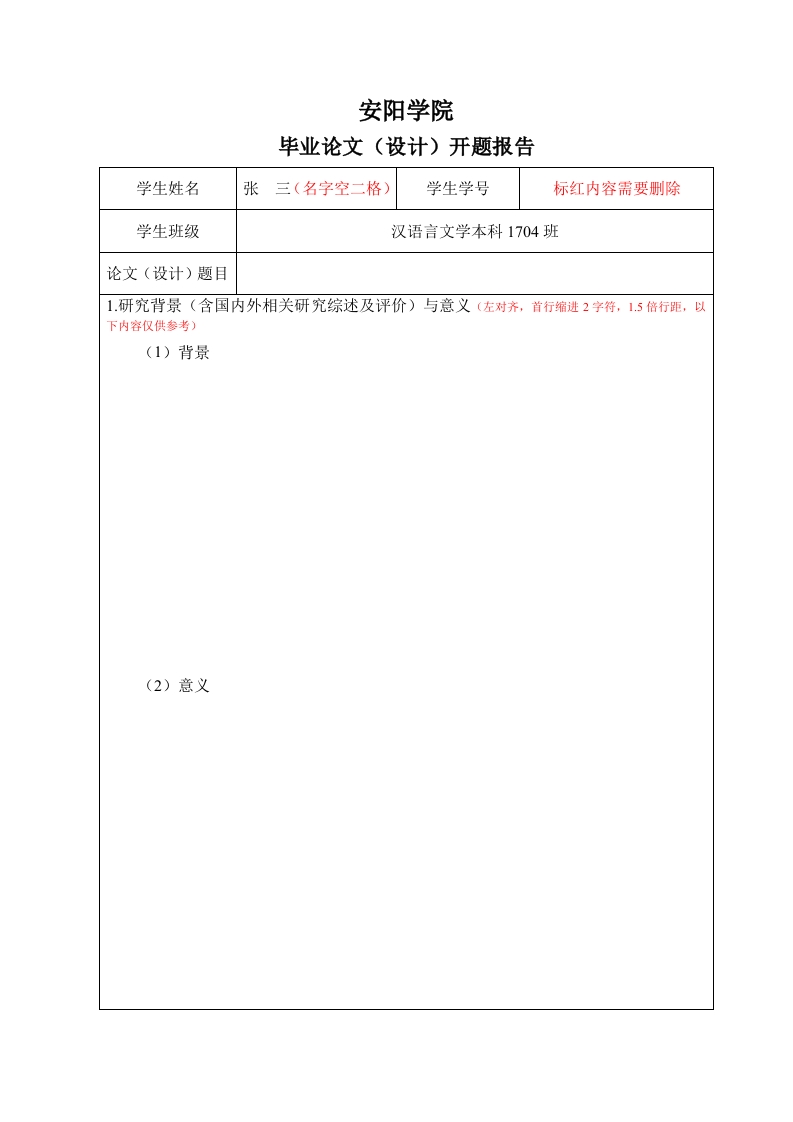 安阳学院毕业论文(设计)开题报告学生姓名张三(名字空二格)学生学号标红内容需要删除学生班级汉语言文学本科1704班论文(设计)题目1.研究背景(含国内外相关研究综述及评价)与意义(左对齐,首行缩进2字符,1.5倍行距,以下内容仅供参考)(1)背景(2)意义2.研究的主要内容与方法(左对齐,首行缩进2字符,1.5倍行距,以下内容仅供参考)(1)主要内容(2)方法3.研究条件和可能存在的问题(左对齐,首行缩进2字符,1.5倍行距,以下内容仅供参考)研究条件可能存在的问题4.拟解决主要问题和预期结果(左对齐,首行缩进2字符,1.5倍行距,以下内容仅供参考)(1)拟解决主要问题(2)预期结果5.论文(设计)进度计划(左对齐,首行缩进2字符,1.5倍行距,以下内容仅供参考)6.参考文献(一般不少于10篇)[1][2][3][4][5][6]指导教师意见(左对齐,首行缩进2字符,1.5倍行距,以下内容仅供参考)签字:年月日二级学院(专业)负责人审核意见〔左对齐,首行缩进2字符,1.5倍行距,以下内容仅供参考)签字:年月日备注:1.题目类型包括:设计类、研究类、调研类、其他:2.题目来源包括:科研、生产、教学、其他: