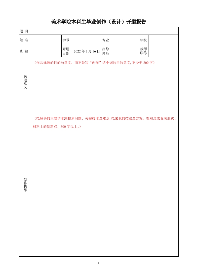 美术学院本科生毕业创作(设计)开题报告题目姓名学号专业年级班级开题指导教师日期2022年3月16日教师职称(作品选题的目的与意义,而不是写“创作”这个词的目的意义,不少于200字)选题意义(拟解决的主要学术或技术问题、关键技术及难点,拟采取的技法及方案,在观念或表现形式、材料上的创新点,300字以上。)创作构思(对与创作、设计相同或相近的作品的分析借鉴,500字以上)主要参考作品目录及分析序号工作任务起止日期创作进度安排23456审阅意见指导教师(签名):教研室(系)主任(签名):年月日年月日