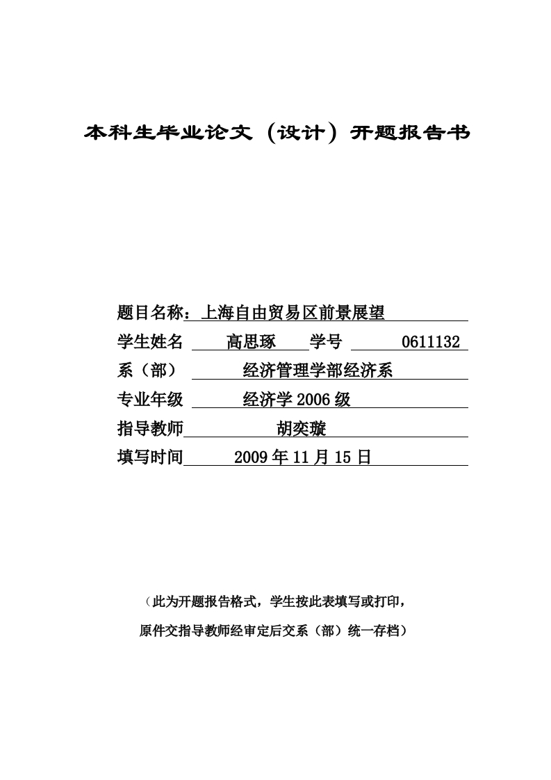本科生毕业论文(设计)开题报告书题目名称:上海自由贸易区前景展望学生姓名高思琢学号0611132系(部)经济管理学部经济系专业年级经济学2006级指导教师胡奕璇填写时间2009年11月15日(此为开题报告格式,学生按此表填写或打印,原件交指导教师经审定后交系(部)统一存档)、选题的根据:1)本选题的理论、实际意义2)综述国内外有关本选题的研究动态和自己的见解1)本选题的理论、实际意义:2013年8月22日,上海自由贸易试验区经国务院批准,9月29日正式挂牌。成立上海自由贸易试验区这一举动,堪称继上世纪80年代开放沿海、90年代邓小平南巡和2001年加入WT0三次扩大开放后我国政府的又一重要的项层设计。根据自贸区设计的总体方案,在这个占地约28.78平方公里的实验区内,将进行加快政府职能转变、扩大投资领域开放、推进贸易发展方式转变、深化金融领域的开放创新、完善法制领域的制度保障等多方面尝试。中国(上海)自贸试验区是中国改革开放以来第一个冠名“中国”的特区,并以形成可复制、可推广的经验为主要目的。因此,在此尝试过程中相关当局的一系列举措,及其后续影响在为该区域进一步深化改革,带动经济转型的同时,也为我国其他地区如何转变发展模式,提供了可借鉴、可分析的模板,具有不容小觑的实践意义。另一方面,与较强的社会认知需求形成对比的是,在理论层面,该问题产生于2013年,不足一年,故而具有很强的新颖性,与创新性。虽当前在理论界保持着一定的关注热度,但目前尚未有学者对该问题进行系统研究。综上所述,上海自贸区的相关问题在未来一段时间内将保有重要的理论价值和现实意义,而对建立该自贸区后的发展前景,以及可能潜在的风险隐患等问题在学理层面进行进一步深入探讨更是问题束中的重要一环,对解决当代中国经济贸易发展的现实问题有着重要价值。2)综述国内外有关本选题的研究动态和自己的见解中国上海自由贸易区的成立作为一新近产生的中国问题,尚未引起国外学者的关注。中国学者对这一问题的研究,主要在以下几个方面:一是上海自贸区的定位问题。王丽雯认为:上海自由贸易区的规划与定位不能停留在筒单的贸易上,它应当是多功能型的、创新型的、复合型的综合性贸易区。只有建设新型的上海自由贸易区,才能适应中国的国情,实现与国际接轨。刘坦指出:就政策而言,上海自贸区既不是新区,也不是特区,而是现有保税区的全方位升级;就地理位置而言,上海自贸区是现有保税区的整合。二是关于上海自贸区所肩负的使命或实现目标。关于这一问题学者之间争议不大,多是关于以下几个方面。基于国务院下发的《中国(上海)自由贸易试验区总体方案》中提出的5项任务,赵英军认为主要目标有:政府管理方式的转变:经济增长和开放的转型敏感领域改革的突破三个方面。杨永提出主要使命有贸易自由化、投资自由化、金融国际化、行政精筒化。三是对上海自由贸易区的发展前景进行展望。有的学者态度乐观,例如上海社科院世界经济研究所所长徐明淇教授认为其对上海经济和长江三角洲地区的发展必然带来积极影响,表现在:首先会产生对外开放的溢出效应,代表着中国目前对开放的地区,对外资的吸引力较高:二是政府改革效率提高的积极响应,有利于监管,更加符合国际标准;三是服务业开放带来的产业结构升级,提升效应。但也有学者持谨慎态度,认为与改革开放伴随而来的风险不可忽视。1997-1998年东南亚金融危机为我们敲响了警钟,资本项下的本币自由兑换和资本流动,有可能会吸引关注短期投机收益的国际游资迅速进入和退出某些国家的资本市场和实体经济,给该国的资本市场和实体经济带来重大的冲击乃至灾难性的打击。在此基础上,学者积极献言献策。夏善晨教授从全球视野、综合衡量,立法先行、制度创新,互利共赢、区域突破,三个角度着手提出了自己的对策。个人见解关于这一颇具有现实意义和理论探讨价值的问题,在阅读了相关学者著述的基础上,我认为建立上海自由贸易区是中国改革开放进入深水区后,国家领导人重要顶层设计,对于解决中国经济的深化改革,产业转型以及政治层面行政部门精筒化等问题具有重要意义。不可否认,这一举动带来的机遇与风险参半。可以预见,上海自由贸易区必会成为未来国际航运中心和国际物流中心的核心区域、国际金融中心的突破点、国际贸易中心的重要载体,也是上海自由贸易区的发展成为金融改革创新的重要实现机遇。但是另一方面,金融方面的变化为投机套利提供风险沃土;上海自由贸易区的发展面临机遇的同时,有着巨大的竞争和边缘化威胁;此外,开放资本市场和服务市场会给国内服务业造成巨大冲击。种种问题之存在都不得不引起关注。