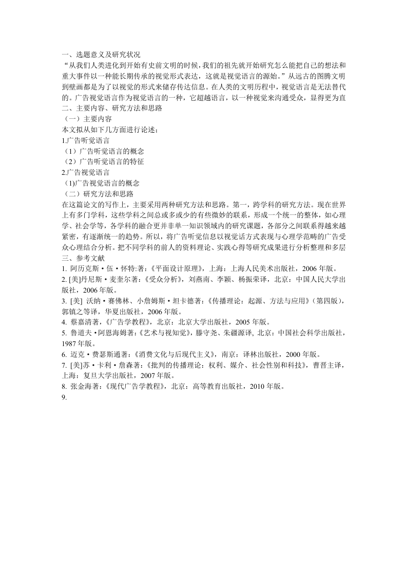 一、选题意义及研究状况“从我们人类进化到开始有史前文明的时候,我们的祖先就开始研究怎么能把自己的想法和重大事件以一种能长期传承的视觉形式表达,这就是视觉语言的源始。”从远古的图腾文明到壁画都是为了以视觉的形式来储存传达信息。在人类的文明历程中,视觉语言是无法替代的。广告视觉语言作为视觉语言的一种,它超越语言,以一种视觉来沟通受众,显得更为直二、主要内容、研究方法和思路(一)主要内容本文拟从如下几方面进行论述:1.广告听觉语言(1)广告听觉语言的概念(2)广告听觉语言的特征2.广告视觉语言(1)广告视觉语言的概念(二)研究方法和思路在这篇论文的写作上,主要采用两种研究方法和思路。第一,跨学科的研究方法。现在世界上有多门学科,这些学科之间总或多或少的有些微妙的联系,形成一个统一的整体,如心理学、社会学等,各学科的融合更并非单一知识领域内的研究课题,各部分之间联系得越来越紧密,有逐渐统一的趋势。所以,将广告听觉信总以视觉话方式表现与心理学范畴的广告受众心理结合分析。把不同学科的前人的资料理论、实践心得等研究成果进行分析整理和多层三、参考文献1.阿历克斯·伍·怀特:著:《平面设计原理》,上海:上海人民美术出版社,2006年版。2.[美]丹尼斯·麦奎尔著:《受众分析》,刘燕南、李颗、杨振荣译,北京:中国人民大学出版社,2006年版。3.[美]沃纳·赛佛林、小詹姆斯·坦卡德著:《传播理论:起源、方法与应用》(第四版),郭镇之等译,华夏出版社,2006年版。4.蔡嘉清著,《广告学教程》,北京:北京大学出版社,2005年版。5.鲁道夫·阿恩海姆著:《艺术与视知觉》,滕守尧、朱疆源译,北京:中国社会科学出版社,1987年版。6.迈克·费瑟斯通著:《消费文化与后现代主义》,南京:译林出版社,2000年版。7.[美]苏·卡利·詹森著:《批判的传播理论:权利、媒介、社会性别和科技》,曹晋主译,上海:复旦大学出版社,2007年版。8.张金海著:《现代广告学教程》,北京:高等教育出版社,2010年版。9