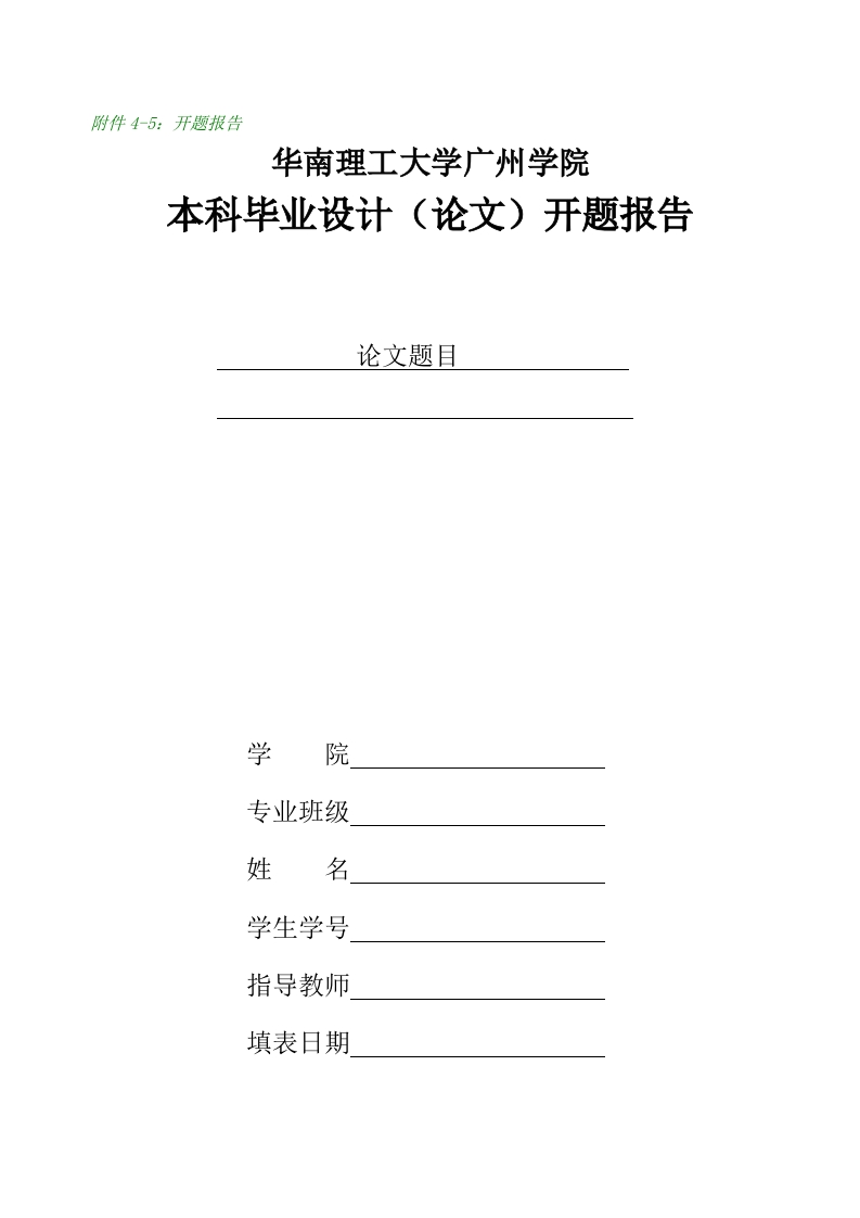附件4-5:开题报告华南理工大学广州学院本科毕业设计(论文)开题报告论文题目学院专业班级姓名学生学号指导教师填表日期说明1.开题报告是保证毕业设计(论文)质量的一个重要环节,为规范毕业设计的开题报告,特印发此表。2.学生应在开题报告前,通过调研和资料搜集,主动与指导教师讨论,在指导教师的指导下,完成开题报告。3.此表一式三份,一份交学院装入毕业设计(论文)档案袋,一份交指导教师,一份学生自存。4.选题需经基层教学单位(专业教研室)讨论审核、二级学院主管院长批准、报教务处备案,方可正式进入下一步毕业设计(论文)阶段。姓名开题时间学院专业班级指导教师(导师组)论文题目中文外文1.选题的背景和意义2.研究目标、内容(论文提纲)及拟解决关键问题3.研究方法及技术路线4.研究工作基础5.主要参考文献及出处(10篇以上)指导教师(导师组)意见:审查小组意见:签名:审查小组负责人(签名):年月日年月日备注:1、要有10篇以上相关文章的阅读量。2、理、工科开题报告撰写要求在2500字左右,人文社科开题报告在3500字左右,包括论文选题的背景和意义、工作任务分析、调研报告、方案拟定与分析、毕业论文撰写提纲及实施计划、文献综述(理、工科可不提交文献综述)等。3、电脑打印,用A4纸,内容为小四号宋体,行距为固定值20磅。4、文献综述(按文献综述格式打印)附在开题报告后面一起装订。