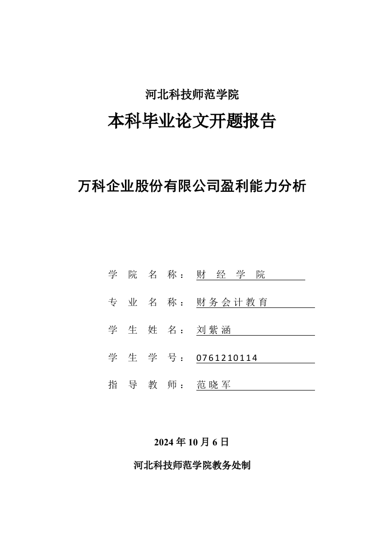 河北科技师范学院本科毕业论文开题报告万科企业股份有限公司盈利能力分析学院名称:财经学院专业名称:财务会计教育学生姓名:刘紫涵学生学号:0761210114指导教师:范晓军2024年10月6日河北科技师范学院教务处制一、课题来源)指导教师指定(√)学生自拟课题二、主要依据2.1研究背景房地产行业是我国当前盈利能力最高的行业之一,对于人类来说也是最不可缺少的行业之一。从我国的经济市场来看,房地产行业已经成为了我国国内的经济支柱,是我国经济体系中不可缺少的一部分。而且随着我国人民生活水平的不断提高和人数的不断增多,对于房地产行业的需求也不断增多,因此我国房地产行业在市场需求的推动下得到了飞速的发展。但是在发展过程中,我国房地产行业明显的出现了畸形,对于土地的大量购买开发,房地产存货较多以及房价的大量炒作都是房地产行业快速发展所带来的问题。万科股份企业有限公司作为房地产的龙头企业,在房地产行业的快速发展和经营环境的变化中也受到了一定的影响。由于企业的快速扩张和经营环境的恶化,万科股份企业有限公司在企业盈利能力方面也出现了下降。例如成本费用的增多,存货周转率的下降,现金利用率的降低和资金周转压力较大等问题都影响着企业的盈利能力。作为房地产的龙头企业都受到了一定程度的影响,其他房地产企业必然也会受到更大程度的影响。2.2研究意义随着市场化,信息化,和全球化步伐的加快,中国经济进入新常态,经济增速由高速向中低速转变,复杂多变的商业环境对企业的生存与发展提出了更多的挑战,不少企业陷入了增长困境,产能过剩,销售增长而利润增长停滞,削减成本并未带来更好的业绩,创新屡屡失败。面对如此困境,企业决策者开始探索和反思实现企业持续盈利性增长的路径,来提高自己的核心竞争力以谋求长期可持续发展,因此本研究有一定的理论意义。本文的研究意义在于通过对于万科股份企业有限的盈利能力存在的问题进行分析,进而掌握我国房地产行业存在的普遍问题。其次通过对于万科股份企业有限公司近几年的财务数据分析找到问题的根源,从而做出相应的解决措施。2.3国内外研究现状2.3.1国外研究现状国外对企业进行盈利能力分析研究较早,早在19世纪以前就己出现对家族企业的盈利能力分析,但由于这些企业的规模较小,故对他们进行盈利能力分析以观察代替了评价。但经过近百年的发展,西方国家对企业盈利能力分析的方法与技术都得到不断地完善与发展。2.3.1.1关于盈利指标的研究Nguyen(2020)采用了证券交易所1343家上市公司2013-2019年的相关数据。首先,根据公司的性质和类型,将公司分为国有企业、集体企业、私营企业和个体企业四类。其次,分析了资产收益率、净资产收益率和销售收益率这三种不同的比率对该公司盈利能力的影响。Husain(2020)研究了基于2014-2018年印尼股市汽车零部件制造商的财务数据,拟对企业的资本回报率进行量化,并结合活跃度、流动性、偿付能力、市场前景等其他财务指标,选取市盈率和托宾O比作为量化指标,对企业价值进行量化②。Venkateswararao.Podile等(2018)尝试对Nagas Elastomer Works进行盈利能力分析,通过分析各种利润率、与投资相关的盈利能力比率以及与各种费用相关的盈利能力比率来进行盈利能力分析。2.3.1.2盈利能力与企业资源关系的研究JayB.Barney(1991)指出企业的资源是其获得持续竞争优势和盈利能力的关键因素。企业拥有的独特资源,如技术、品牌、人才、管理能力等,能够为企业带来独特的价值和竞争优势,从而影响企业的盈利能力。例如,拥有先进技术的企业可以生产出更优质、高效的产品,进而获得更高2.3.2国内研究现状2.3.2.1房地产领域盈利能力的研究杨逸颗(2022)认为房地产企业被视为国家国民经济发展中至关重要的支柱产业,是国家宏观调控的重要目标之一。与其他行业相比,房地产企业受到政府政策的影响更为深远。笪云霞(2023)认为房地产行业开发周期长,收款速度慢,需要大量资金维持项目和企业运行,存在较大风险,应巩固主营业务核心地位,优化产品结构,转型升级,分散风险,提高经营能力阿。刘华杰(2021)通过对某房地产上市公司的研究,发现企业盈利能力存在生产成本高、行业竞争较大和销售能力弱的问题,需要制定科学合理的计划、加强应收账款管理、减少公司成本、加强公司销售能力等措施提高企业的获利能力,进一步提高企业的经济效益,促进企业更好地发展下去2.3.2.1企业提升盈利能力的研究姬潮心等(2022)以小米集团为例,对其收入、成本、费用和利润等单一指标分析其盈利能力。认为企业在厂房、生产线等“重资产”方面的投入较少,将资金放在产品创新和研发方面这样的选择使得企业在日新月异的互联网科技行业中随时保持其产品先进性,更是强化了整个企业的创新意识,时刻保持关键项目有足够资源供应,从根本上提高企业的核心竞争力。孙玉忠等(2022)选取三只松鼠财务报表数据,从企业营业、资产和资本三个角度,采用杜邦分析法逐步分析企业盈利能力。认为企业可以通过优化成本控制、加快资产周转、合理调整负债三个方面提升盈利能力。罗亚青(2024)通过分析九阳股份2018一2022年财务报表,发现销售净利率、总资产周转率和权益乘数等关键指标的变动情况,评估了其盈利能力