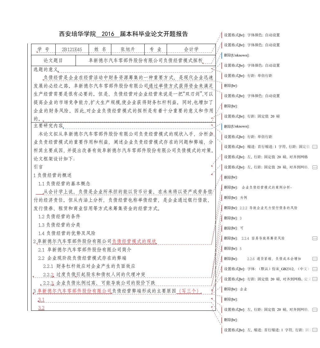 西安培华学院2016届本科毕业论文开题报告设置格式br:字体颜色:自动设置设置格式b:字体颜色:自动设置学号2B121E45姓名张旭升业会计学删除Unknown:论文题目阜新德尔汽车零部件股份有限公司负债经营模式探析设置格式br:字体颜色:自动设置选题的意义负债经营是企业在经营活动中财务资源筹集的一种重要方式,是现代企业迅速设置格式r:行距:单倍行距发展的必经之路。阜新德尔汽车零部件股份有限公司通过举债方式获得资金来满足删除br小:生产经营需要是很有必要的。但是,负债经营对企业经营来说是一把“双刃剑”,可以设置格式br小:字体颜色:自动设置提高企业的市场竞争能力,扩大生产规模,使企业获得财务杠杆利益。同时,也增加了企业的财务凤险。因此,对企业负债经营模式的探析是有着十分重要的意义和作用设置格式r:行距:固定值20磅刑除Unknown]:本论文拟从阜新德尔汽车零部件股份有限公司负责经营模式的现状入手,分析色设置格式br小:行距:单倍行距业负责经营模式的重要作用和利益,阐述企业负责经营模式存在的问题和弊端,分设置格式b:缩进:首行缩进:1字符,行距:固定值回析其主要成因,并提出改善有效阜新德尔汽车零部件股份有限公司负债模式的对策论文框架设计如下:设置格式br:左.行距:固定值20磅.对齐到网格引言1设置格式br:左,行距:固定值20磅,对齐到网格,回1负债经营的概述1.1负债经营的基本概念删除b小:企业负债经营模式的案例分析-从会计学上说,负债是企业所承担的能以货币计量、在未来将以资产或劳务偿付的经济责任。但从内涵上分析,负债经营也称举债经营,是企业通过银行借款、删除br小:为例发行债券、租赁和商业信用等方式来筹集资金的经营方式。删除br:2.2.2导致企业无力偿付债务的风险1.2负债经营的条件1.3负债经营的分类1.4负债经营的优势及风险2阜新德尔汽车零部件股份有限公司负债经营模式的现状删除br:2.2.4容易导致再筹资风险2.1阜新德尔汽车零部件股份有限公司简介2.2企业现阶段负债经营模式存在的弊端2.2.6通货紧缩,负债成本会增加2.2.1财务杠杆效应对企业产生的负面效应设置格式b:字体:(默认)仿宋GB2312,(中文)回:.2.22过度负债引起股东和债权人间的代理冲突设置格式b:行距:固定值20磅,对齐到网格,定义回,223企业负债比例过高,.可能导致公司的股价下联?阜新德尔汽车零部件股份有限公司负债经营弊端形成的主要原因(写三个)设置格式br:左,行距:固定值20磅,对齐到网格,回设置格式b小:左,缩进:首行缩进:1字符,行距:固回3.3删除b:2.4分析与总结4,阜新德尔汽车零部件股份有限公司负债经营模式的策略建议设置格式b:左,行距:固定值20磅.对齐到网格.四41加强把握负债经营的科学规模管理,科学确定企业最优资本结构42.充分分析并增强企业的偿债能力43.制定科学资金利用制度,建立合理的财务分析指标体系结论拟采用的研究方法:删除br小:3拟采用文献分析法收集企业负债经营模式的相关资料。拟采用规范分析法,推理分析企业负债经营模式存在的相关问题,并以阜新德尔汽车部件股份有限公司为例。拟采用实证分析法,通过查阅资料、实地调研,结合会计学专业知识撰写论文,设置格式b:左,行距:固定值20磅,对齐到网格工作进度安排:设置格式b:行距:单倍行距1.2016.03.01一2016.03.08提交论文大纲与开题报告设置格式br小:行距:固定值20磅2.2016.03.09一2016.04.05提交并审改初稿3.2016.04.06一2016.04.19提交并审改修改稿设置格式b小:字体颜色:自动设置4.2016.04.20一2016.04.26审定并提交终稿设置格式b:行距:单倍行距主要参考文献目录设置格式br:行距:固定值20磅[1]邹万寿.企业负债经营及风险控制[凹.环球市场信息导报,2014,(33)设置格式br小:字体颜色:自动设置2]季珊珊.企业负债经营及风险形成因素分析J.经营管理者,2014,(08)[3]杜学军.企业负债经营的风险及其防范对策探讨U.现代经济信息,2014,(19)设置格式br:字体颜色:自动设置[4]杨晓童.对我国企业负债经营问题探讨U.商场现代化,2014,(19)[⑤苗秀锋.关于企业负债经营的财务思考).中国总会计师,2013,(09)设置格式br:字体颜色:自动设置[⑤]夏凡,王妍.我国中小企业负债经营的现状与对策分析.商场现代化,2015,(15)设置格式br:左,行距:固定值20磅[7)赵聚辉,于冲.房地产企业高负债率经营模式的解析).中国管理信息化,2014,(18)带格式表格br][8)杜学军.企业负债经营的风险及其防范对策探讨[.现代经济信息,2014,(19)刑除Unknown]:[9邱道欣.我国企业负债经营的现状与对策分析凹.开发研究,2013,(4)[10]陈蕾.企业负债经营的分析[U.企业导报,2015,(14)设置格式b:左,行距:单倍行距,对齐到网格[11]王满.基于零息负债的高财务杠杆经营模式探析一以格力电器为例[.会计之友,·设置格式b左,行距:单倍行距2014,(3)指导教师意见(包括论文选题、研究内容、创新性、研究方法、工作进度安排等是否符合要求,是否同意开题等):设置格式r:字体颜色:自动设置你的文件格式很乱,这次我替你改了没有下次设置格式b小:两端对齐,行距:单倍行距,对齐到网格回为你看清哪些地方有改动,我用的是修订(审阅)的方法,表格左边的竖线是修逐状态下出现的,不用担心。先看清楚我改了哪里之后,接受我对你文档的所有修订,设置格式br:行距:单倍行距竖线自会消失,红字也会变黑,接着再在文档上添加或删除内容。最后删掉这段话设置格式br小: