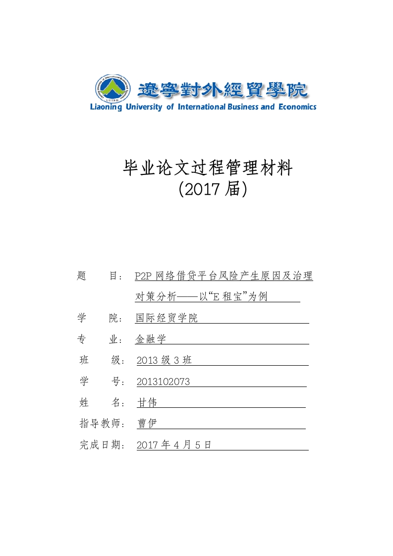 Liaoning University of International Business and Economics毕业论文过程管理材料(2017届)题目:P2P网络借贷平台风险产生原因及治理对策分析一以“E租宝”为例学院:国际经贸学院专业:金融学班2013级3班学2013102073姓名:甘伟指导教师:曹伊完成日期:2017年4月5日辽宁对外经贸学院本科毕业论文任务书姓名甘伟学号2013102073学院国际经贸学院专业金融学年级班级2013级3班指导教师曹伊论文题目P2P网络借贷平台风险产生原因及治理对策分析一以“E租宝”为例当前P2网络借贷平台正处于发展阶段,野蛮竞争的环境下暴露诸多问题。本文任务和目标以研究P2P网络借贷平台当前问题为主,意义在于揭露并对问题提出对策,用以解决问题。已达到促进P2P健康发展的目的,1.有明确的研究对象和确定的研究主题:2.有确定的问题和解决问题的方案;3.选题后应进行毕业论文的文献综述和开题报告:4.内容充实,有逻辑性,结构合理;基本要求5理论联系实际,所提结论或建议对实际部门有应用价值和指导意义:6.字数一般不少于8000字;7统一规范的格式;8.有自主独到的分析、方法、思路和观点:9.必须是本人独立完成,有自己大量工作,论文工作量至少有五个月以上。1.图书馆:用以查询与P2P相关的必要文献与知识:2.互联网:用以弥补在图书馆中无法查阅到的文献与内容;研究所需条件3.市场考察:观察市场(身边)发生的关于P2P网络借贷产生的问题:4.计算机,手机等其他硬件设备。序号主要任务起止时间1启动工作2016.9.19-2016.10.232选题、任务书撰写2016.10.24-2016.11.63开题报告撰写2016.11.7-2016.11.30任务进度安排4完成初稿2016.12.1-2017.1.315完成二稿2017.2.1-2017.2.286成稿上交2017.3.1-2017.4.57指导教师签字日期年月日系主任签章日期年月日