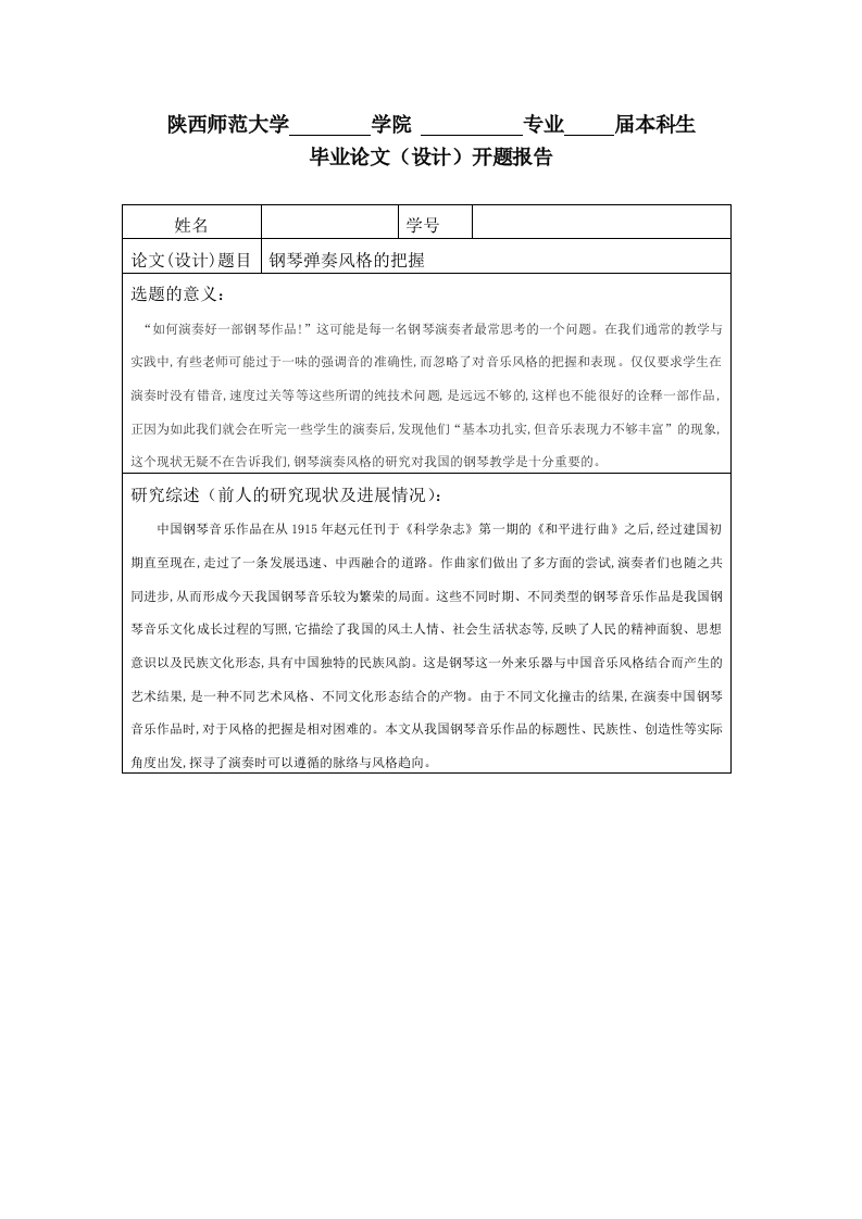 陕西师范大学学院专业届本科生毕业论文(设计)开题报告姓名学号论文(设计)题目钢琴弹奏风格的把握选题的意义:“如何演奏好一部钢琴作品:”这可能是每一名钢琴演奏者最常思考的一个问题。在我们通常的教学与实践中,有些老师可能过于一味的强调音的准确性,而忽略了对音乐风格的把握和表现。仅仅要求学生在演奏时没有错音,速度过关等等这些所谓的纯技术问趣,是远远不够的,这样也不能很好的诠释一部作品,正因为如此我们就会在听完一些学生的演奏后,发现他们“基本功扎实,但音乐表现力不够丰富”的现象,这个现状无疑不在告诉我们,钢琴演奏风格的研究对我国的钢琴教学是十分重要的。研究综述(前人的研究现状及进展情况):中国钢琴音乐作品在从1915年赵元任刊于《科学杂志》第一期的《和平进行曲》之后,经过建国初期直至现在,走过了一条发展迅速、中西融合的道路。作曲家们做出了多方面的尝试,演奏者们也随之共同进步,从而形成今天我国钢琴音乐较为繁荣的局面。这些不同时期、不同类型的钢琴音乐作品是我国钢琴音乐文化成长过程的写照,它描绘了我国的风土人情、社会生活状态等,反映了人民的精神面貌、思想意识以及民族文化形态,具有中国独特的民族风韵。这是钢琴这一外来乐器与中国音乐风格结合而产生的艺术结果,是一种不同艺术风格、不同文化形态结合的产物。由于不同文化撞击的结果,在演奏中国钢琴音乐作品时,对于风格的把握是相对困难的。本文从我国钢琴音乐作品的标趣性、民族性、创造性等实际角度出发,探寻了演奏时可以遵循的脉络与风格趋向。论文(设计)写作提纲(除题目外,具体到三级标题)引言一、钢琴弹奏风格概述(一)钢琴弹奏风格(二)钢琴弹奏风格的把握二、钢琴弹奏风格的把握(一)不同钢琴弹奏的不同风格1、弹奏风格的确立2、不同弹奏风格的实现3、基本训练技巧(二)弹奏风格的界定三、结论四、参考文献特色与创新之处:本文在研究过程中研究的最大特色在于结合实际探讨钢琴弹奏风格的把握,通过钢琴弹奏风格与钢琴弹奏技巧的结合,分析了在钢琴弹奏过程中如何实现钢琴弹奏风格的打造。将理论研究与实际弹奏应用相结合,是本文研究最大的创新之处。拟采用的研究方法和技术路线:文献资料研究法,案例分析法,对比分析法研究工作进度安排:本文拟完成的研究进度时间为2011年12月20日-2012年2月25日。1、2011年12月上旬:前期准备阶段查阅与本课趣研究相关的文献、资料等。2、2011年12月20日-2012年1月5日:开趣报告提交3、2012年1月5日-2012年2月10日:论文大纲和初稿的形成阶段4、2012年2月12日-2012年2月20日:论文修改、定稿阶段5、2012年2月28日前交论文终稿。按照导师意见进行论文最后修改,打印并装订成册,完成论文。主要参考文献目录:宋蜡,试论中国钢琴音乐作品中的演奏一音乐风格的把握,辽宁师专学报,2010年第6期。杨相勇,“小节线与节拍”在把握钢琴作品演奏风格中的作用,音乐创作,2009年第5期。指导教师意见:签名:年月日教研室主任意见:签名:年月日