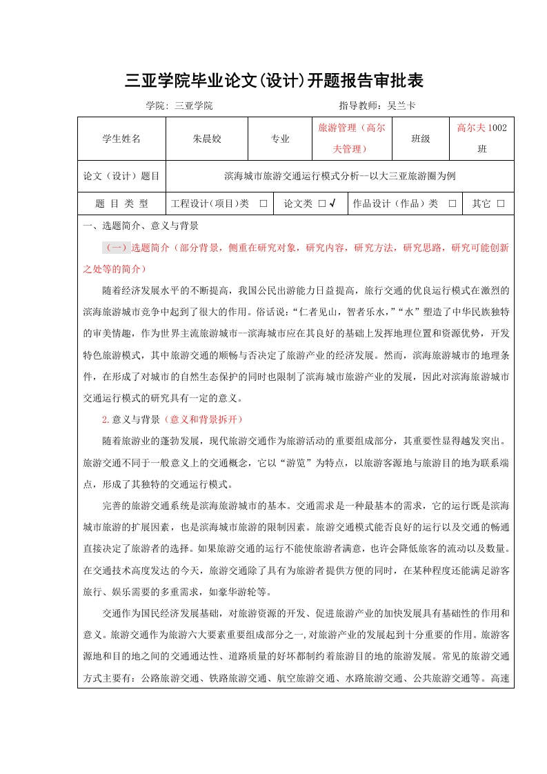 三亚学院毕业论文(设计)开题报告审批表学院:三亚学院指导教师:吴兰卡旅游管理(高尔高尔夫1002学生姓名朱晨姣专业班级夫管理)班论文(设计)题目滨海城市旅游交通运行模式分析一以大三亚旅游圈为例题目类型工程设计(项目)类口论文类口√作品设计(作品)类其它口一、选题简介、意义与背景(一)选题简介(部分背景,侧重在研究对象,研究内容,研究方法,研究思路,研究可能创新之处等的简介)随着经济发展水平的不断提高,我国公民出游能力日益提高,旅行交通的优良运行模式在激烈的滨海旅游城市竞争中起到了很大的作用。俗话说:“仁者见山,智者乐水,”“水”塑造了中华民族独特的审美情趣,作为世界主流旅游城市-一滨海城市应在其良好的基础上发挥地理位置和资源优势,开发特色旅游模式,其中旅游交通的顺畅与否决定了旅游产业的经济发展。然而,滨海旅游城市的地理条件,在形成了对城市的自然生态保护的同时也限制了滨海城市旅游产业的发展,因此对滨海旅游城市交通运行模式的研究具有一定的意义。2.意义与背景(意义和背景拆开)随着旅游业的蓬勃发展,现代旅游交通作为旅游活动的重要组成部分,其重要性显得越发突出。旅游交通不同于一般意义上的交通概念,它以“游览”为特点,以旅游客源地与旅游目的地为联系端点,形成了其独特的交通运行模式。完善的旅游交通系统是滨海旅游城市的基本。交通需求是一种最基本的需求,它的运行既是滨海城市旅游的扩展因素,也是滨海城市旅游的限制因素。旅游交通模式能否良好的运行以及交通的畅通直接决定了旅游者的选择。如果旅游交通的运行不能使旅游者满意,也许会降低旅客的流动以及数量。在交通技术高度发达的今天,旅游交通除了具有为旅游者提供方便的同时,在某种程度还能满足游客旅行、娱乐需要的多重需求,如豪华游轮等。交通作为国民经济发展基础,对旅游资源的开发、促进旅游产业的加快发展具有基础性的作用和意义。旅游交通作为旅游六大要素重要组成部分之一,对旅游产业的发展起到十分重要的作用。旅游客源地和目的地之间的交通通达性、道路质量的好坏都制约着旅游目的地的旅游发展。常见的旅游交通方式主要有:公路旅游交通、铁路旅游交通、航空旅游交通、水路旅游交通、公共旅游交通等。高速铁路旅游交通是铁路旅游交通中的一个重要组成部分,其也是一种新兴的旅游交通方式,它是伴随着我国高速铁路建设的大力发展而兴起的。二、文献综述(分两大部分,理论基础和研究现状(国内外研究))1.国内文献综述,旅游交通的文献特别多,数百篇都不止,需要好好综述,不能随便放几篇上来!随着旅游业的蓬勃发展,现代旅游交通作为旅游活动的重要组成部分,其重要性显得越发突出。旅游交通不同于一般意义上的交通概念,它以“游览”为特点,以旅游客源地与旅游目的地为联系端点,形成了其独特的交通运输体系。该体系既包括了旅游客源地与旅游目的地间的往返式的大旅游交通,也包括了旅游目的地区域内的小旅游交通现有的大旅游交通方式主要包括公路、铁路、航空、水运四种。罗景峰在《基于灰局势决策的旅游交通方式优选研究》一文中指出企业制定旅游产品及旅游者出游之前的首要任务都是选择旅游交通方式。这可归结为一种多指标优选决策问题,该问题可描述为旅游交通方式选择是一个受运速、运价、舒适性、游览性、灵活性以及安全性等因素约束的多指标优选决策问题。王鑫在《太原市旅游交通现状与对策研究》文章中写出游交通是联系旅游者与旅游对象,定居地与目的地的重要环节,在旅游主、客体之间起着桥梁和纽带作用。只有搞好旅游交通规划建设,才能发挥出太原旅游资源的整体效应,同时促进整个地区经济文化和社会发展。旅游者的涌入,是检验一个城市通达性的重要衡量指标。而城市通达性则是一个成熟城市旅游体系的核心要素之一。梁斐雯所写的《云南旅游交通网络空间布局与优化对策》文章中说旅游者出行行为对交通系统的影响、交通与旅游需求的相互影响、交通与旅游目的地相互关系及旅游交通规划研究,但是从区域旅游交通网络入手对旅游业与交通系统进行分析还处于起步阶段。张学梅也在《自驾车旅游交通行为分析》说过:随着旅游市场需求逐步呈现出差异化、复杂化和个性多样化的特征,使得近几年蓬勃兴起的特种旅游(包括自驾车旅游)方兴未艾,呈快速发展之势,逐渐成为当代旅游业发展的新动力。宫连虎写的《旅游交通研究现状与趋势探析》一文中提出:旅游交通作为连接旅游者与旅游目的地之间的纽带,逐渐成为国内外研究的热门话题。国外对旅游交通的研究主要包括旅游者出行行为、交通与旅游需求相互影响、交通与旅游目的地相互关系以及旅游交通规划等方面的研究:而我国对旅游交通的研究主要集中于基础理论研究、规划理论及应用研究、管理研究、旅游与交通的关联性研究以及其他方面。在最后提出了要在综合交通视角下研究旅游交通、要从战略高度重视旅游交通研究的观点以及低碳旅游交通这一发展趋势。于行行在《旅游交通发展存在的问题及其前景分析》文中提出,旅游交通是旅游业的重要组成部分。从旅游交通概念及其方式构成的研究入手,提出了旅游交通是指满足旅游者