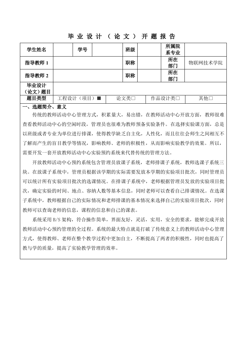 毕业设计(论文)开题报告学生姓名学号班级所属院系专业指导教师1职称所在部门物联网技术学院指导教师2职称所在部门毕业设计(论文)题目题目类型工程设计(项目)■论文类口作品设计类口一、选题简介、意义传统的教师活动中心管理方式,积累量大,易出错,在教师活动中心开放方面,教师很难查看教师活动中心的空闲时段,管理员也很难为教师预备实验条件。在选择实验课方面,总是以班级或者专业为单位进行排课,使得教学缺乏自主化,人性化,而且往往会师生之间相互不了解而产生的盲目教学等情况,影响教师、老师的积极性,从而影响实验教学的效果。所以,需要开发一套开放教师活动中心实验预约系统来代替传统的管理方法。开放教师活动中心预约系统包含管理员放课子系统,老师排课子系统,教师选课子系统三块。在放课子系统中,管理员根据该学期的实际需要发放本学期的实验项目批次,同时管理员可以统计所有实验项目批次的选课情况。在排课子系统中,老师根据管理员发放的实验项目批次,确定实验的时间、地点、容纳人数等基本信息,同时老师可以查看自己排课情况。在选课子系统中,教师根据自己的实际情况和老师排课的基本情况来选择自己的实验项目批次,同时教师可以查询老师的信息,课程的信息和自己的课表。系统采用B/S架构,符合操作简单,界面友好,灵活,实用,安全的要求,能够完成开放教师活动中心预约管理的全过程。系统的最大特点就是打破了传统意义上的教师活动中心管理方式,使得教师、老师在整个教学过程中更加自主,不断提高了两者的积极性,同时也提高了教与学的质量,提高了实验教学管理的效率。二、课题综述(课题研究,主要研究的内容,要解决的问题,预期目标,研究步骤、方法及措施等)1.课题研究及主要研究内容通过计算机网络实现管理员在线管理教师活动中心的使用情况,老师在线管理某个实验批次的时间,地点和容纳人数,教师在线选择自己喜欢的实验项目。可以说它是一个中转站,为学校的实验管理工作带来了极大的便利。实验预约系统将具有良好的开放性、扩展性、完善的系统功能,能全面满足对教师活动中心大量信息进行管理及教学交流等需求。整个应用软件系统既为教师提供了一个简单易用的浏览界面,也为管理员提供了一个通用的、友好的、易扩展的管理界面,并对以后进一步扩大管理系统的规模提供了良好的建设平台,具有很好的灵活性。教师活动中心预约管理系统包括6大方面:可排课信息管理,人员信息管理,排课信息管理,选课信息管理,课程信息管理,系统管理。每一部分都是本系统的重要部分,能够最大限度的发挥作用,为学校的教师活动中心管理提供支持。2.预期目标建立一个合理的教师活动中心预约管理系统,从而能够对教师活动中心使用做完善的管理,使教师活动中心管理更加科学规范,并能根据系统提供的准确信息进行适当的调整,使学校的管理更有条理化。学校的教师活动中心管理是学校管理的一个非常重要的组成部分。但它是一项繁琐又要求操作人员小心细致的工作。几十年前的手工操作不但效率低下,而且容易出错,所以无法胜任这项工作了。最初的教师活动中心管理,都是靠人力来完成的。当学校的教育规模小的时候,人力可以完成,随着学校的规模越来越大,教学工作越来越复杂,依然维持人力进行教师活动中心管理,必然会造成工作效率低,工作错误增高的问题。在这种情况下,一个可以规范化,自动化的教师活动中心预约管理系统显得非常重要。3.研究方法、措施通过对以前管理系统和对现在信息化管理理念的认识,而且对学校的管理也认识不少,知道系统大体的功能流程,那么可以很快地开发出教师活动中心管理系统,从而减少管理员的工作量将是一个可做的事情。2二、设计(论文)体系、结构(大纲)前-1-第一章开放教师活动中心预约管理系统概述2-第一节开发系统背景.第二节系统目标2-第三节论文的主要工作4-第四节本章小结4-第二章需求分析…第一节总体需求分析第二节可行性分析…一、技术可行性…6-二、经济可行性.6-三、操作可行性…1四、开发环境可行性7-第三节应用现状调查.…7第四节业务流程需求分析8-第五节运行环境需求第六节本章小结…9-第三章系统分析与设计10-第一节总体设计10-第二节系统功能分析…一、图形工具12-二、系统的逻辑模型16-第三节详细设计.20-一、程序流程图.21-二、数据库设计.22-第四节本章小结第四章系统实现25-第一节实现工具.25-一、PHP5动态语言…25-二、Mysql数据库25-三、开发平台26-四、数据库系统工作结构图,26-第二节功能实现.27-第三节本章小结29-第五章测试与维护30-第一节测试结果30-一、后台登陆模块30-二、前台主界面模块30-三、后台主界面模块35-第二节本章小结.…结论…38-39-参考文献40-3