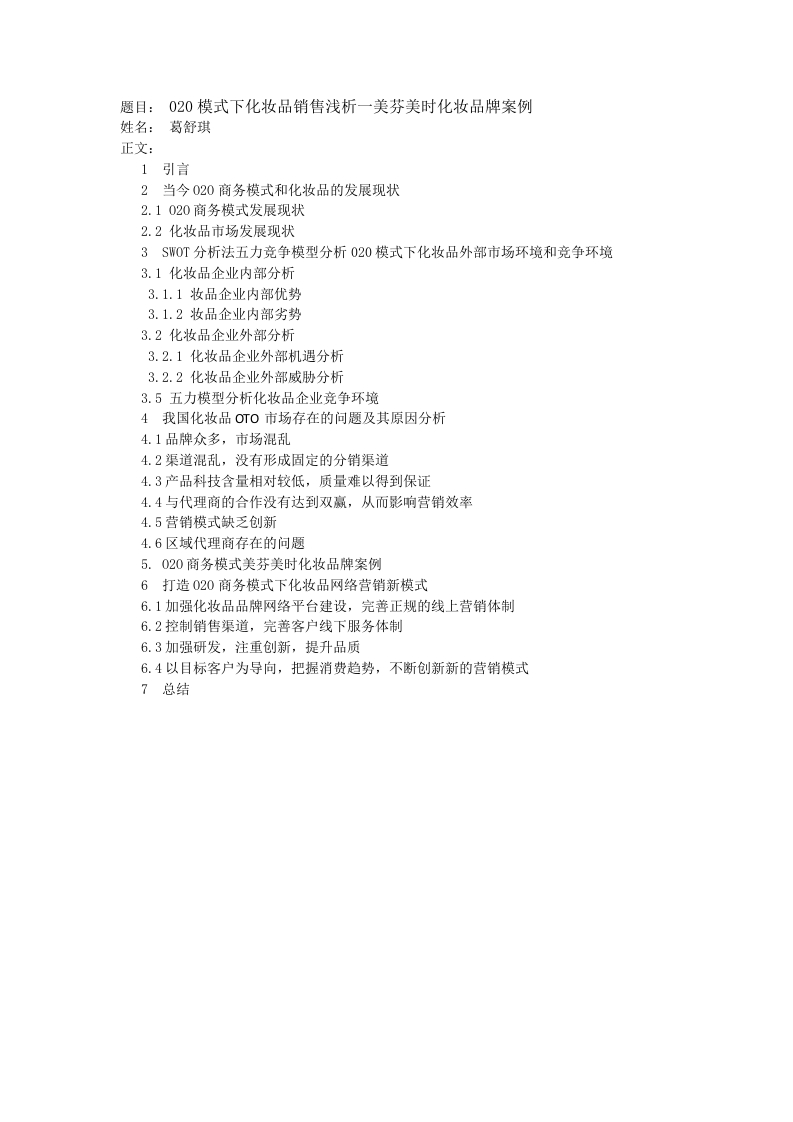 题目:020模式下化妆品销售浅析一美芬美时化妆品牌案例姓名:葛舒琪正文:1引言2当今020商务模式和化妆品的发展现状2.1020商务模式发展现状2.2化妆品市场发展现状3SW0T分析法五力竞争模型分析020模式下化妆品外部市场环境和竞争环境3.1化妆品企业内部分析3.1.1妆品企业内部优势3.1.2妆品企业内部劣势3.2化妆品企业外部分析3.2.1化妆品企业外部机遇分析3.2.2化妆品企业外部威胁分析3.5五力模型分析化妆品企业竞争环境4我国化妆品OT0市场存在的问题及其原因分析4.1品牌众多,市场混乱4.2渠道混乱,没有形成固定的分销渠道4.3产品科技含量相对较低,质量难以得到保证4.4与代理商的合作没有达到双赢,从而影响营销效率4.5营销模式缺乏创新4.6区域代理商存在的问题5.020商务模式美芬美时化妆品牌案例6打造020商务模式下化妆品网络营销新模式6.1加强化妆品品牌网络平台建设,完善正规的线上营销体制6.2控制销售渠道,完善客户线下服务体制6.3加强研发,注重创新,提升品质6.4以目标客户为导向,把握消费趋势,不断创新新的营销模式7总结