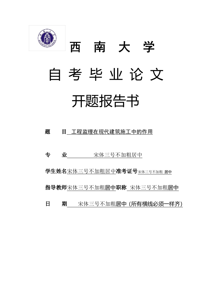 西南大学自考毕业论文开题报告书题目工程监理在现代建筑施工中的作用专业宋体三号不加粗居中学生姓名宋体三号不加粗居中准考证号宋体三号不加粗居中指导教师宋体三号不加粗居中职称宋体三号不加粗居中日期宋体三号不加粗居中(所有横线必须一样齐)论文(设计题)工程监理在现代建筑施工中的作用课题的根据:一、说明本课题的理论、实际意义1.理论意义安全问题己成为阻碍工程建设业平稳正常发展的最大阻力。现阶段,政府行政主管部门己颁和修改了关于工程施工安全和施工技术标准的法律法规。相关监管机构时不时对建筑施工实施多种专项整改活动,促进了现场施工作业工人规范作业、机械设备的安全使用以及施工环境安全得到保障[]。安全事故发生的数量和造成的死亡人数居持续上升,严重威胁到施工人员的人身安全及建筑企业的切身利益[2]。现阶段,工程监理制度在开展安全监理过程中依然遇到许多困境。其一,相关法规对于监理制度中关于安全施工的环节编制任务没做到位,在工程监理制度长期的实行中,工程监理的首要任务是保证质量、减少投资和控制进度,但对其在工程施工中的安全职责和具体要求却未详细提及:再次,安全监理理论系统还不齐全,安全施工过程中监理相关的法律规定不够完善,不能高效地履行监理单位的安全职能。2.实际意义近年来,由于我国工程施工安全生产形势不容乐观、旧的安全管理体系已跟不上步伐以及有效安全施工管理的水平偏低等问题。现阶段,《建设工程安全生产管理条例》明确规定了工程监理单位对工程安全施工中起到的责任,把安全监理视为工程监理重要工作内容。这便对监理从业人员对于施工现场安全监理的监管方法、监理手段和监理效率等提出了更高的要求。由此可见,立即实施开展建设工程安全监理刻不容缓。二、综述国内外有关本课题的研究动态和自己的见解(一)国内外研究现状一)国内外研究动态九十年代,迈克尔.哈默博士提出了业务流程再造的理念引发了一场世界性的再造浪潮。哈默和C$C顾问公司的杰姆斯.钱皮联名出版了《业务流程再造工商管理革命宣言》,定义流程再造为“对企业的业务流程做根本性的重新考虑和彻底的重新设计,使企业在成本、质量、服务和速度等方面取得显著的改善”。他注重彻底型的改造,强调再造不是改良,而是革命,已取得企业表现的迅速提高。目前,在关于工程监理行业的研究中较多的集中在信息技术的引入上,如王玮(2013)《基于J2EE的信息工程监理进度控制系统的研究》,朱云(2015)《J2EE技术在分步式信息工程监理系统中的理论与应用研究》等。也有学者对工程监理涉及的法律问题进行了研究,如李晓阳(2016)《建设工程监理的法律责任》等。部分学者对工程监理行业的风险问题进行了研究。如林静(2014)《工程监理投标项目在投标过程中的风险管理研究一一以广州新洲至化龙快速路工程监理项目为例》等。部分学者将其他方面的理论引入工程监理2行业的研究,如项勇,任宏的《信息不对称下工程监理激励与监控分析》,郭涛,刘晓君的《基于博弈论的工程监理问题再分析》,秦旋的《工程监理制度下的委(三)自己见解本文主要篇幅着重于研究工程建筑施工中易发的安全事故及对应的施工环节。首先对易发的安全事故进行介绍,指出其易造成的伤害危险:其次通过查询文献和资料,找出相关的安全事故案例,分析其发生的原因,并对于监理在本次事故中的失职进行剖析:接着对于易发事故发生原因和相关案例进行总结归纳,阐述工程监理单位在预防和避免安全事故发生中的职责,最终达到安全施工的效果6)]。在分析安全事故后,本文最后对于监理在建筑施工中如何确保安全生产提出几点建议,从政府主管部门的宏观调控、相关法规的修订与完善及有效地沟通协调机制的建立等方面进行阐述,以达到安全高效施工的最终目的。