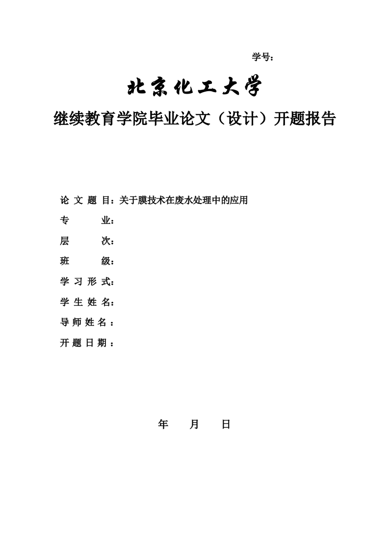 学号:北京化工大学继续教育学院毕业论文(设计)开题报告论文题目:关于膜技术在废水处理中的应用专业层次:班学习形式:学生姓名:导师姓名:开题日期:年月日目录二.选题的性质…三.论文选题的目的和理论实践意义四.与本选题相关的国内外研究现状,预计可能的研究突破和创新点...五.主要参考文献…六.分析研究的可行性、基本条件及能否取得实质性进展.....…七.选题的研究方法和进度安排1开题报告内容一.课题来源当今世界,无论是发达国家或者发展中国家,都无法情是化工行业的地位。从2003年下半年起头,我国工业化历程己步入重化工业阶段。化工行业已经成为我国的主导产业。我国是公认的化工大国,15年全球产量占比36%,绝大多数化工品产能都已居于世界第一。化工行业近几年获得了飞速的发展,为我国的经济发展做出了重大的贡献,但在环境保护方面仍然有所缺乏。在化工产品生产过程中,会产生非常多的有毒有害气体、废水、污水,污染空气,污染水资源,污染环境。根据有关部门的数据统计,我国每年化工企业废水排放总量为7200万吨,而每年化工的化学需氧排放量为7100万吨,氨氮每年的排放总量为490万吨,磷的排放量为270万吨山。据统计信息显示,化学工业产生的废水占中国总量的20-23%,废气占5-7%,废渣占8-10%②。造成化工行业污染的原因主要有:①思想落后。很多化工企业只顾及眼前利益,使用成本低、危害大的原料进行化工产品的生产。②管理落后。很多化工企业属于老企业,生产环境差,员工素质低,对化工产品的生产并不熟悉,因此很容易造成对原料的损耗,进而造成对环境的污染。③生产工艺落后。化工企业缺乏对技术的革新与进步,很多陈旧的工艺会导致在生产过程中的原料泄露等问题,对环境造成严重的危害。化工行业高速发展的同时也给我国的经济带来了不可估量的负面影响。我国的各级环保部门也在努力积极投入资金以整治目前面临的严峻环境问题,但是效果并没有很理想,并不能够从根本上解决环境问题。化工行业所导致的环境问题已经成为制约我国经济发展的一大因素。因此,我国的化工行业以及环保工艺还有较大的提升空间,是实现我国环境保护的重要行业之一,是节能减排的重要对象。本文就膜技术在化工废水中的应用进行探讨。二.选题的性质:1,理论研究(√)2