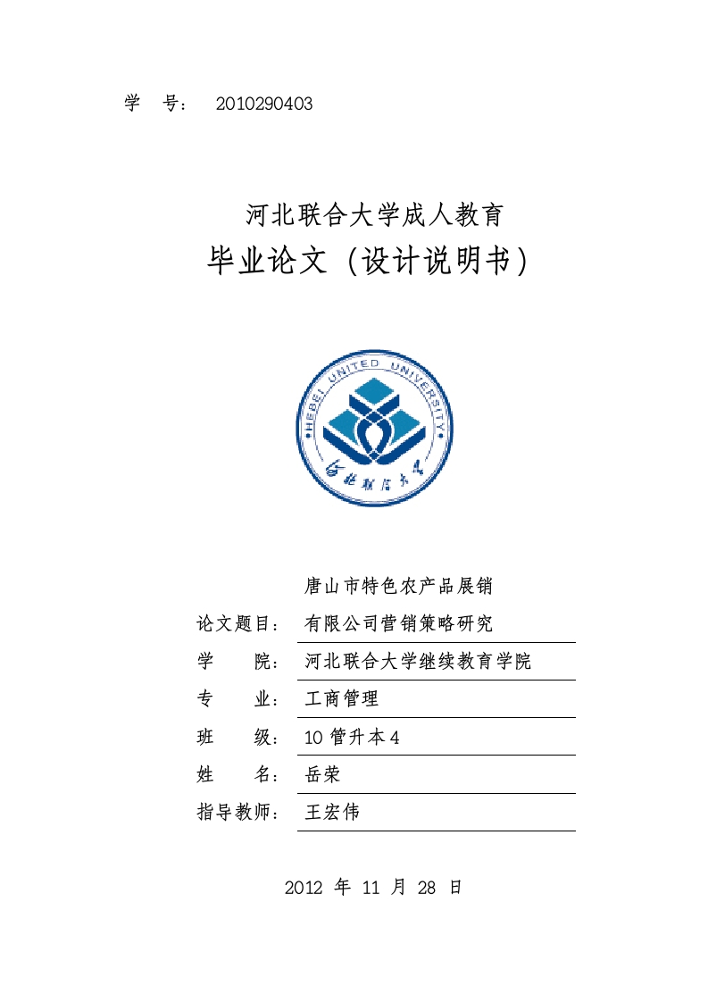 学号:2010290403河北联合大学成人教育毕业论文(设计说明书)唐山市特色农产品展销论文题目:有限公司营销策略研究学河北联合大学继续教育学院专业:工商管理班级:10管升本4姓名:岳荣指导教师:王宏伟2012年11月28日河北联合大学成人教育毕业论文(设计说明书)唐山市特色农产品展销有限公司营销策略研究学河北联合大学继续教育学院专业:工商管理班级:10管升本4姓名:岳荣指导教师:王宏伟2012年11月28日河北联合大学毕业论文课题申请表学院:继续教育学院2012年9月1日课题名称中油唐山公司非油品业务营销策略研究课题情教师姓名王宏伟职称讲师学位硕士课题来源自拟题目课题类别毕业论文毕业论文时间自2012年9月15日至12月22日主1、行业现状、竞争对手情况、企业内外部环境分析研2、唐山分公司非油管理现状究3、唐山分公司非油存在的问题内4、针对存在问题提出的解决方案容目利用科学的理论观点和系统分析的方法,研究企业非油营销管理中存在的问题,能和要够反映提出自己的见解和针对现有问题的解决办法。论文撰写符合河北联合大学毕业论文写作规范。特本文应理论联系实际,章节重点突出,具有清晰的实例分析,叙述通俗易懂,文字简练流畅。以营销管理为研究方向,具有一定理论和现实意义。成果形式研究论文成果价值具有一定的实践指导价值系主任或专家审题意见负责人签字:年月学院审批意见院长签字:年月日