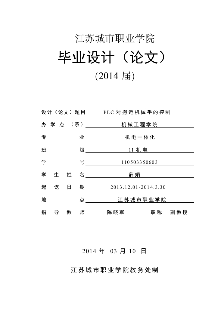 江苏城市职业学院毕业设计(论文)(2014届)设计(论文)题目PLC对搬运机械手的控制办学点(系)机械工程学院专业机电一体化班级11机电学号110503350603学生姓名薛娟起讫日期2013.12.01-2014.3.30地点江苏城市职业学院指导教师陈晓军职称副教授2014年03月10日江苏城市职业学院教务处制江苏城市职业学院毕业设计(论文)任务书学生姓名薛娟同课题人员指导教师陈晓军职称副教授工作单位南通办学点指导教师职称工作单位毕业设计(论文)题目工业机械手的工作原理课题简介本课题模拟物料搬运机械手,采用日本三菱公司的FX2N系列PLC,对机械手的上下、左右以及抓取运动进行控制。内容及要求通过PLC内部程序输出不同的信号,从而驱动外部线圈来控制电动机或电磁阀产生不同的动作,可实现机械手的精确定位:其动作过程包括:下降、夹紧、上升、慢进、快进、慢进、延时、下降、放松、上升、慢退、快退、慢退:其操作方式包括:回原位、手动、单步、单周期、连续:来满足生产中的各种操作要求了。解各个模块要实现的功能,从而实现各个模块的程序编辑。程序力求正确、简洁、可读性好,做好程序的注释工作。口严格按照分析、设计、实施的步骤,按时完成各阶段的任务。毕业设计(论文)进度计划起讫日期工作内容备注2013.12.06-2013.12.20查阅资料,了解题目。2013.12.21-2014.01.10收集资料,熟悉开发环境,学习开发工具。2014.01.11-2014.02.02详细实现搬运机械手PLC的各个部件的模块。2014.02.03-2014.02.20用PLC软件,实现对各个模块的整体控制。2014.02.21-2014.03.20撰写论文。2014.03.21-2014.03.30模块改进,修改论文,论文评阅、答辩准备。收集资料及主要参考文献序号名称作者出版单位1电气控制及PLC胡晓明机械工业出版社20062PLC技术与应用程周主福建科学技术出版社20043控制电气及应用李中年清华大学出版社2006通用变频器应用技术刘美俊福建科学技术出版社2004机械制造装备设计冯辛安机械工业出版社20056可编程序控制器应用技术廖常初重庆大学出版社2002机电一体化技术邱士安西安电子科技大学出版社指导教师签字陈晓军2014年3月10日指导小组组长签字年月日说明:任务书内容按实际情况填写,可根据本表格重新打印。