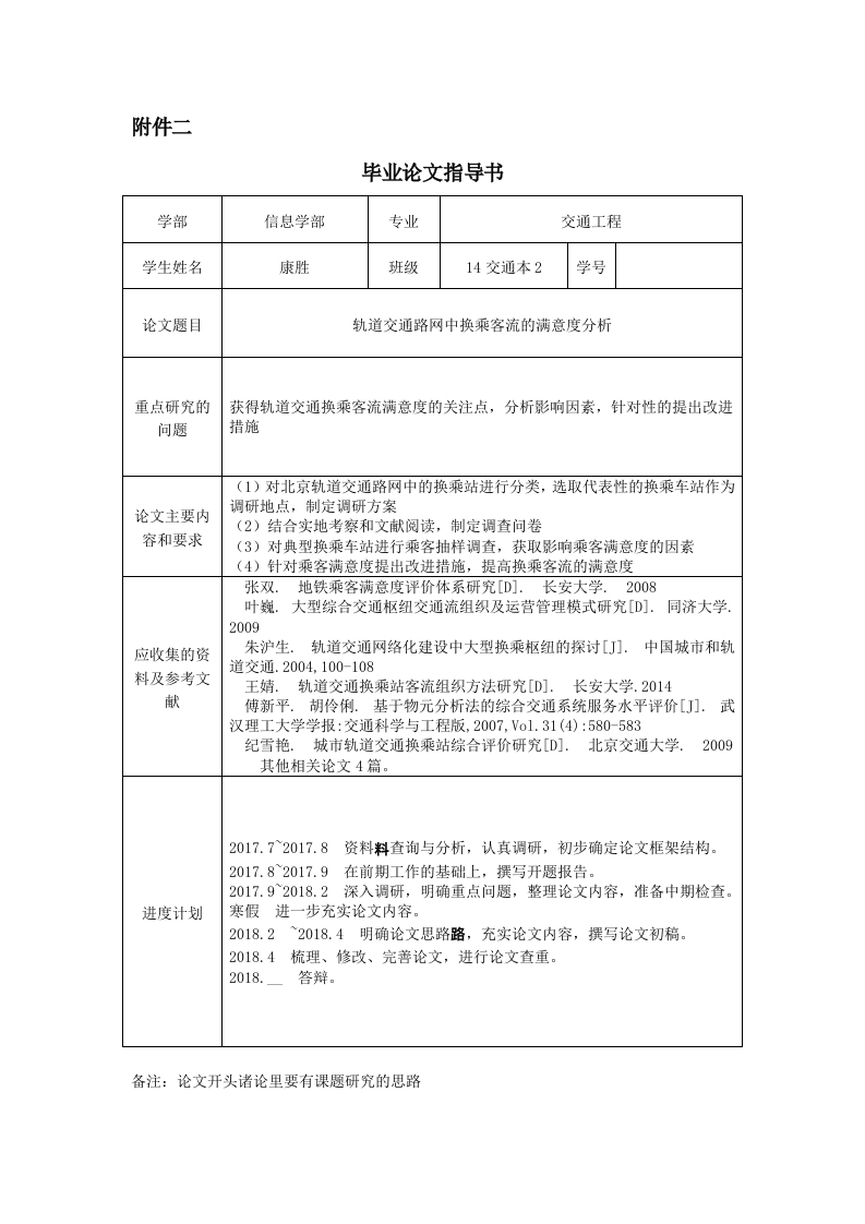 附件二毕业论文指导书学部信息学部专业交通工程学生姓名康胜班级14交通本2学号论文题目轨道交通路网中换乘客流的满意度分析重点研究的获得轨道交通换乘客流满意度的关注点,分析影响因素,针对性的提出改进问题措施(1)对北京轨道交通路网中的换乘站进行分类,选取代表性的换乘车站作为论文主要内调研地点,制定调研方案(2)结合实地考察和文献阅读,制定调查问卷容和要求(3)对典型换乘车站进行乘客抽样调查,获取影响乘客满意度的因素(4)针对乘客满意度提出改进措施,提高换乘客流的满意度张双.地铁乘客满意度评价体系研究[D].长安大学.2008叶巍.大型综合交通枢纽交通流组织及运营管理模式研究[D].同济大学.2009应收集的资朱沪生。轨道交通网络化建设中大型换乘枢纽的探讨[J刀.中国城市和轨道交通.2004,100-108料及参考文王婧.轨道交通换乘站客流组织方法研究[D].长安大学.2014献傅新平.胡伶俐.基于物元分析法的综合交通系统服务水平评价[J刀.武汉理工大学学报:交通科学与工程版,2007,Vo1.31(4):580-583纪雪艳.城市轨道交通换乘站综合评价研究[D].北京交通大学.2009其他相关论文4篇。2017.72017.8资料料查询与分析,认真调研,初步确定论文框架结构。2017.82017.9在前期工作的基础上,撰写开题报告。2017.92018.2深入调研,明确重点问题,整理论文内容,准备中期检查。进度计划寒假进一步充实论文内容。2018.22018.4明确论文思路路,充实论文内容,撰写论文初稿。2018.4梳理、修改、完善论文,进行论文查重。2018.答辩。备注:论文开头诸论里要有课题研究的思路