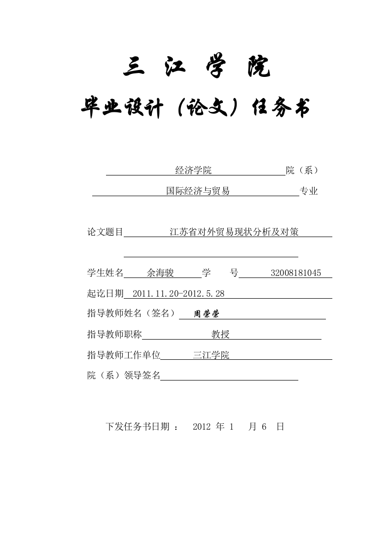 三江学院毕业设计(论文)任务书经济学院院(系)国际经济与贸易专业论文题目江苏省对外贸易现状分析及对策学生姓名余海骏学号32008181045起讫日期2011.11.20-2012.5.28指导教师姓名(签名)周荣荣指导教师职称教授指导教师工作单位三江学院院(系)领导签名下发任务书日期:2012年1月6日题目江苏省对外贸易现状及问题分析论文时间2011年11月20日至2012年5月28日课题的主“、课题研究的主要内容:要内容及阐述跨江苏省对外贸易现状、深刻剖析江苏对外贸易主要产业产品类型、要求(含结构、效益及江苏对外贸易存在的问题及原因,提出对外贸易发展的对策。技术要二、技术要求:求、图表运用定性定量分析方法、图表法及实证分析方法分析对外贸易存在问题及要求等)原因,提出针对性、切实有效政策、措施。实施方法与步骤、工作量要求:(一)针对论文选题,收集、查阅有关论文资料、翻译3000字符的外文资料,开展研究。课题的实(二)确定12篇以上参考文献。施的方法、步骤(三)在指导老师指导下,编写开题报告及论文任务书。并修改,开题。(四)及工作量撰写10000字以上论文初稿。(五)根据指导老师意见,修改论文初稿,完成二稿要求(六)做进一步修改,完成三、四稿。(七)在指导老师指导下,完善论文档案全套资料,作最后论文定稿,达到学士学位水平,参加论文答辩1.曹晓蕾:江苏省对外贸易的新发展、存在的问题及对策--江苏商论:2008-02-202.徐梁:焦微玲:江苏省外贸竞争力的现状分析--商场现代化:2006-10-203.牛树海:江苏省对外贸易现状及问题研究--价格月刊:2007-09-154.曹晓蕾:江苏省外贸竞争力的实证研究--价格月刊:2011-02-155.牛士华;杨频:江苏省外贸发展面临的主要问题及政策性措施--商业经济:2010-11-106.岳颗:解凤敏:金融危机对江苏省对外贸易的影响及对策探讨--特区经济:2010-06-25指定参考文献7.徐梁:焦微玲:江苏省外贸竞争力的提升对策建议--商场现代化:2006-11-018.徐佩倩:江苏对外贸易的新形势与对策研究--现代经济探讨:2003-07-309.王军:江苏省对外贸易差异分析--准阴工学院学报:2010-08-1510.张箴:江苏省对外贸易竞争力浅析--中国市场:2008-03-3111.蒋静晶:江苏省对外贸易结构发展特征研究-中国市场:2010-12-1212.汤文婷:江苏省对外贸易与经济增长实证研究--硅谷:2008-03-2313.Cao Yang:Yao Hongbing:Strategy of converting Jiangsu provinceAforeign-trade large province into a foreign-tradestrongprovince---CHINA'S FOREIGN TRADE:2005(21)14.Dong Jinglin:Study on action mechanism of regional finance anddifference of regional financial development in Jiangsu province-ChinaUniversity of mining and technology;2009(in Chinese)第1周-第3周(2011年11月21日--2011-年12月15日):在老师指导下,确定论文选题,查阅相关论文、文献资料。撰写开题报告,确定12篇以上参考文献第4周—第7周(2011年12月16日--2012年1月5日):毕业设计修改开题报告,确定开题,下达论文任务书,翻译3000字符以上相关英文文献(论文)进度计划资料,撰写论文初稿(以周为第8周一一第11周(2012年1月6日一2012年2月6日):单位)完成3000以上英文字符资料翻译及论文初稿第12周——第20周(2012年2月7日--2012年3月30日):在老师指导下,完成论文二稿及三稿,完善相关论文档案资料第21周一第28周(2011年4月21日--2011年5月27日):完成论文四稿及定稿,按照要求,完普论文建档材料,准备并参加答辩。备注注:表格栏高不够可自行增加。此表由指导教师在毕业设计(论文)工作开始前填写,每位毕业生两份,一份发给学生,一份交院(系)留存。