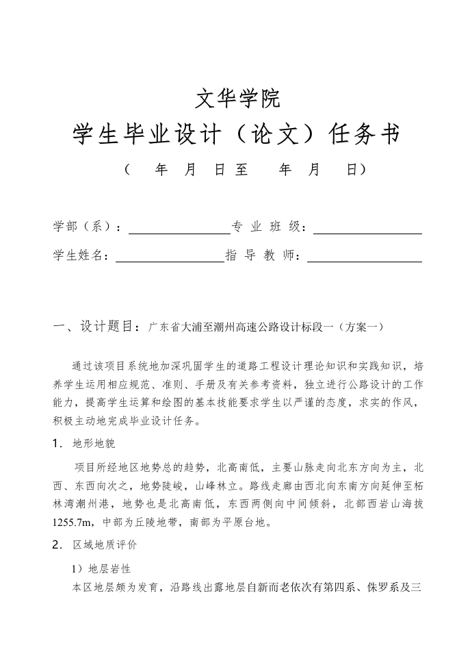 文华学院学生毕业设计(论文)任务书(年月日至年月日)学部(系):专业班级:学生姓名:指导教师:一、设计题目:广东省大浦至潮州高速公路设计标段一(方案一)通过该项目系统地加深巩固学生的道路工程设计理论知识和实践知识,培养学生运用相应规范、准则、手册及有关参考资料,独立进行公路设计的工作能力,提高学生运算和绘图的基本技能要求学生以严谨的态度,求实的作风,积极主动地完成毕业设计任务。1.地形地貌项目所经地区地势总的趋势,北高南低,主要山脉走向北东方向为主,北西、东西向次之,地势陡峻,山峰林立。路线走廊由西北向东南方向延伸至柘林湾潮州港,地势也是北高南低,东西两侧向中间倾斜,北部西岩山海拔1255.7m,中部为丘陵地带,南部为平原台地。2.区域地质评价1)地层岩性本区地层颇为发育,沿路线出露地层自新而老依次有第四系、侏罗系及三叠系地层,岩性较全。有砂岩、页岩、灰岩、粉砂岩、英安斑岩岩。路线区内未见活动性断裂发育,区域地质稳定性较好。2)地质构造路线区内未见活动性断裂发育,区域地质稳定性较好。3)水文地质区内地表水发育,沿线水系主要有黄冈河及其支流、水库(汤溪水库、双门官水库、新跃进水库、赤竹坪水库等)、沟溪、山塘等。区内地下水类型根据其形成自然条件,运行规律,赋存空间特征,并结合工程地质岩组,主要有松散岩类孔隙水,基岩裂隙水等。4)地震及区域稳定性:根据《中国地震动参数区划图》(GB18306-2001),本地区地震动峰值加速度为0.15g,对应地震设防烈度为7度。3.气象本项目区属于南亚热带季风气候,常年雨水充沛,无霜期长,春季潮湿,阴雨日多:初夏气温回升,冷暖多变,常有暴雨,盛夏虽高温而少酷暑,常受台风袭击:秋季凉爽干燥,天气晴朗,气温下降明显:冬无严寒,但有短期寒冷。年日照2000-2500小时,日照最短为3月份。年降雨量13001800毫米,多集中在49月份。年平均气温21℃~22℃,最低气温在0℃以上:最高气温36℃~40℃,多出现于7月中旬至8月初受太平洋副热带高压控制期间。4.交通量调查结果根据交通量调查数据,观测2020年的日平均交通量折算值为12000辆标准小客车/日。交通量年均增长率为8%,设计年限为20年。其中各种车型所占比例为:中货一解放CA39023+(0.1×学号后两位)%大货一日野KF300D6+(0.1×学号后两位)%大客一四平SPK615013+(0.1×学号尾后两位)%拖挂一五十铃EXR181L5+(0.1×学号尾后两位)%注:其余为小客及小货表1计算轴载后轴重后轴后轴轮后轴距序号车型前轴重(kN(kN)数组数(m)1解放CA3903570.151双轮组2日野KF300D40.75792双轮组<33四平SPK61503877.82双轮组4五十铃60100>3双轮组EXR181L二、毕业设计(论文)的主要内容(1)路线毕业设计采用纸上定线,起终点设计里程约6km,具体工作有:1.公路等级及其主要技术标准的论证与确定:2.路线平面设计:3.路线纵断面设计。(2)路基、路面1.路基横断面设计(2公里):2.路基超高设计(长度同平面);3.确定沿线路基取土、弃土位置;4.计算土石方数量并进行调配:5.确定防护工程的位置、结构类型及尺寸:6.路面结构及材料组成设计(做方案比选):7.确定路基路面排水系统的位置、结构类型及尺寸。