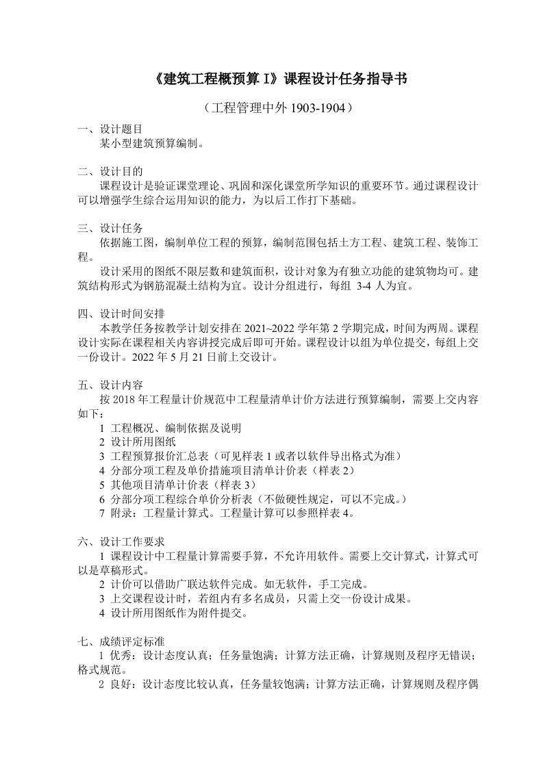 《建筑工程概预算I》课程设计任务指导书(工程管理中外1903-1904)一、设计题目某小型建筑预算编制。二、设计目的课程设计是验证课堂理论、巩固和深化课堂所学知识的重要环节。通过课程设计可以增强学生综合运用知识的能力,为以后工作打下基础。三、设计任务依据施工图,编制单位工程的预算,编制范围包括土方工程、建筑工程、装饰工程。设计采用的图纸不限层数和建筑面积,设计对象为有独立功能的建筑物均可。建筑结构形式为钢筋混凝土结构为宜。设计分组进行,每组34人为宜。四、设计时间安排本教学任务按教学计划安排在2021~2022学年第2学期完成,时间为两周。课程设计实际在课程相关内容讲授完成后即可开始。课程设计以组为单位提交,每组上交一份设计。2022年5月21日前上交设计。五、设计内容按2018年工程量计价规范中工程量清单计价方法进行预算编制,需要上交内容如下:1工程概况、编制依据及说明2设计所用图纸3工程预算报价汇总表(可见样表1或者以软件导出格式为准)4分部分项工程及单价措施项目清单计价表(样表2)5其他项目清单计价表(样表3)6分部分项工程综合单价分析表(不做硬性规定,可以不完成。)7附录:工程量计算式。工程量计算可以参照样表4。六、设计工作要求1课程设计中工程量计算需要手算,不允许用软件。需要上交计算式,计算式可以是草稿形式。2计价可以借助广联达软件完成。如无软件,手工完成。3上交课程设计时,若组内有多名成员,只需上交一份设计成果。4设计所用图纸作为附件提交。七、成绩评定标准1优秀:设计态度认真:任务量饱满:计算方法正确,计算规则及程序无错误:格式规范。2良好:设计态度比较认真,任务量较饱满:计算方法正确,计算规则及程序偶有非原则性的错误:格式比较规范。3中:设计态度比较认真,任务量较饱满:计算方法基本正确,计算规则及程序有少量错误:格式比较规范。4及格:设计态度尚算认真,任务量基本饱满:计算方法基本正确,计算规则及程序有错误:格式尚属规范。5不及格:设计态度不认真,未完成设计任务书要求:计算方法、计算规则及程序有原则性错误:格式混乱。八、主要参考资料[1]刘富勤.建筑工程概预算(第三版).武汉:武汉理工大学出版社,2018.8[2]学习通-建筑工程概预算课程-资料-GB50500-2013建设工程工程量清单计价规范[3]2018年湖北省定额共三册附录一:分组名单1丁颗慧赵英杰常巍馨2韩天宇李奕蒙殷世豪蔡思翔余练武3陈雨蝶何彦莅廖雪君4罗时宇于延柯李晓旭5韩贝林陶廷敬黄彦淞胡殿兵6刘海英周雨佳蔡欣王奕璇雷麒凡7王弋天张旭肖剑文李运涛8杨宇轩汪海婷刘静贤艾颀欣9龙俊皓张睿峤李子聪10宋庚吴潘彦奇张帅杨天浩11杨渝剑蔺今钊黄铭皓12杨汉邱宇喆许文龙沈家童13魏树才凌雨薇柯晓鼎侯凯升14黄玉欣任雪莹熊辰博