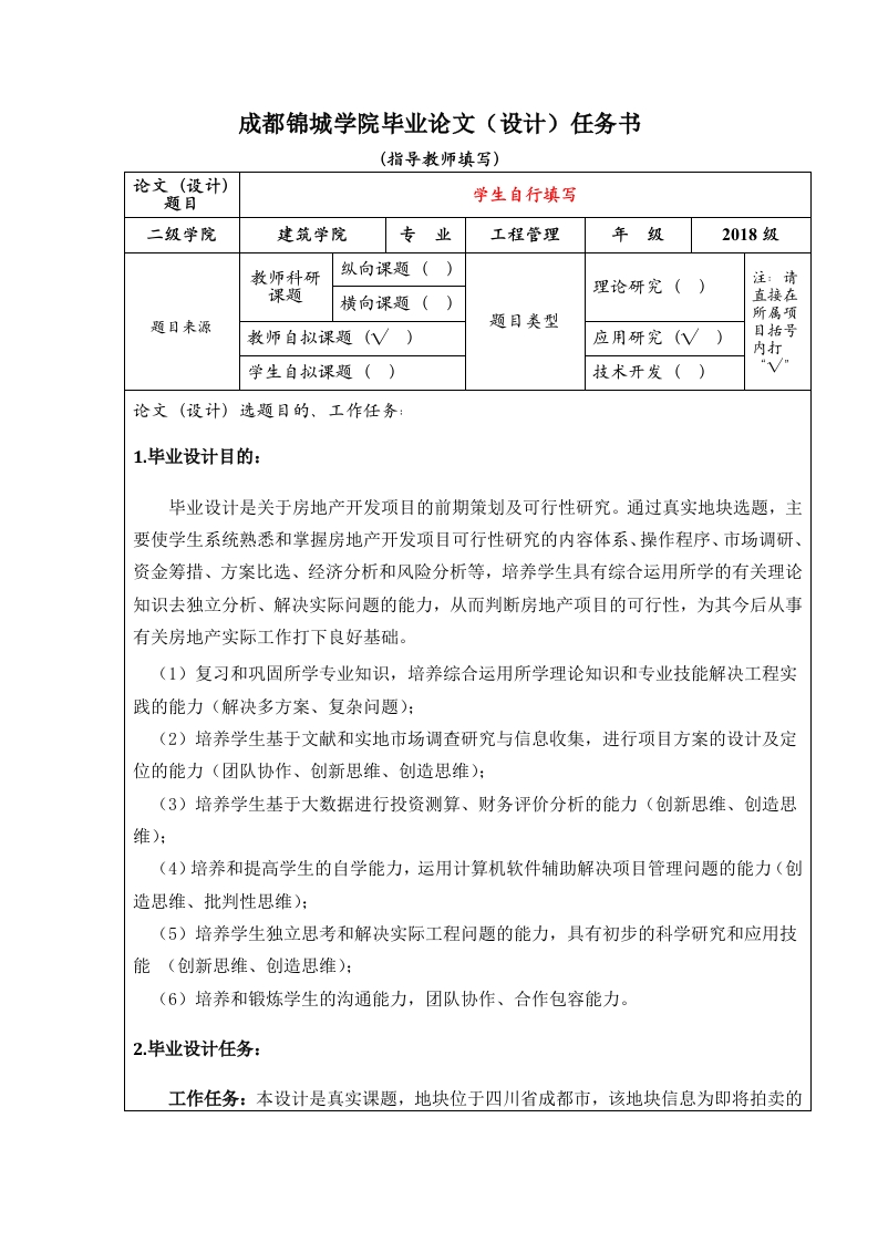 成都锦城学院毕业论文(设计)任务书(指导教师填写)论文(设计)题目学生自行填写二级学院建筑学院专业工程管理年级2018级纵向课题()注:请课题直接在题目来源题目类型所属项教师自拟课题(√)目括号内打学生自拟课题()技术开发()论文(设计)选题目的、工作任务:1.毕业设计目的:毕业设计是关于房地产开发项目的前期策划及可行性研究。通过真实地块选题,主要使学生系统熟悉和掌握房地产开发项目可行性研究的内容体系、操作程序、市场调研、资金筹措、方案比选、经济分析和风险分析等,培养学生具有综合运用所学的有关理论知识去独立分析、解决实际问题的能力,从而判断房地产项目的可行性,为其今后从事有关房地产实际工作打下良好基础。(1)复习和巩固所学专业知识,培养综合运用所学理论知识和专业技能解决工程实践的能力(解决多方案、复杂问题):(2)培养学生基于文献和实地市场调查研究与信息收集,进行项目方案的设计及定位的能力(团队协作、创新思维、创造思维):(3)培养学生基于大数据进行投资测算、财务评价分析的能力(创新思维、创造思(4)培养和提高学生的自学能力,运用计算机软件辅助解决项目管理问题的能力(创造思维、批判性思维):(5)培养学生独立思考和解决实际工程问题的能力,具有初步的科学研究和应用技能(创新思维、创造思维):(6)培养和锻炼学生的沟通能力,团队协作、合作包容能力。2.毕业设计任务:工作任务:本设计是真实课题,地块位于四川省成都市,该地块信息为即将拍卖的真实地块信息,涉及面广、难度较大,设计过程中应本着实事求是的态度,注重理论与实践相结合,积极主动地进行调查、预测、计算、分析和论证:设计内容中市场调查方案可由设计组共同讨论、分工调查,其他由个人独立完成:设计成果应体系完整、结构严谨、层次分明,观点概念表达准确、清晰,资料数据真实可靠、选用合适,方案设计切实可行、特色突出,各类计划安排合理,计算方法应用得当、结果正确,分析论证充分、有理有据,格式、图表和写作规范、统一。毕业设计成果由三部分构成,其中毕业设计和图纸装订一册,翻译原文+译文装订一册、设计说明装订一册。2.1毕业设计和图纸毕业设计正文内容关于房地产项目前期策划及可行性研究,不少于70页,正文中要求图表格式规范,财务报表表格按照最新财务报表格式进行绘制,计算部分必须用excel计算。①设计正文应具备下列基本表格:(要尽量列出清晰的基本报表和辅助报表)1)项目基础技术经济数据指标2)建筑总表与建筑一览表(每栋楼每户的面积列表,用于后来的销售收入的计算)3)项目总投资估算表及辅助报表4)可销售面积与销售计划表5)销售收入与经营税金及附加估算表6)投资计划与资金筹措表刀全部投资财务现金流量表8)资本金财务现金流量表9)资金来源与运用表10)损益表11)还本付息表12)敏感性分析表②要计算的项目技术经济指标有:1)静态指标:全部投资的投资利润率、全部投资的投资利税率、资本金投资利润率、资本金净利润率。2)动态指标:税前全部投资净现值、税后全部投资净现值、税前全部投资内部收益率、税后全部投资内部收益率、资本金税后投资内部收益率、资本金税后净现值、动态投资回收期。③附图要求上交选中方案的总平面图、BIM5D、具有代表性楼层的标准层平面图、户型图和施工进度计划图。A2号图纸,图要有标签栏和边框线,标准层平面图要有轴线、总平面图重点画出各楼的位置、绿化、景观等,并要有图例、指北针等,户型图突出功能分区,施工进度计划图采用横道图表示)。2.2翻译原文+译文找英文原刊,如EI或者SCI,近5年的外国作者,与工程管理相关的文章即可,如全过程咨询、BIM技术在项目管理应用、可行性研究、招投标、装配式建筑、绿色建筑等。保留原刊PDF版格式,附在翻译的后面。外文字数要在5000字以上,翻译成中文字数不少于3000汉字。2.3毕业设计说明书分析选题设计题目的意义,选题的背景、研究的现状、毕业设计采取的技术路线及内容,编制设计的依据,设计过程采用的方法、创新思路及体会,并对毕业设计做出分析总结,为走上工作岗位打下坚实基础。提交要求:有自己的观点及创新。以上文档格式要严格按照《成都锦城学院毕业论文(设计)模板(试行)确认版》和《成都锦城学院本科毕业论文(设计)工作实施细则(修订)》。(一起论文有文件下载)。目前资料收集情况(含指定参考资料)拟开发地块的出让信息、土地利用条件、规划设计条件,所在城市的总体规划和详细规划信息,地块的实地考察及周边环境调查,地块的竞争性楼盘信息收集,相关的设计编制依据、法律法规及规章制度、有关的技术标准、规范、参考资料等,国家颁布的有关项目评价的通用参数。相关参考资料部分如下:[1]《工程管理专业毕业设计指南》,知识产权出版社[2]刘晓启主编:《工程经济学》,中国建筑工业出版社:[3]中华人民共和国建设部发布:《房地产开发项目经济评价案例》,中国计划出版社[4]周小平.房地产投资分析[].北京:清华大学出版社,2011.[5]黄英,王海燕,王满良.房地产投资分析[.北京:清华大学出版社.2015[6]陈琳,谭建辉.房地产项目投资分析[0.北京:清华大学出版社.2015.[7]郑生钦.房地产开发投资与实务[们.北京:中国建筑工业出版社.2013.