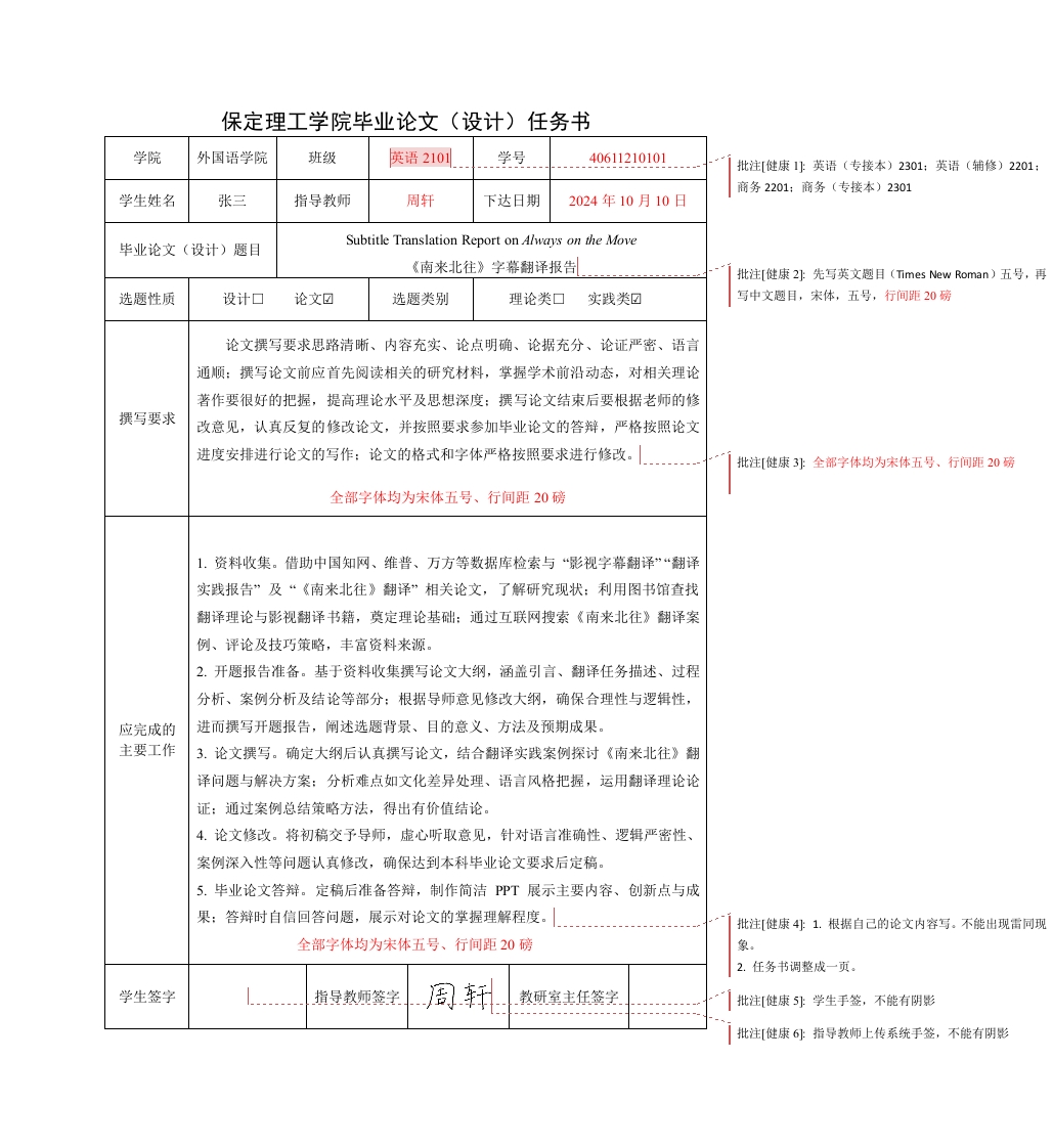 保定理工学院毕业论文(设计)任务书学院外国语学院班级英语2101学号40611210101批注[健康1小英语(专接本)2301:英语(辅修)2201:商务2201:商务(专接本)2301学生姓名张三指导教师周轩下达日期2024年10月10日毕业论文(设计)题目Subtitle Translation Report on Always on the Move《南来北往》字幕翻译报告批注[健康2沙先写英文趣目(Times New Roman)五号,再选题性质设计口论文☑选题类别理论类口实践类☑写中文趣目,宋体,五号,行间距20磅论文撰写要求思路清晰、内容充实、论点明确、论据充分、论证严密、语言通顺:撰写论文前应首先阅读相关的研究材料,掌握学术前沿动态,对相关理论著作要很好的把握,提高理论水平及思想深度:撰写论文结束后要根据老师的修撰写要求改意见,认真反复的修改论文,并按照要求参加毕业论文的答辩,严格按照论文进度安排进行论文的写作:论文的格式和字体严格按照要求进行修改。批注健康3)全部字体均为宋体五号、行间距20磅全部字体均为宋体五号、行间距20磅1.资料收集。借助中国知网、维普、万方等数据库检索与“影视字幕翻译”“翻译实践报告”及“《南来北往》翻译”相关论文,了解研究现状:利用图书馆查找翻译理论与影视翻译书籍,莫定理论基础:通过互联网搜索《南来北往》翻译案例、评论及技巧策略,丰富资料来源。2.开题报告准备。基于资料收集撰写论文大纲,涵盖引言、翻译任务描述、过程分析、案例分析及结论等部分:根据导师意见修改大纲,确保合理性与逻辑性,应完成的进而撰写开题报告,阐述选题背景、目的意义、方法及预期成果。主要工作3.论文撰写。确定大纲后认真撰写论文,结合翻译实践案例探讨《南来北往》翻译问题与解决方案:分析难点如文化差异处理、语言风格把握,运用翻译理论论证:通过案例总结策略方法,得出有价值结论。4.论文修改。将初稿交予导师,虚心听取意见,针对语言准确性、逻辑严密性、案例深入性等问题认真修改,确保达到本科毕业论文要求后定稿。5.毕业论文答辩。定稿后准备答辩,制作简洁PPT展示主要内容、创新点与成果:答辩时自信回答问题,展示对论文的掌握理解程度。批注[健康41.根据自己的论文内容写。不能出现雷同现全部字体均为宋体五号、行间距20磅象。2.任务书调整成一页。学生签字指导教师签字轩教研室主任签字批注[健康5学生手签,不能有阴影批注[健康6小指导教师上传系统手签,不能有阴影