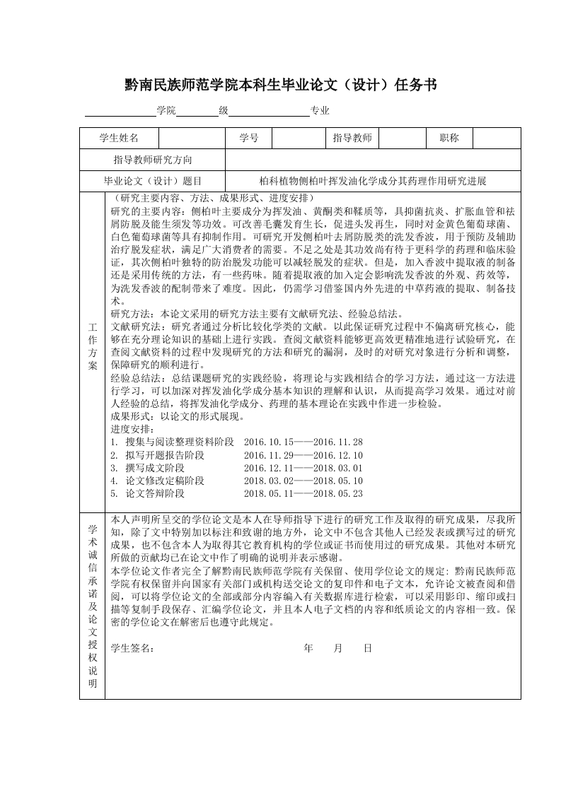 黔南民族师范学院本科生毕业论文(设计)任务书学院级专业学生姓名学号指导教师职称指导教师研究方向毕业论文(设计)题目柏科植物侧柏叶挥发油化学成分其药理作用研究进展(研究主要内容、方法、成果形式、进度安排)研究的主要内容:侧柏叶主要成分为挥发油、黄酮类和糅质等,具抑菌抗炎、扩胀血管和祛屑防脱及能生须发等功效。可改善毛囊发育生长,促进头发再生,同时对金黄色葡萄球菌、白色葡萄球菌等具有抑制作用。可研究开发侧柏叶去屑防脱类的洗发香波,用于预防及辅助治疗脱发症状,满足广大消费者的需要。不足之处是其功效尚有待于更科学的药理和临床验证,其次侧柏叶独特的防治脱发功能可以减轻脱发的症状。但是,加入香波中提取液的制备还是采用传统的方法,有一些药味。随着提取液的加入定会影响洗发香波的外观、药效等,为洗发香波的配制带来了难度。因此,仍需学习借鉴国内外先进的中草药液的提取、制备技术。研究方法:本论文采用的研究方法主要有文献研究法、经验总结法。工文献研究法:研究者通过分析比较化学类的文献。以此保证研究过程中不偏离研究核心,能作够在充分理论知识的基础上进行实践。查阅文献资料能够更高效更精准地进行试验研究,在方查阅文献资料的过程中发现研究的方法和研究的漏洞,及时的对研究对象进行分析和调整,案保障研究的顺利进行。经验总结法:总结课题研究的实践经验,将理论与实践相结合的学习方法,通过这一方法进行学习,可以加深对挥发油化学成分基本知识的理解和认识,从而提高学习效果。通过对前人经验的总结,将挥发油化学成分、药理的基本理论在实践中作进一步检验。成果形式:以论文的形式展现。进度安排:1.搜集与阅读整理资料阶段2016.10.15——2016.11.282.拟写开题报告阶段2016.11.292016.12.103.撰写成文阶段2016.12.11--2018.03.014.论文修改定稿阶段2018.03.02—2018.05.105.论文答辩阶段2018.05.11--2018.05.23本人声明所呈交的学位论文是本人在导师指导下进行的研究工作及取得的研究成果,尽我所学知,除了文中特别加以标注和致谢的地方外,论文中不包含其他人己经发表或撰写过的研究术成果,也不包含本人为取得其它教育机构的学位或证书而使用过的研究成果。其他对本研究所做的贡献均己在论文中作了明确的说明并表示感谢。信本学位论文作者完全了解黔南民族师范学院有关保留、使用学位论文的规定:黔南民族师范学院有权保留并向国家有关部门或机构送交论文的复印件和电子文本,允许论文被查阅和借诺阅,可以将学位论文的全部或部分内容编入有关数据库进行检索,可以采用影印、缩印或扫及描等复制手段保存、汇编学位论文,并且本人电子文档的内容和纸质论文的内容相一致。保论密的学位论文在解密后也遵守此规定。文授学生签名:年月日权说明指导教师意见:学院领导小组意见:签名:指导教师签名:年月日年月日填表说明:详见黔南民族师范学院毕业论文(设计)填表规范说明。