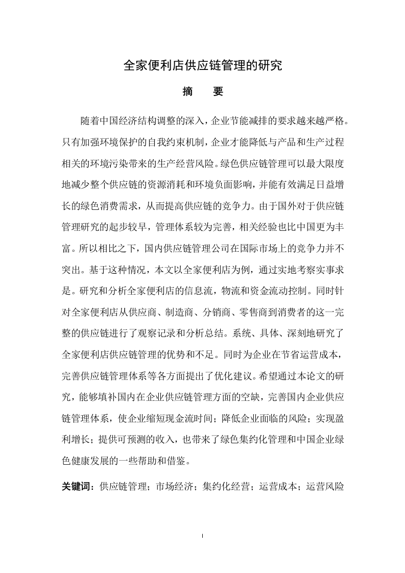 全家便利店供应链管理的研究摘要随着中国经济结构调整的深入,企业节能减排的要求越来越严格。只有加强环境保护的自我约束机制,企业才能降低与产品和生产过程相关的环境污染带来的生产经营风险。绿色供应链管理可以最大限度地减少整个供应链的资源消耗和环境负面影响,并能有效满足日益增长的绿色消费需求,从而提高供应链的竞争力。由于国外对于供应链管理研究的起步较早,管理体系较为完善,相关经验也比中国更为丰富。所以相比之下,国内供应链管理公司在国际市场上的竞争力并不突出。基于这种情况,本文以全家便利店为例,通过实地考察实事求是。研究和分析全家便利店的信息流,物流和资金流动控制。同时针对全家便利店从供应商、制造商、分销商、零售商到消费者的这一完整的供应链进行了观察记录和分析总结。系统、具体、深刻地研究了全家便利店供应链管理的优势和不足。同时为企业在节省运营成本,完善供应链管理体系等各方面提出了优化建议。希望通过本论文的研究,能够填补国内在企业供应链管理方面的空缺,完善国内企业供应链管理体系,使企业缩短现金流时间;降低企业面临的风险;实现盈利增长:提供可预测的收入,也带来了绿色集约化管理和中国企业绿色健康发展的一些帮助和借鉴。关键词:供应链管理:市场经济;集约化经营;运营成本;运营风险目录(一)研究背景(二)研究目的和意义11.研究意义(三)研究方法21.案例分析法..223.分析归纳法..233一、文献综述和相关理论(一)供应链相关文献与理论33(二)供应链管理相关理论..42.供应链形成的背景..53.供应链发展的历程...5(四)供应链管理基本策略66666二、全家便利店的现状...(一)企业的简介..7(三)与国内传统便利店差异三、全家便利店供应链管理模式..9(一)顾客需求管理系统..(三)商品物流系统..(四)软硬件基础支持系统..四、全家便利店供应链管理特色..·10101011五、全家便利店供应链管理的优点....11(一)24小时的营业时间.....11(二)拥有自主的食材加工厂..(三)拥有完善的配送能力.....12(五)实现电商合作,支付方式简易.…12(一)加盟店的经营形式,不利于管理..12(二)没有专业的培训,员工执行力不足....1213(一)全家便利店供应链管理不足的原因…13(三)全家便利店供应链管理的优化意见.……141.从商品与供应商的角度.…