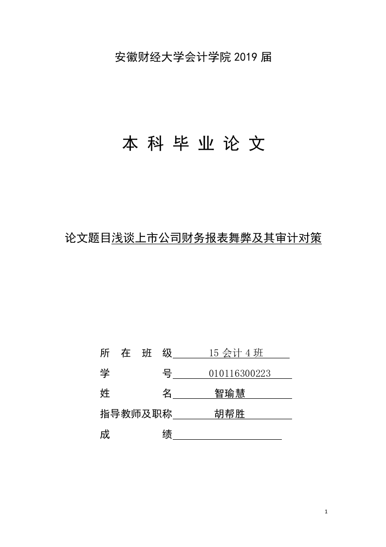 安徽财经大学会计学院2019届本科毕业论文论文题目浅谈上市公司财务报表舞弊及其审计对策所在班级15会计4班学号010116300223姓名智瑜慧指导教师及职称胡帮胜成绩1浅谈上市公司财务报表舞弊及其审计对策班级:15会计(4)班姓名:智瑜慧学号:010116300223指导老师:胡帮胜【摘要】:近年来,财务报告舞弊的这一问题表现的越来越严重,尤其是表现在上市公司财务报告舞弊上表现的极其明显,数额极其巨大,所以说财务报表的舞弊己经成为了现在面临的一个重大的问题,如果己经发生了财务报表舞弊,将会产生不好的影响还会造成社会诚信危机,审计和会计的职业形象会在财务报告舞弊的过程中产生了很大的影响。此篇文章针对财务舞弊的特点说明了上市公司财务报表舞弊的定义、特征及危害,联系现象表述了五种舞弊动因,主要是从三大报表入手。针对舞弊动因和手段提出了明确了目标,强化理念,规计程序,加强对财务报表舞弊的防范等切实可行的审计对策。本文采用规范的方法,并结合理论与实践,研究上市公司和相关的审计对策的财务报表欺诈行为。部分上市企业的舞弊行为我们需要对他的动机进行分析,并且了解它的造假手段,从而我们才能有依据的去查找这种欺诈行为,这主要是为了帮助我们根据此行为来制定更加合理的措施去应对。【关键词】:上市公司财务报表舞弊激励审计对策2目录、前言…二、财务报表舞弊的界定…1(一)管理舞弊和雇员舞弊……2(二)财务报表舞弊和侵占资产舞弊……2(三)组织舞弊和职务舞弊…3三、财务报表舞弊的成因…(一)展现公司形象的重要舞台是相关二级市场炒作证券市场…4(二)发行价格的变动…4(三)继续融资的需求…(四)关于退市问题…四、财务报表舞弊的手段分析…4(一)虚增销售收入…(二)任意递延费用……5(三)企业进行失当的会计政策和会计估计…5(四)关联交易…(五)隐瞒已经暴露的费用……5五、财务报表舞弊的审计对策…5(一)财务报表审计中关注舞弊的基本思路…5(二)财务报表舞弊的审计策略……5六、总结…参考文献……8