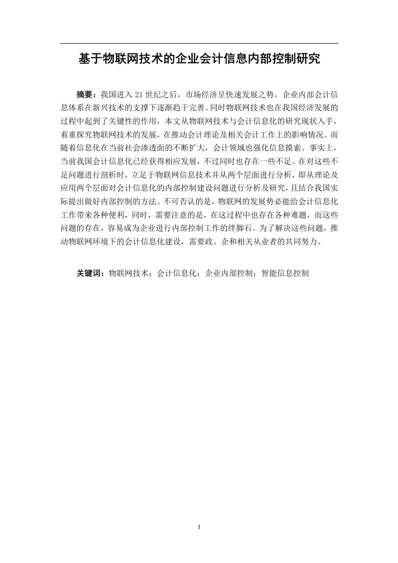 基于物联网技术的企业会计信息内部控制研究摘要:我国进入21世纪之后,市场经济呈快速发展之势,企业内部会计信息体系在新兴技术的支撑下逐渐趋于完善。同时物联网技术也在我国经济发展的过程中起到了关键性的作用,本文从物联网技术与会计信息化的研究现状入手,着重探究物联网技术的发展,在推动会计理论及相关会计工作上的影响情况。而随着信息化在当前社会渗透面的不断扩大,会计领域也强化信息摸索。事实上,当前我国会计信息化已经获得相应发展,不过同时也存在一些不足。在对这些不足问题进行剖析时,立足于物联网信息技术并从两个层面进行分析,即从理论及应用两个层面对会计信息化的内部控制建设问题进行分析及研究,且结合我国实际提出做好内部控制的方法。不可否认的是,物联网的发展势必能给会计信息化工作带来各种便利,同时,需要注意的是,在这过程中也存在各种难题,而这些问题的存在,容易成为企业进行内部控制工作的绊脚石。为了解决这些问题,推动物联网环境下的会计信息化建设,需要政、企和相关从业者的共同努力。关键词:物联网技术:会计信息化:企业内部控制:智能信息控制Research on the Internal Control of EnterpriseAccounting Information Based on Internet of ThingsTechnologyABSTRACT With China's entry into the twenty-first Century,the marketeconomy began to grow rapidly,and the internal accounting information system hasbeen improved accordingly.At the same time,the Internet of things technology hasplayed a key role in the process of China's economic development.Through studyingthe status of information technology and accounting information,This paper analysisthe impact of the computer technology and the Internet of things technology on thedevelopment of accounting theory and accounting work thus to explore the influenceof Internet technology on the accounting work and accounting information.At thesame time,combined with the practical work of the accounting information ourcountry,this paper analyzes the development and short comings of the currentaccounting information,combined with the Internet of things,through the twoaspects of theory and application,the author studies the idea and goal of constructionof accounting information under Internet of things technology,trying to provideguidelines for the object the construction of accounting information under theenvironment of network.On this basis,to build the inventory management,fixed assetmanagement system and the design the accounting information system of internalcontrol system as an example,this paper explore to construct the accountinginformation under the environment of Internet of things.Although the development ofthe Internet of things provides a powerful technical support to promote the work ofaccounting information,accounting information construction under the Internet ofthings environment has faced many problems,such as the own problems of thedevelopment of the Internet of things the construction of accounting information.Tosolve these problems and push the construction of accounting information,we need towork together with the government,enterprises and the accounting workers.Key Words:Internet of Things Technology:Accounting InformationEnterprise internal control;Intelligent information control目录IAbstract目录III一物联网基本理论概述1(一)物联网的概念1(二)物联网体系架构2(三)物联网的特征3二物联网对企业会计信息内部控制的影响4(一)会计信息化的内涵4(二)我国会计信息化的现状4(三)物联网对内部会计环境的影响5三物联网下企业会计信息内部控制存在问题6(一)信息控制:企业内部控制中经常被忽视6(二)信息控制在企业内部控制中的重要性不容忽视7(三)信息断层:不利于传统经济下进行企业内部控制的建设9四解决物联网下企业会计信息内部控制存在问题的对策建议9(一)高新技术的设备是受控于信息的9(二)物联网的感知层、网络层离不开信息的集成9(三)智能信息控制:物联网下企业内部控制的核心10(四)提升信息控制的智能水平10五研究展望11(一)综合利用海量数据11(二)建立分散协调机制11(三)发挥智能通信作用11参考文献13