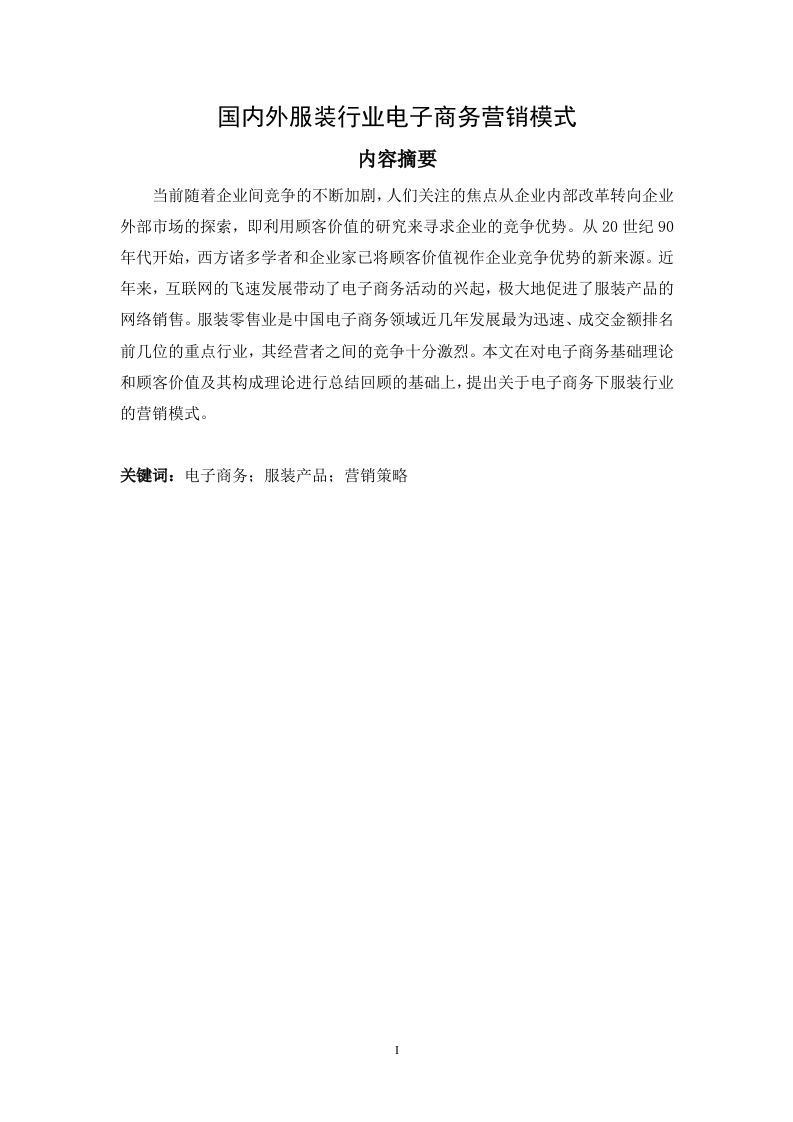 国内外服装行业电子商务营销模式内容摘要当前随着企业间竞争的不断加剧,人们关注的焦点从企业内部改革转向企业外部市场的探索,即利用顾客价值的研究来寻求企业的竞争优势。从20世纪90年代开始,西方诸多学者和企业家已将顾客价值视作企业竞争优势的新来源。近年来,互联网的飞速发展带动了电子商务活动的兴起,极大地促进了服装产品的网络销售。服装零售业是中国电子商务领域近几年发展最为迅速、成交金额排名前几位的重点行业,其经营者之间的竞争十分激烈。本文在对电子商务基础理论和顾客价值及其构成理论进行总结回顾的基础上,提出关于电子商务下服装行业的营销模式。关键词:电子商务:服装产品:营销策略目录内容摘要1一、电子商务及市场营销概述111、电子商务的概念...2、电子商务模式的划分21、市场营销的概念...32、营销与销售的区别.....3二、服装产品网络销售概况.…3(二)服装产品网络销售的优势..5三、我国服装企业网络营销现状及国外成功案例分析·6(一)中国服装企业网络营销现状.·(二)国外服装企业网络营销成功案例分析...7710引言近年来,信息技术的发展使互联网在中国得到广泛普及。随着网民人数的增长和网络购物机制的完善,参与电子商务的消费者人群日益扩大。根据中国互联网络信息中心发布的《第27次中国互联网络发展状况统计报告》显示,截至2010年12月,中国参与网络购物的人数达1.61亿人,用户增长48.6%,增幅在各类网络应用中居首位。随着网民对于网络使用的成熟化以及相关网络购物服务的优化,未来参与网络购物的中国消费者数量可能会产生较大幅度的增长。在快速发展的网购市场中,消费者对于服装类产品尤为青睐。据艾瑞统计数据显示:服装作为网络购物交易额最大的商品品类,在网购用户中的渗透率持续高涨,预计到2012年服装网购消费者占网购用户总数的比重将突破80%。一、电子商务及市场营销概述(一)电子商务概述21世纪,人类步入数字化时代,电子商务改变了传统的、物化的营销模式。随着网络技术的日渐成熟、消费者个性化需求和消费主动性的增强,越来越多的企业认识到仅以产品质量、功能和价格的差异化来占领市场变得愈加困难。因此,通过互联网为顾客提供优于竞争对手的顾客价值,己成为网络市场中企业竞争和发展的基础。1、电子商务的概念电子商务是一个随着诸多学者的探索研究而不断发展着的概念,目前还没有一个统一的定义。因所处地位和对电子商务活动的参与程度不同,一些机构、企业和学者对电子商务做出了多种解释,本文对两个较具代表性的概念进行如下整2002年,世界贸易组织(WT0)在有关电子商务的专题研究报告中对电子商务的定义是“电子商务就是通过电信网络进行的生产、营销、销售和流通等活动。它不仅指基于Internet上的交易,而且指所有利用电子信息技术来解决问题、降低成本、增加价值和创造商机的商务活动。”电子商务研究专家李琪教授在其专著《中国电子商务》一书中指出:“客观上存在着两类或三类依据内在要素不同而对电子商务的定义。第一,广义的电子商务定义,是指电子工具在商务活动中的应用。电子工具包括从初级的电报、电