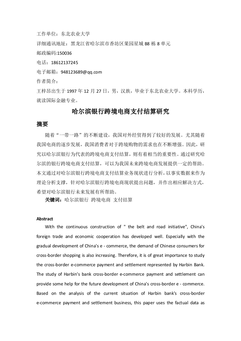 工作单位:东北农业大学详细通讯地址:黑龙江省哈尔滨市香坊区果园星城B8栋8单元邮政编码:150036电话:18612137245电子邮箱:948123689@qq.c0m作者简介:王梓昂出生于1997年12月27日,男,汉族,毕业于东北农业大学。本科学历,就读国际金融专业。哈尔滨银行跨境电商支付结算研究摘要随着“一带一路”的不断建设,我国对外经贸得到了较好的发展。尤其随着我国电商的逐步发展,我国消费者对于跨境购物的需求也在不断增强。因此,研究以哈尔滨银行为代表的跨境电商支付结算,则有着相当的重要性。通过研究哈尔滨的银行跨境电商支付结算,可以为我国未来跨境电商发展提供一定的帮助。本文通过对哈尔滨银行跨境电商支付结算业务现状进行分析,以事实数据来作为理论分析支撑,针对哈尔滨银行跨境电商现状提出问题,并作出相应解决方式,希望对哈尔滨银行未来发展有所帮助。关键词:哈尔滨银行跨境电商支付结算AbstractWith the continuous construction of the belt and road initiative",China'sforeign trade and economic cooperation has developed well.Especially with thegradual development of China's e-commerce,the demand of Chinese consumers forcross-border shopping is also increasing.Therefore,it is of great importance to studythe cross-border e-commerce payment and settlement represented by Harbin Bank.The study of Harbin's bank cross-border e-commerce payment and settlement canprovide some help for the future development of China's cross-border e-commerce.Based on the analysis of the current situation of Harbin bank's cross-bordere-commerce payment and settlement business,this paper uses the factual data astheoretical analysis support,and puts forward problems and corresponding solutionsaiming at the current situation of Harbin bank's cross-border e-commerce,hopingto be helpful for the future development of Harbin bank.Keyword:Harbin Bank Cross-border E-commerce Payment and Settlement一、前言电商的发展是我国东北经济振兴计划中不可缺少的一环。无论是从交通运输,国际地位亦或者消费市场等方面,东北地区的跨境电商运营都有着较好的发展前景。跨境电商离不开的是支付结算的渠道,而哈尔滨银行是在东北地区影响最大的商业银行之一。在国内外对于哈尔滨银行跨境电商研究有限的情况下,展开进一步的研究有着相当的必要性。二、研究现状近年来由于全球范围内的跨境消费力稳增,国内外学者对于电商跨境支付这一方面进行了较为深刻的分析。张彤彤,谷春晓(2018)在《黑龙江省外贸面临的新形势、新格局、新挑战、新机遇与对策建议》1一文中着重强调了黑龙江发展跨境外贸以及与电商时代结合的需求,并从交流平台的重要性层面说明了跨境电商中结算支付的决定性作用。赵峥嵘,林斌,白宇航(2016)则在《中国(杭州)跨境电子商务综试区的互联网金融支持研究》2一文中以杭州为案例,总结了互联网金融对于电商跨境发展的相关影响。TuY,Shangguan JZ(2018)在《Cross-Border E-Commerce:A New Driver of Global Trade)》3一文中则从跨境电商对于地区以及国家发展的积极意义方面入手,讨论了组成电商跨境支付平台的重要性。三、哈尔滨银行跨境电商1张彤彤,谷春晓.黑龙江省外贸面临的新形势、新格局、新挑战、新机遇与对策建议U].对外经贸,2018,No.286(04):27-30.z赵峥嵘林斌,白宇航,tal.中国(杭州)跨境电子商务综试区的互联网金融支持研究小.浙江金融,2016(3):10-16.Tu Y,Shangguan J Z.Cross-Border E-Commerce:A New Driver of Global Trade[J].2018.(一)跨境电商支付结算概述跨境电商支付结算是一个复合名词,是由跨境电商和支付结算所组成。在跨境电商的运营过程之中,涉及到一个国家之间货币兑换的问题。因此,跨境电商在支付的过程之中,需要经过第三方来进行货币之间的转换。跨境电商支付结算,是跨境电商运营活动中不可缺少的部分。(二)哈尔滨银行跨境电商支付业务的发展现状根据新华网以及人民网所公示的数据来看,哈尔滨银行无论从业务量还是业务类型上都有一定的优势。从业务量上来看,哈尔滨银行2018年度跨境支付结算量已经突破47亿元人民币。截止到2018年12月,哈尔滨银行商户存量已经超过2100家,对公日均存款4800余万元。从业务类型上来看,哈尔滨银行的跨境电商平台已经指出60余种货币,20余种跨境结算方式。中俄跨境电商在线支付平台接入18种俄罗斯主流跨境支付方式,结算时间由10天缩短至3天内,结算金额累计超过40亿元人民币。总的来看,哈尔滨银行在跨境电商支付方面发展的相对较好。四、哈尔滨银行跨境电商支付结算存在的问题(一)客户群体薄弱哈尔滨银行的客户群体薄弱主要表现在还款能力方面:根据新浪财经以及哈尔滨银行财报公示来看,截至2017年,哈尔滨银行不良贷款余额为40.37亿元,较上年末增加9.5亿元:不良贷款率为1.70%,较上年末上升0.17个百分点:贷款减值损失准备率为2.84%,较上年末上升0.29个百分点。哈尔滨银行表示,主要由于新常态下经济增速放缓,产业结构调整继续深化,部分借贷人持续承压,资金链普遍紧张,偿债能力下降。而哈尔滨银行在跨境电商运营的过程之中,主要面向的客户群体都属于小微企业、个体等。这些客户群体自身债偿能力相对有限,因此造成了哈尔滨银行客户群体的薄弱。如图1-1所示,在五大行不良贷款率逐渐下降的情况下,哈尔滨银行不良贷款率的上升反映出了客户群体的薄弱。
