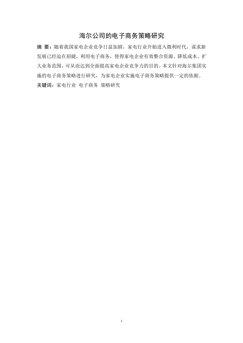 海尔公司的电子商务策略研究摘要:随着我国家电企业竞争日益加剧,家电行业开始进入微利时代,谋求新发展已经迫在眉睫,利用电子商务,使得家电企业有效整合资源、降低成本、扩大业务范围,可从而达到全面提高家电企业竞争力的目的。本文针对海尔集团实施的电子商务策略进行研究,为家电企业实施电子商务策略提供一定的依据。关键词:家电行业电子商务策略研究1目录一、引言…3二、海尔电子商务策略分析31搭建海尔网上商城.32.企业内部信息化........33.开设淘宝特许店与零售网站合作经营4.与网站联盟合作45.其他方式….4三、海尔电子商务经营的经验、体会·4四、海尔的电子商务对我们的启示..51.自己搭建电子商务平台…52.与B2C或B2B平台合作的方式66参考文献:72网络经济时代的到来,企业如何发展,是一个崭新而迫切的的问题。1999年达沃斯“世界经济论坛”提出了企业内部组织适应外部变化,全球知名品牌的建立、网上销售体系的建立”三条原则。今年的达沃斯会议又提出了“人类在新世纪将面临网络革命和基因革命的观点,对应于这种新趋势,海尔从1999年4月就开始了三个方向的转移。第一是管理方向的转移(从直线职能性组织结构向业务流程再造的市场链转移):第二是市场方向的转移(从国内市场向国外市场转移):第三是产业的转移(从制造业向服务业转移)。这些都为海尔开展电子商务莫定了必要的基础。进军电子商务是海尔国际化战略的必由之路。国际化是海尔目前一个重要发展战略。而电子商务是全球经济一体化的产物,所以,我们必须要进入,而且要进去就得做好,没有回头路。中国企业如果在网上再没有拓展,传统业务与网络挂不上钩,在网络经济时代就没有生存权。在由网络搭建的全球市场竞争平台上,企业的优劣势被无情的放大,因为新经济时代下,企业就是在(信息)高速公路上行驶的车辆,车况好的车,能够在信息高速公路上发挥优势,而破旧的车,即使在高速公路上,也只有被远远抛在后面的结局。海尔集团是世界第四大白色家电制造商、中国最具价值品牌、中国购买者满意度第一品牌。海尔在全球30多个国家建立本土化的设计中心、制造基地和贸易公司,全球员工总数超过5万人,已发展成为大规摸的跨国企业集团,2007年海尔集团实现全球营业额1180亿元。海尔集团自2000年成立电子商务公司并发布电子商务网站,经过8年的发展,网上销售额己数亿元,年均保持50%以上速度增长。海尔集团从2008年7月开始了以互联网、电话网、电视网三网融合的海尔电子商务升级战略(海尔称为“网单项目)。二、海尔电子商务策略分析1.搭建海尔网上商城2000年4月18日海尔集团的BtoC网站开始试运行。由于其知名品牌的强大吸引力,吸引了大量的上网者,由于其拥有全国电话服务中心30多个,营销网点10000多个,早己搭建起完善的销售网络,可进行先货后就服务,对于在线订购的产品,海尔送货上门的时间,中等以上城市2天即可到货,一般城市5天到货,其他边远县市也只需7天就能拿到货,由于其与建设银行的全面合作,基本解决了海尔电子商务的支付问题。经过8年发展积累了丰富的经验,在2008年改版后,强化了网站导购功能,完善了网站分类树,新加组合搜索功能,提供优质的客户服务,良好的导购功能,不断满足消费者的体验,并强调便捷、快速、省钱,提供多种支付手段。海尔的电子商务为什么魅力四射?用户为什么会有如此大的热情,可以从以下两方面略窥一二。①自己设计艺术化冰箱有些用户是艺术家或者品位较高,他们有自己制作冰箱样式的需求,海尔恰恰可以满足这些用户的需求,在海尔官网上有“用户定制”模块,可以设计一款自己的冰箱,这样大大的提高了销售量。②在网上订电器,方便海尔针对有些地区买电器不方便,便利用网络进行购买,随后海尔负责产品的运输到家服务,大大的提高了销售量。2.企业内部信息化海尔曾说过“我们不是为了概念和题材的炒作,而是要进入一体化的世界经济”,为此