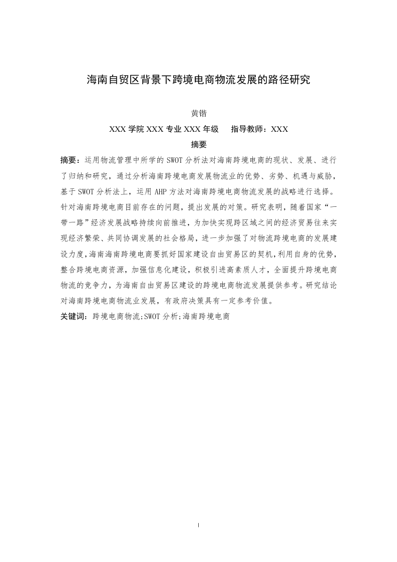海南自贸区背景下跨境电商物流发展的路径研究黄锴XXX学院XXX专业XXX年级指导教师:XXX摘要摘要:运用物流管理中所学的SW0T分析法对海南跨境电商的现状、发展、进行了归纳和研究,通过分析海南跨境电商发展物流业的优势、劣势、机遇与威胁,基于SWOT分析法上,运用AHP方法对海南跨境电商物流发展的战略进行选择。针对海南跨境电商目前存在的问题,提出发展的对策。研究表明,随着国家“一带一路”经济发展战略持续向前推进,为加快实现跨区域之间的经济贸易往来实现经济繁荣、共同协调发展的社会格局,进一步加强了对物流跨境电商的发展建设力度,海南海南跨境电商要抓好国家建设自由贸易区的契机,利用自身的优势,整合跨境电商资源,加强信息化建设,积极引进高素质人才,全面提升跨境电商物流的竞争力,为海南自由贸易区建设的跨境电商物流发展提供参考。研究结论对海南跨境电商物流业发展,有政府决策具有一定参考价值。关键词:跨境电商物流:SWOT分析:海南跨境电商Research on the strategic development of haikou port logistics underthe background of hainan free trade zoneHuang kaiXXX XXX Grade XXX Instructor:XXXABSTRACTABSTRACT:By using the SWOT analysis method learned in logistics management,this paper sums up and studies the current situation,development,opportunities andthreats of Haikou Port.Based on the SWOT analysis method,AHP method is used toselect the strategy of Haikou Port logistics development.In view of the existingproblems of Haikou Port,this paper puts forward the development countermeasures.The research shows that one of the "one belt,one road"economic developmentstrategy continues to move forward.In order to accelerate the realization of theeconomic pattern of economic and trade development across the region,the economicstructure and the coordinated development of Hainan will be strengthened.Thedevelopment and construction of logistics ports will be further strengthened.Haikouport should take the opportunity to build a free trade area and integrate its port with itsown advantages.Resources,strengthen information construction,actively introducehigh-quality talents,comprehensively enhance the competitiveness of port logistics,and provide reference for the development of port logistics in the construction ofHainan free trade zone.The conclusion of the study has certain reference value for thedevelopment of Haikou Port Logistics Industry and government decision-making.Keywords:Port Logistics,Hainan Free Trade Zone,SWOT Analysis,Haikou Port目录摘要…ABSTRACT........第1章绪论…1.1研究背景与意义…11.1.1选题背景…11.1.2研究意义1.2国内外研究现状.…1.2.1国外研究现状…1.2.2国内相关研究21.3研究内容…1.4研究方法.…3第2章基本理论概述2.1跨境电商物流相关概论.…2.1.1跨境电商物流的概念…2.1.2跨境电商物流的功能…2.2自贸区相关概论…2.2.1自贸区的概述…52.2.2自贸区的特征和职能.…52.2.3我国自由贸易区的发展情况…6第3章海南跨境电商物流发展现状…3.1跨境电商物流发展现状…63.2“四方五港”格局基本形成,产业规模逐步扩大…3.3以“临港工业区”产业集聚为支撑,跨境电商物流区域性分散.8第4章海南跨境电商物流业的SW0T分析…94.1海南跨境电商物流业的优势…94.1.1地理位置优越…94.13建设跨境电商成本占据绝对优势9